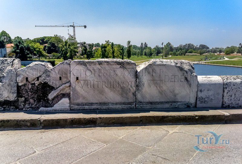 Мост Тиберия - одна из главных достопримечательностей и символ итальянского города Римини, расположен в центре города, в 10 минутах ходьбы от площади Ковур. Строительство моста через реку Мареккья было начато в 14 году нашей эры при императоре Октавиане Августе и завершено в 21 году, во время правления императора Тиберия. Мост связал две консульские дороги, построенные ещё в III-II веках до нашей эры - Эмилиеву дорогу (via Emilia) и Попилиеву дорогу (via Popilia-Annia), которые соединяли северные территории Апеннинского полуострова с центральными регионами Римской империи. Проект моста Тиберия был разработан на основе принципов строительства гидротехнических сооружений, изложенных гениальным древнеримским архитектором и механиком Витрувием в своём знаменитом трактате "Десять книг об архитектуре". Мост Тиберия представляет собой конструкцию из пяти полукруглых арок, установленных на мощных опорах. Размер арок увеличивается от края к центру моста, где и расположена самая большая арка. Длина моста - 62 метра, ширина - чуть более 8,5 метров, арочные пролёты имеют длину около 8 метров у берега и 10,5 метров - в центре. Выполнен мост Тиберия из истрийского камня, выложенного массивными прямоугольными и квадратными блоками. Прочность мосту обеспечил и используемый древними римлянами связывающий раствор, состоящий из смеси вулканического пепла с известью, не уступающий в прочности современному бетону. Конструкция моста отличается простотой и строгостью, в качестве декора были использованы лишь небольшие ниши в виде "слепых" окон на опорах моста и парапет, на плитах которого выбиты надписи на латинском языке. Мост Тиберия часто называют "Мостом дьявола", причиной этому послужили отметины на перилах, напоминающие раздвоенное козлиное копыто. Скорее всего, это были пазы для крепления шкива, используемого для подъёма грузов из лодок, проходивших под мостом. Но горожане решили по-своему - так возникла легенда, что когда недостроенный мост стал рушиться, и ни один архитектор не мог спасти его от падения, к жителям Римини явился сам Дьявол и предложил достроить мост, прочность которого выдержит испытания временем, землетрясениями, наводнениями и прочими стихиями. Взамен Дьявол потребовал отдать ему душу того горожанина, который первым пройдёт по построенному мосту. Сделка была заключена, мост построен, но жители Римини обманули Дьявола - они пустили по мосту собаку. Дьвол разгневался и решил разрушить им же возведённый мост, он ударил по нему своим посохом, оставив глубокие отметины на перилах, но мост устоял. За 2000-летнюю историю своего существования мост Тиберия серьёзно пострадал лишь однажды - в 551 году, во время Византийско-готской войны, готам удалось разрушить северную арку сооружения, и только в 1680 году, при папе Иннокентии XI, мост был полностью восстановлен. Во время Второй мировой войны, при отступлении немецких войск из Римини, под мост Тиберия была заложена взрывчатка - почему она так и не взорвалась, достоверно неизвестно, но мост остался целым и невредимым. И по сей день мост Тиберия является частью дорожной сети Римини, по нему открыто движение для городского транспорта (кроме тяжеловозов), ходят пешеходы и ездят велосипедисты. А ещё одна легенда, связанная с мотом Тиберия, гластит, что если по нему пройдут влюблённые, держась за руки, то уже ни