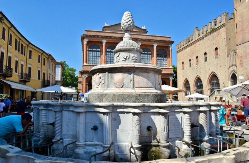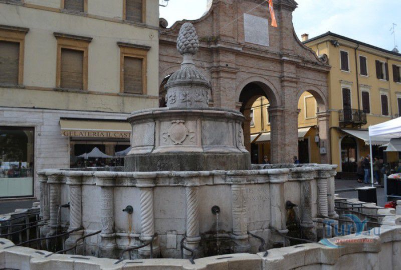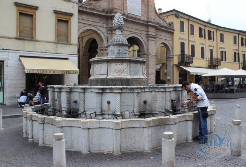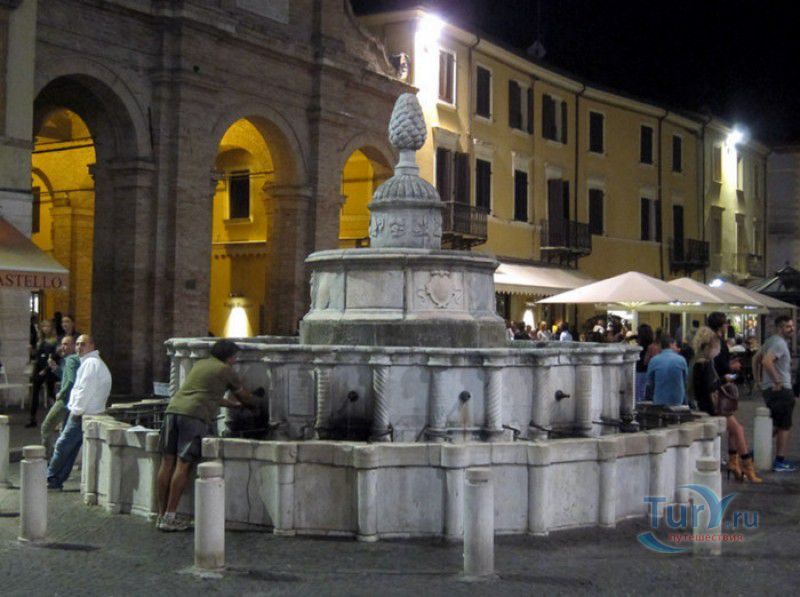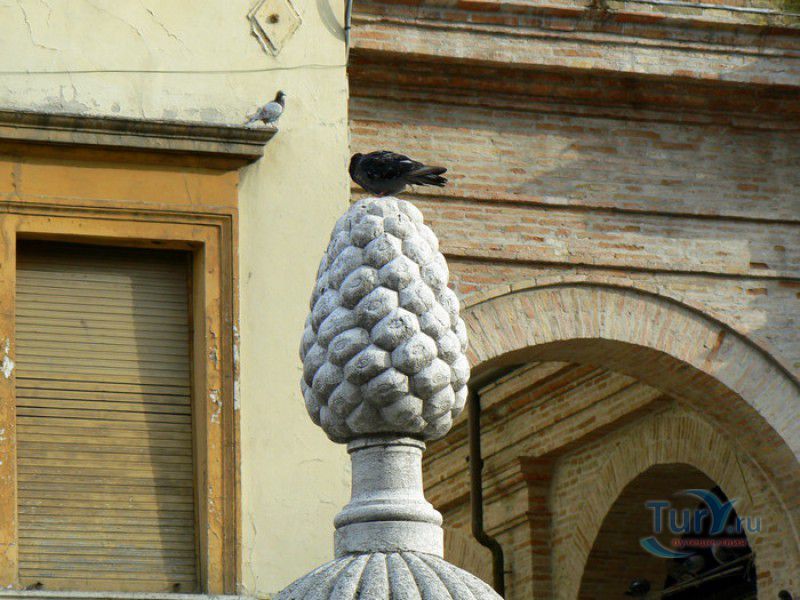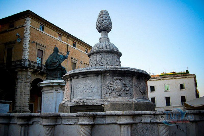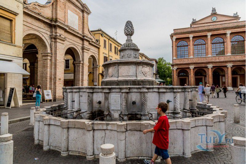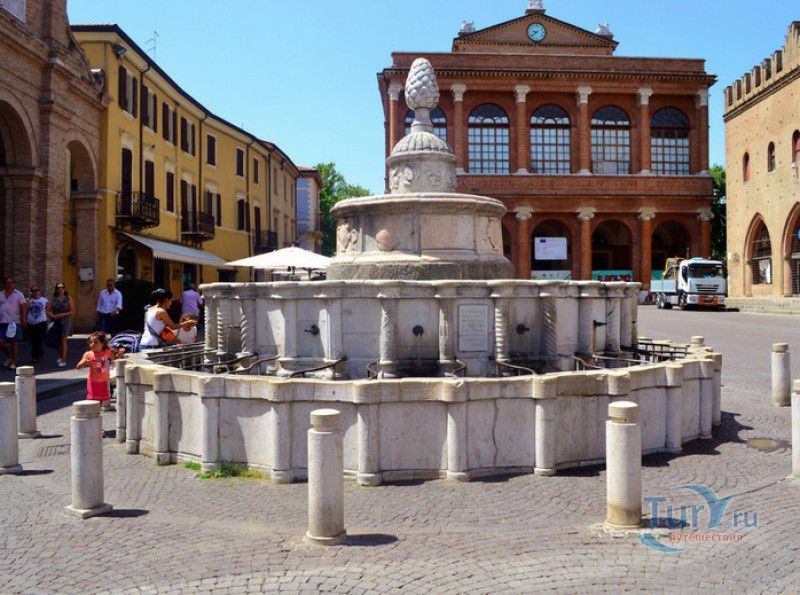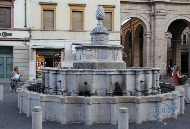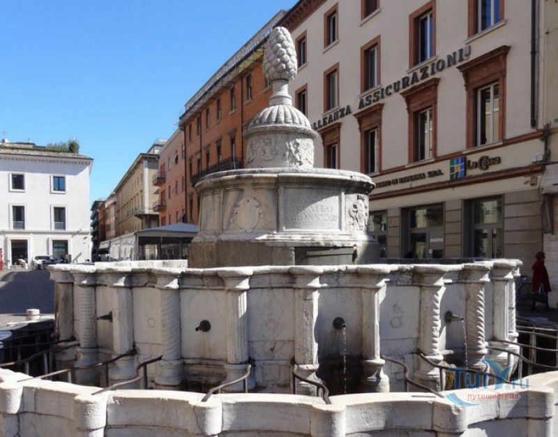 Фонтан Пинья расположен в историческом центре города Римини, на площади Кавур, рядом со статуей папы Павла V. Фонтан в Римини был построен ещё во времена Римской империи, вода в него поступала по трубам из глубокого колодца, расположенного на расстоянии около 900 метров. В 1540 году древний городской фонтан значительно пострадал из-за фейерверка, устроенного на площади Кавур по случаю назначения нового папского легата - кардинала Джованни Мария Чокки дель Монте, ставшего впоследствии папой Юлием III. В 1543 году фонтан был полностью восстановлен архитектором Джованни да Каррара, реконструкция фонтана стала возможна благодаря щедрым пожертвованиям понтифика Павла III, о чём указано на одной мемориальных табличек, прикреплённых к фонтану. Фонтан Пинья (Pigna в переводе с итальянского означает "Шишка") состоит из двух многоугольных концентрических бассейнов и центрального барабана, выполненных из белого мрамора. По всей окружности второго бассейна размещены 15 желобов с краниками, вода из которых стекает в нижний резервуар. На вершине фонтана установлена мраморная еловая шишка - символ независимости Римской Империи. Правда, с 1545 года по 1807 год фонтан венчала не шишка, а статуя папы Павла III, демонтированная во время оккупации Римини наполеоновскими войсками. В 1809 году на верхушке фонтана снова была установлена мраморная шишка, после чего за ним и закрепилось название - Fontana della Pigna. От древнеримского фонтана до наших дней сохранился лишь центральный барабан, украшенный оригинальными барельефами. Во время реконструкции фонтана, выполненной в XVI веке, повреждённые нижние бассейны были восстановлены в своём первоначальном виде, но с использованием мрамора, взятого на руинах других древнеримских сооружений. Уникальная конструкция фонтана Пинья и "мелодия" падающей воды, вызвала восхищение самого Леонардо да Винчи, посетившего Римини в 1502 году в качестве инженера и военного советника Чезаре Борджиа. Его отзыв о фонтане выбит на одной из памятных табличек, расположенных на стенках бассейна. Вплоть до 1912 года, пока в Римини не был построен центральный водопровод, фонтан Пинья был единственным источником питьевой воды в городе. Последняя реставрация фонтана была проведена в 2002 году.