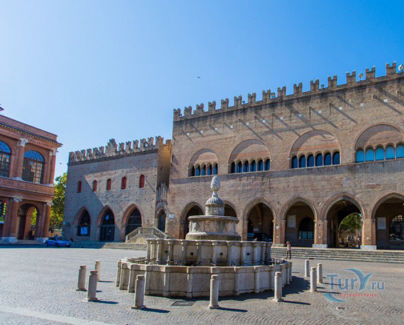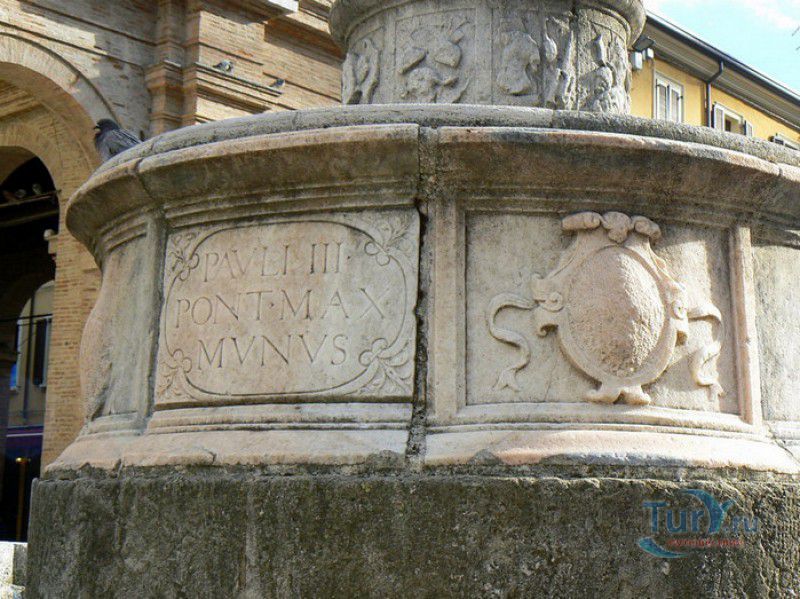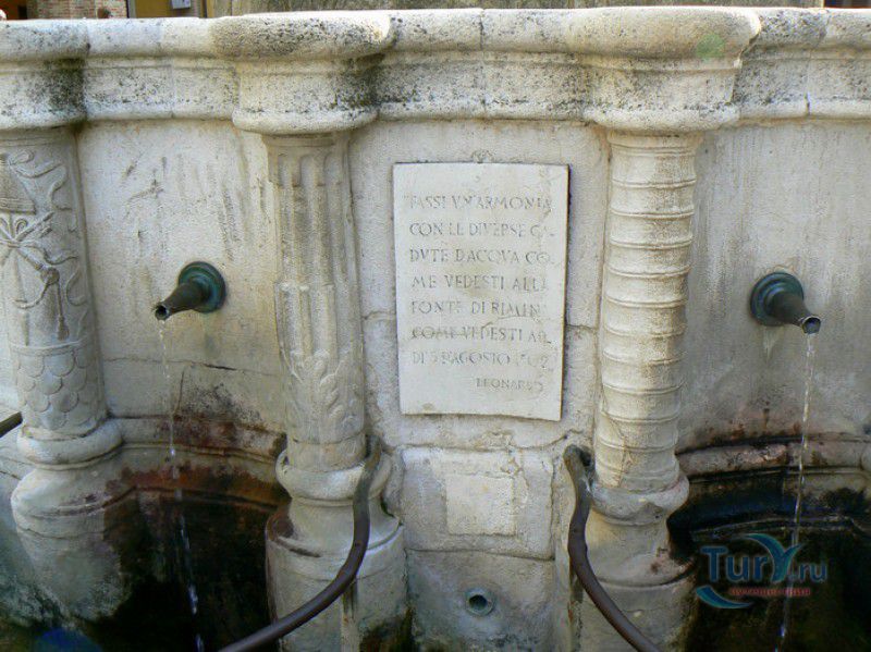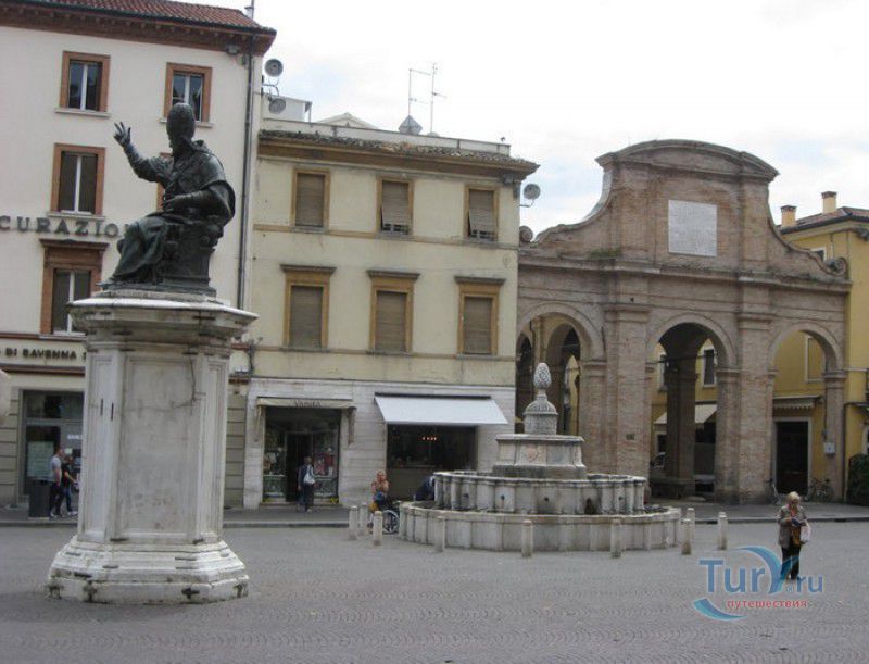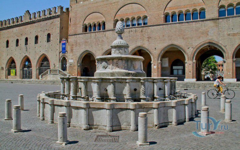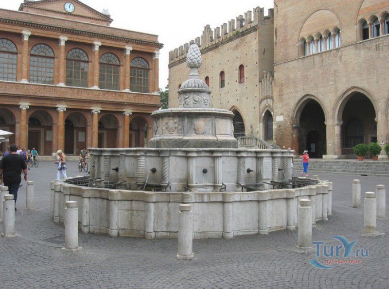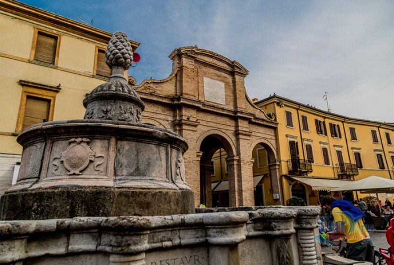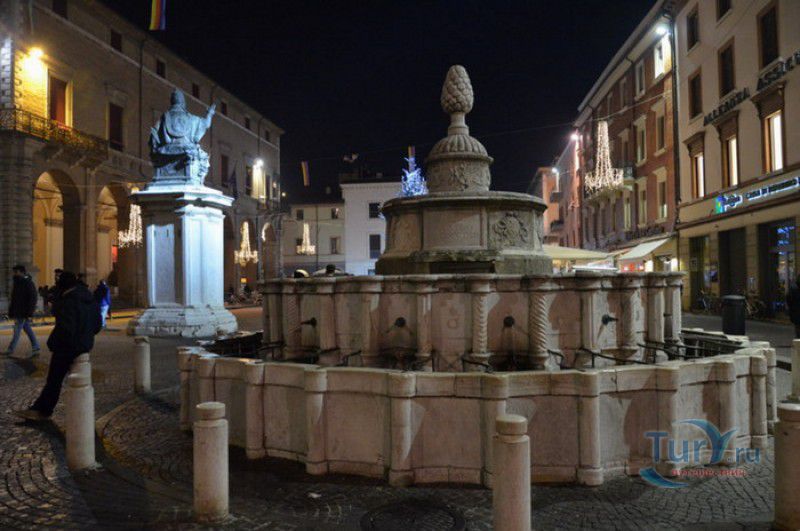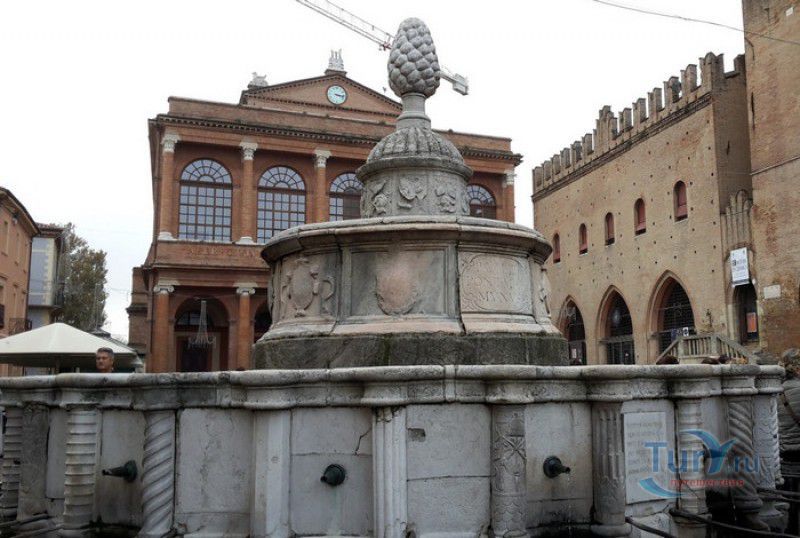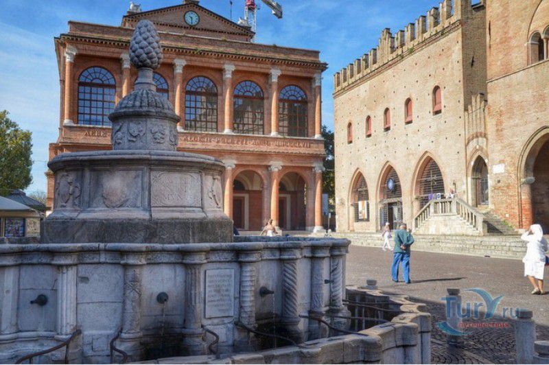 Фонтан Пинья расположен в историческом центре города Римини, на площади Кавур, рядом со статуей папы Павла V. Фонтан в Римини был построен ещё во времена Римской империи, вода в него поступала по трубам из глубокого колодца, расположенного на расстоянии около 900 метров. В 1540 году древний городской фонтан значительно пострадал из-за фейерверка, устроенного на площади Кавур по случаю назначения нового папского легата - кардинала Джованни Мария Чокки дель Монте, ставшего впоследствии папой Юлием III. В 1543 году фонтан был полностью восстановлен архитектором Джованни да Каррара, реконструкция фонтана стала возможна благодаря щедрым пожертвованиям понтифика Павла III, о чём указано на одной мемориальных табличек, прикреплённых к фонтану. Фонтан Пинья (Pigna в переводе с итальянского означает "Шишка") состоит из двух многоугольных концентрических бассейнов и центрального барабана, выполненных из белого мрамора. По всей окружности второго бассейна размещены 15 желобов с краниками, вода из которых стекает в нижний резервуар. На вершине фонтана установлена мраморная еловая шишка - символ независимости Римской Империи. Правда, с 1545 года по 1807 год фонтан венчала не шишка, а статуя папы Павла III, демонтированная во время оккупации Римини наполеоновскими войсками. В 1809 году на верхушке фонтана снова была установлена мраморная шишка, после чего за ним и закрепилось название - Fontana della Pigna. От древнеримского фонтана до наших дней сохранился лишь центральный барабан, украшенный оригинальными барельефами. Во время реконструкции фонтана, выполненной в XVI веке, повреждённые нижние бассейны были восстановлены в своём первоначальном виде, но с использованием мрамора, взятого на руинах других древнеримских сооружений. Уникальная конструкция фонтана Пинья и "мелодия" падающей воды, вызвала восхищение самого Леонардо да Винчи, посетившего Римини в 1502 году в качестве инженера и военного советника Чезаре Борджиа. Его отзыв о фонтане выбит на одной из памятных табличек, расположенных на стенках бассейна. Вплоть до 1912 года, пока в Римини не был построен центральный водопровод, фонтан Пинья был единственным источником питьевой воды в городе. Последняя реставрация фонтана была проведена в 2002 году.