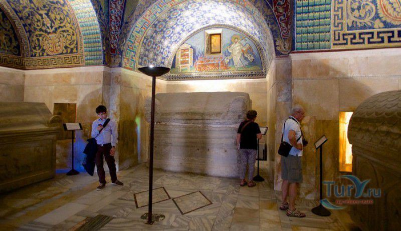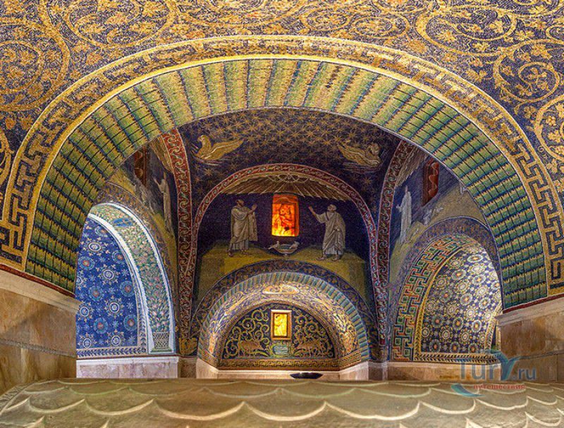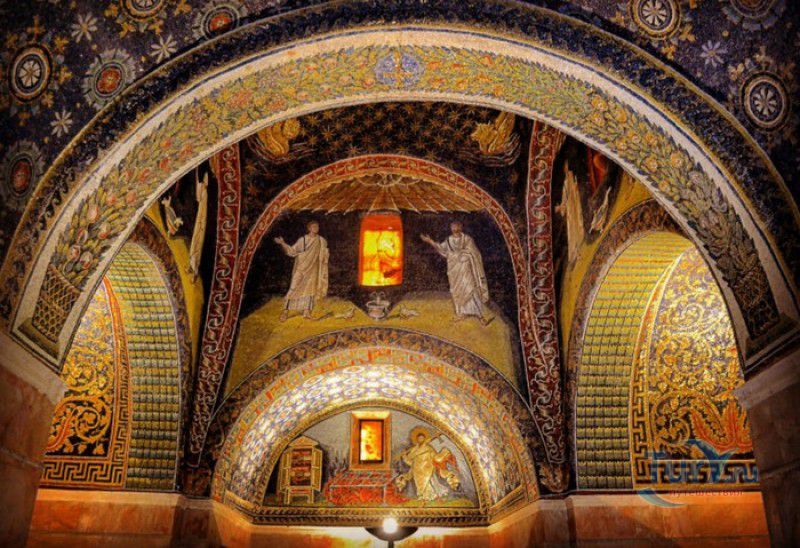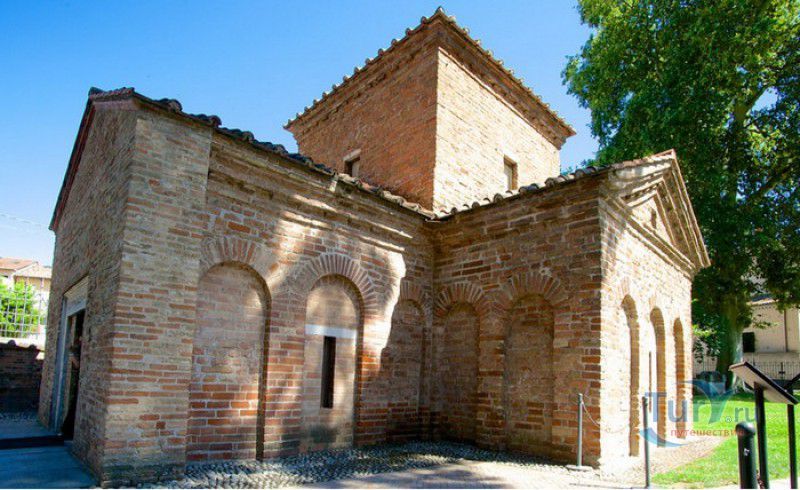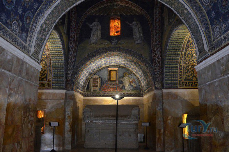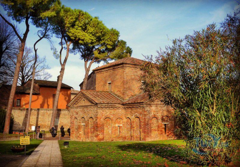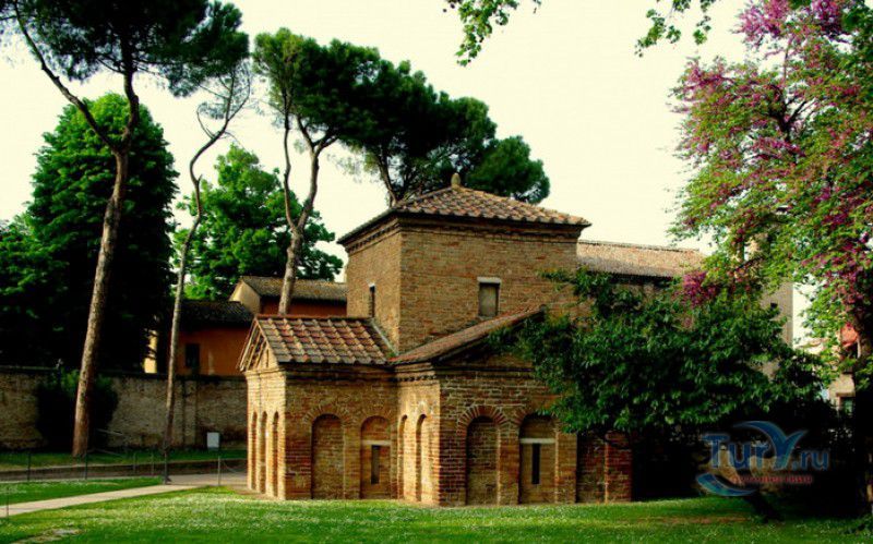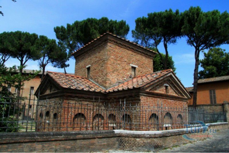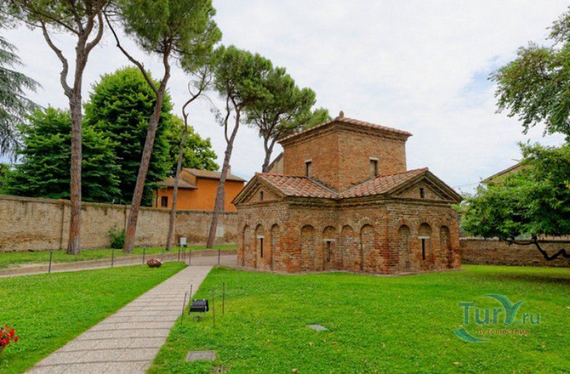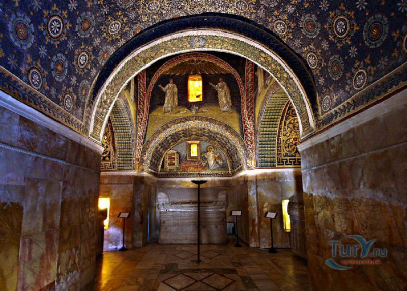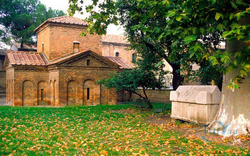 Мавзолей Галлы Плацидии - памятник раннехристианской архитектуры, одна из главных достопримечательностей Равенны, расположен в историческом центре города, рядом с базиликой Сан-Витале. Мавзолей был построен в 425-450 годах по приказу Галлы Плацидии - дочери римского императора Феодосия Великого. В 417 году Галла Плацидия была выдана замуж за Флавия Констанция, ставшего соправителем её брата - римского императора Гонория, а сама Плацидия получила титул августы (императрицы). В 425 году, после смерти Гонория и Констанция, 7-летний сын Галлы Плацидии Валентиниан был провозглашён в Риме императором, и с этого времени, вплоть до его совершеннолетия, Галла Плацидия единолично правила Западной Римской империей. Она принимала активное участие в утверждении христианской веры в империи, жертвовала большие средства храмам. Мавзолей, который был построен в Равенне по приказу Галлы Плацидии, и носит её имя, скорей всего был капеллой-молельней, посвящённой великомученику Лаврентию, особо почитавшемуся в роду Галлы Плацидии. Как бы то ни было, Галла Плацидия никогда не была похоронена в этом мавзолее - она умерла в Риме в 450 году и погребена в родовой усыпальнице императора Феодосия Великого, расположенной недалеко от собора Святого Петра. Мавзолей представляет собой небольшое крестово-купольное здание, в плане имеющее форму латинского креста. Кирпичное здание построено в ломбардском стиле, мощные стены сооружения украшены вертикальными выступами со слепыми арками, на главном фасаде есть фриз с изображением двух пантер и виноградных лоз, узкие окна здания напоминают бойницы. Венчает мавзолей Галлы Плацидии кубическая башня с внутренним полусферическим куполом. Вся красота мавзолея находится внутри здания - пол и нижняя часть стен облицованы мрамором, а поверхности купола, арок, люнет и верхней части стен покрыты мозаиками. Несмотря на то, что мозаики посвящены различным историческим и библейским сюжетам, все вместе они создают органичное единство. Особого внимания заслуживает насыщенно-синяя мозаика внутреннего купола мавзолея - в центре помещён золотой латинский крест, окружённый восемьюстами золотыми звёздами, объединёнными в концентрические окружности. Вся композиция представляет собой ночное небо и олицетворяет торжество Иисуса Христа над смертью. По углам расположены аллегорические изображения четырёх евангелистов - Марка (в виде льва), Луки (в виде тельца), Иоанна Богослова (в виде орла) и Матфея (в виде ангела). Сложный мозаичный орнамент, покрывающий потолок, символизирует райский сад. В верхних люнетах помещены парные изображения восьми апостолов - ученики Христа представлены в полный рост с руками, воздетыми к изображённому на потолке кресту. На мозаике северного нижнего люнета изображён Иисус в образе пастыря, в южном нижнем люнете изображены библейские персонажи, в том числе и Святой Лаврентий, идущий на сожжение. В мавзолее установлены три мраморных саркофага, предположительно изготовленные для самой Галлы Плацидии, её сына Валентиниана и супруга Констанция. В этих саркофагах действительно находились останки погребённых людей. В саркофаге Галлы Плацидии, якобы, находилось тело богатого и знатного язычника, "сидящего" на кипарисовом троне - оно сгорело в 1577 году в результате неосторожного обращения с огнём любопытст
