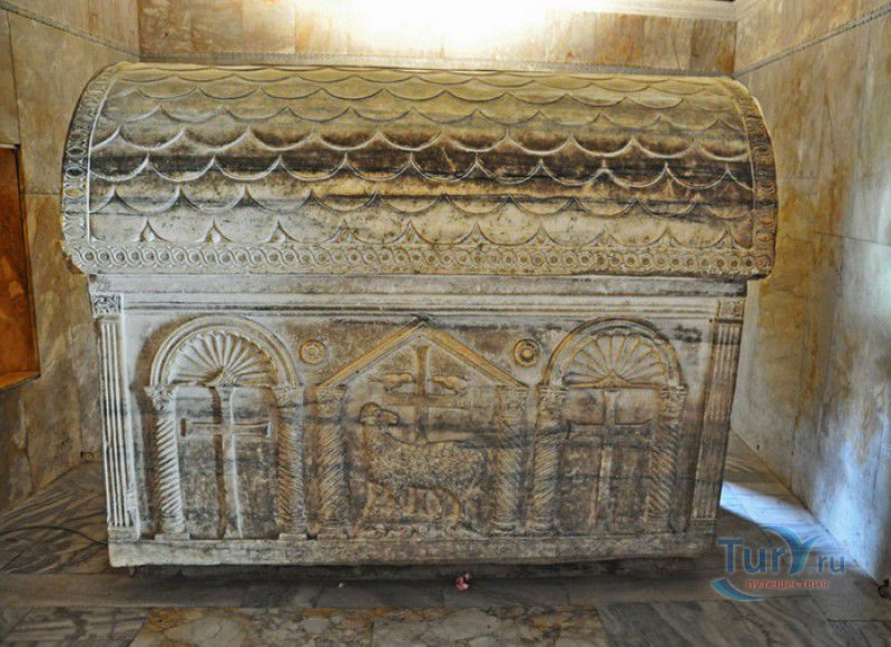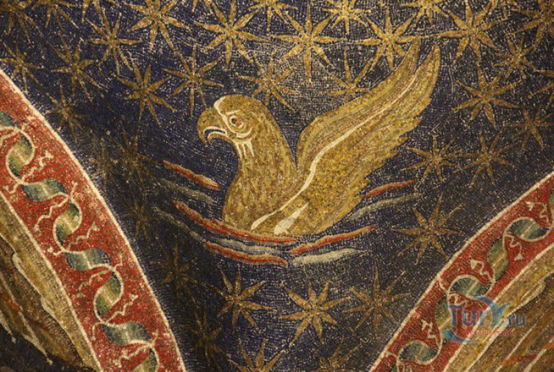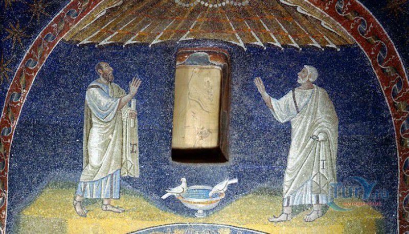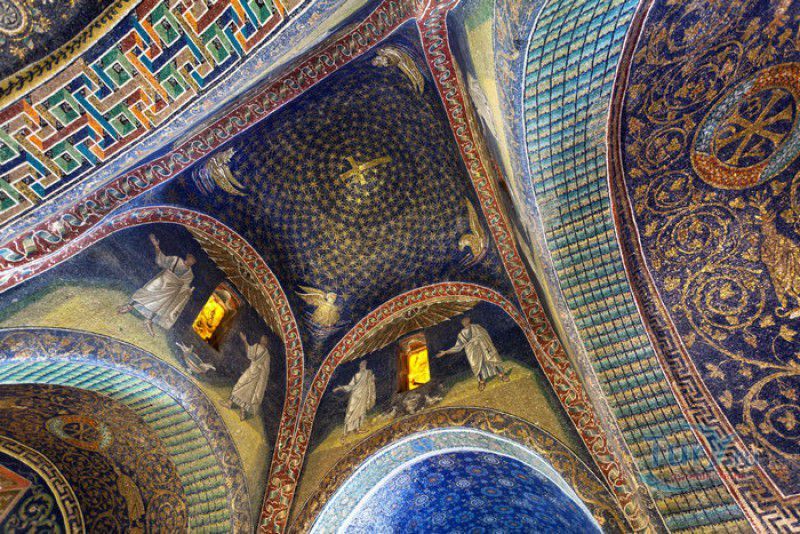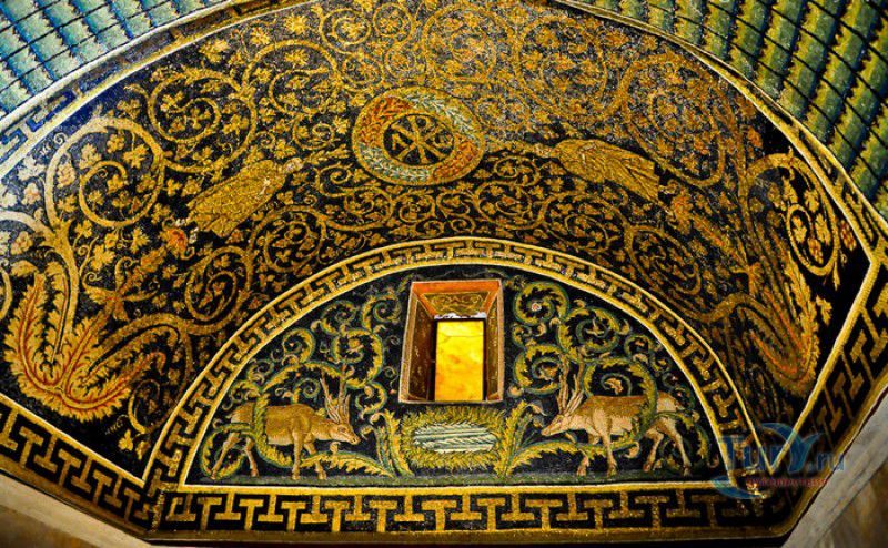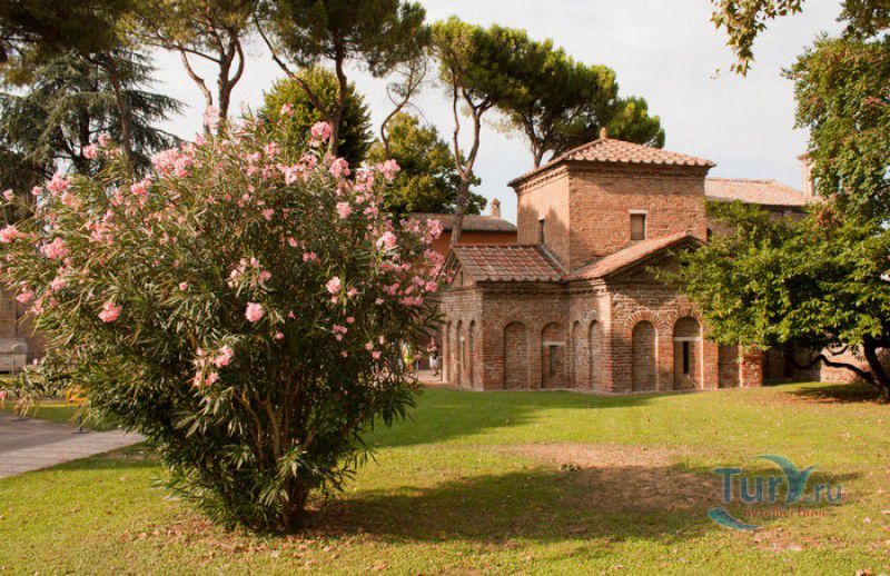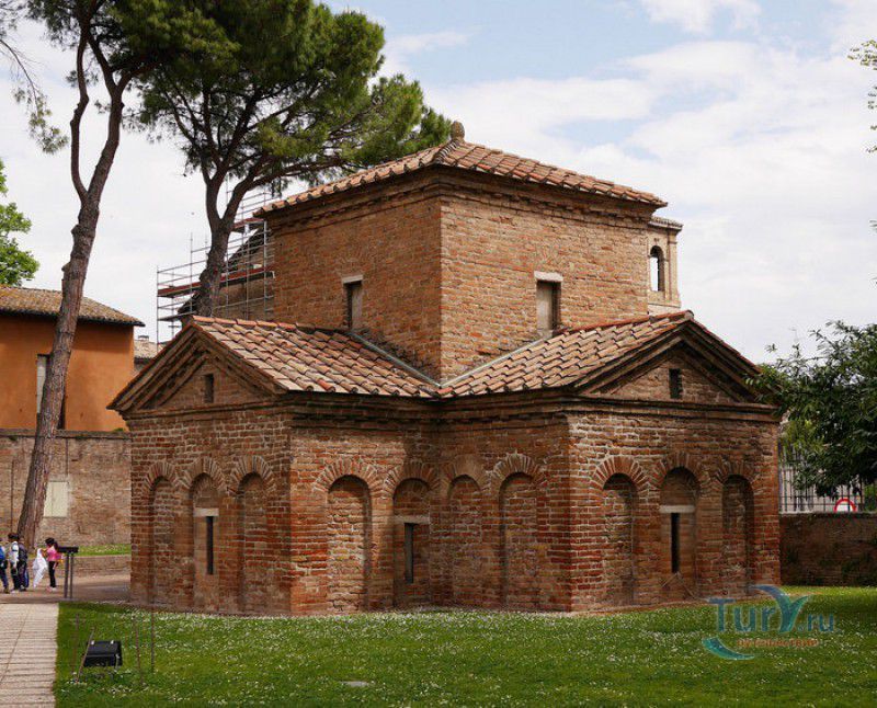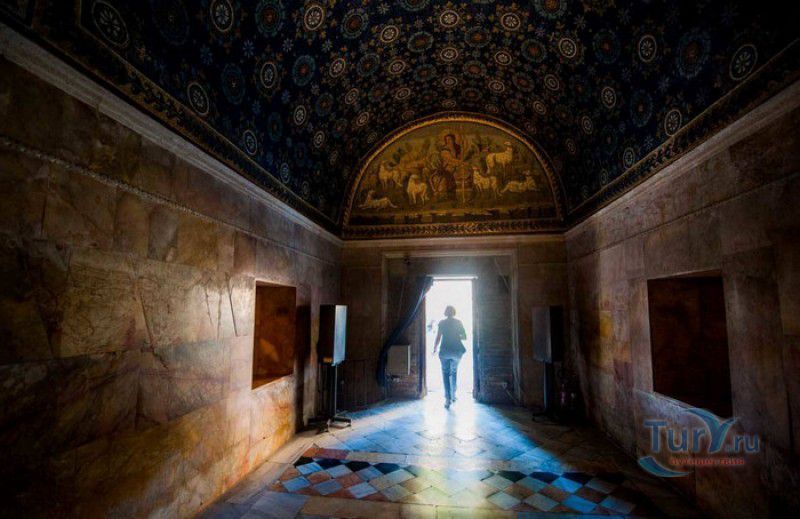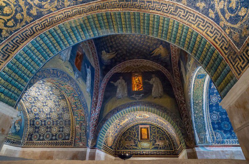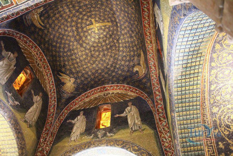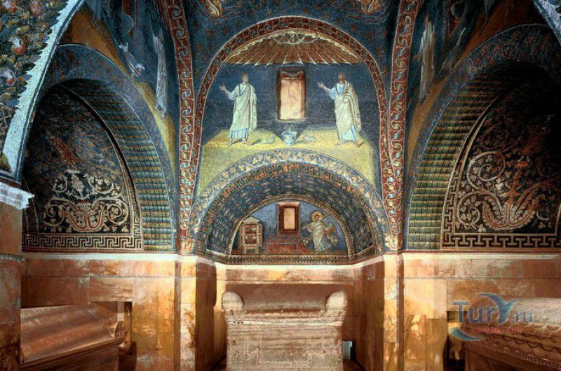 Мавзолей Галлы Плацидии - памятник раннехристианской архитектуры, одна из главных достопримечательностей Равенны, расположен в историческом центре города, рядом с базиликой Сан-Витале. Мавзолей был построен в 425-450 годах по приказу Галлы Плацидии - дочери римского императора Феодосия Великого. В 417 году Галла Плацидия была выдана замуж за Флавия Констанция, ставшего соправителем её брата - римского императора Гонория, а сама Плацидия получила титул августы (императрицы). В 425 году, после смерти Гонория и Констанция, 7-летний сын Галлы Плацидии Валентиниан был провозглашён в Риме императором, и с этого времени, вплоть до его совершеннолетия, Галла Плацидия единолично правила Западной Римской империей. Она принимала активное участие в утверждении христианской веры в империи, жертвовала большие средства храмам. Мавзолей, который был построен в Равенне по приказу Галлы Плацидии, и носит её имя, скорей всего был капеллой-молельней, посвящённой великомученику Лаврентию, особо почитавшемуся в роду Галлы Плацидии. Как бы то ни было, Галла Плацидия никогда не была похоронена в этом мавзолее - она умерла в Риме в 450 году и погребена в родовой усыпальнице императора Феодосия Великого, расположенной недалеко от собора Святого Петра. Мавзолей представляет собой небольшое крестово-купольное здание, в плане имеющее форму латинского креста. Кирпичное здание построено в ломбардском стиле, мощные стены сооружения украшены вертикальными выступами со слепыми арками, на главном фасаде есть фриз с изображением двух пантер и виноградных лоз, узкие окна здания напоминают бойницы. Венчает мавзолей Галлы Плацидии кубическая башня с внутренним полусферическим куполом. Вся красота мавзолея находится внутри здания - пол и нижняя часть стен облицованы мрамором, а поверхности купола, арок, люнет и верхней части стен покрыты мозаиками. Несмотря на то, что мозаики посвящены различным историческим и библейским сюжетам, все вместе они создают органичное единство. Особого внимания заслуживает насыщенно-синяя мозаика внутреннего купола мавзолея - в центре помещён золотой латинский крест, окружённый восемьюстами золотыми звёздами, объединёнными в концентрические окружности. Вся композиция представляет собой ночное небо и олицетворяет торжество Иисуса Христа над смертью. По углам расположены аллегорические изображения четырёх евангелистов - Марка (в виде льва), Луки (в виде тельца), Иоанна Богослова (в виде орла) и Матфея (в виде ангела). Сложный мозаичный орнамент, покрывающий потолок, символизирует райский сад. В верхних люнетах помещены парные изображения восьми апостолов - ученики Христа представлены в полный рост с руками, воздетыми к изображённому на потолке кресту. На мозаике северного нижнего люнета изображён Иисус в образе пастыря, в южном нижнем люнете изображены библейские персонажи, в том числе и Святой Лаврентий, идущий на сожжение. В мавзолее установлены три мраморных саркофага, предположительно изготовленные для самой Галлы Плацидии, её сына Валентиниана и супруга Констанция. В этих саркофагах действительно находились останки погребённых людей. В саркофаге Галлы Плацидии, якобы, находилось тело богатого и знатного язычника, "сидящего" на кипарисовом троне - оно сгорело в 1577 году в результате неосторожного обращения с огнём любопытст