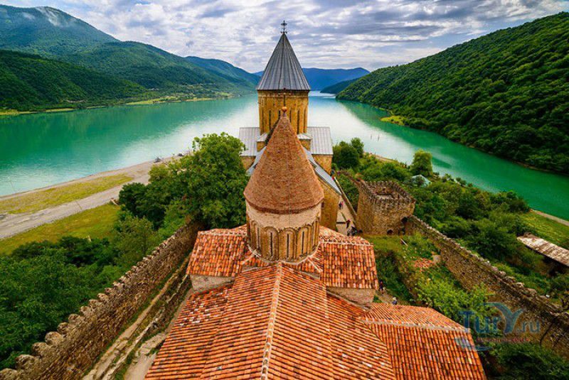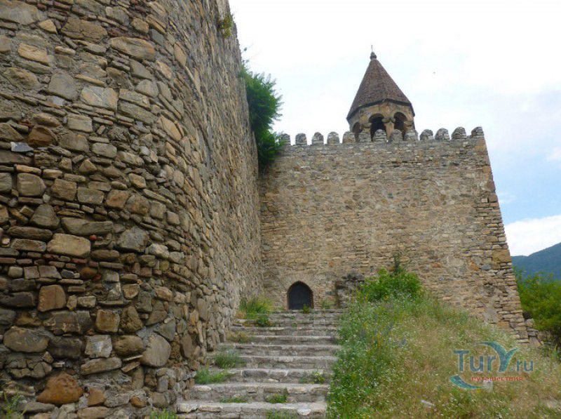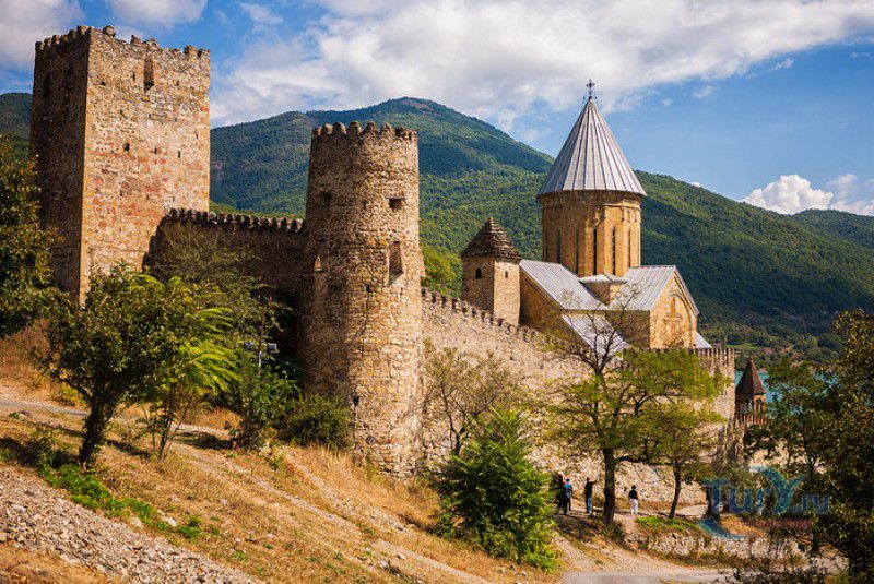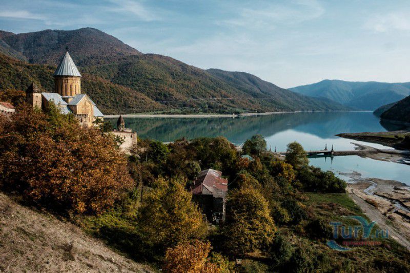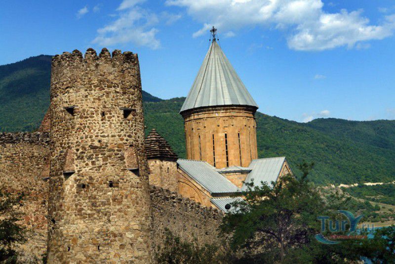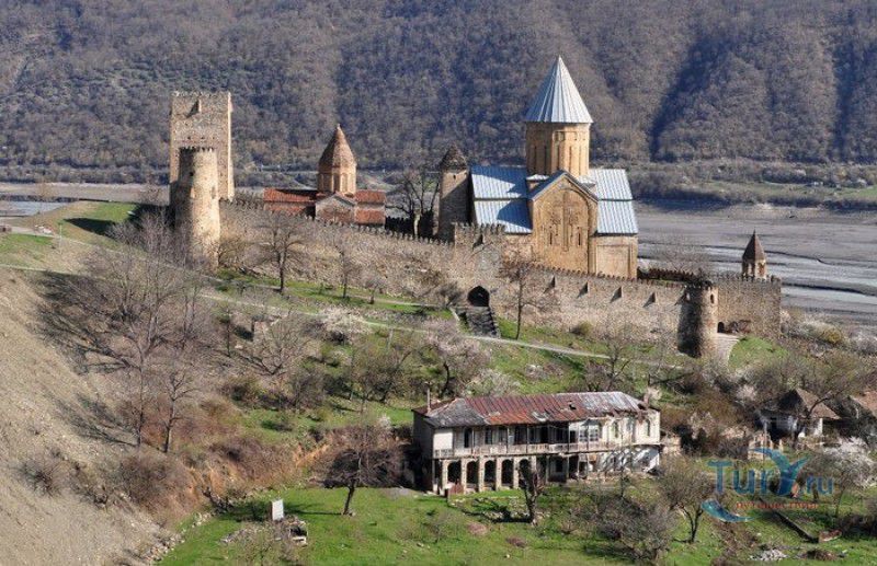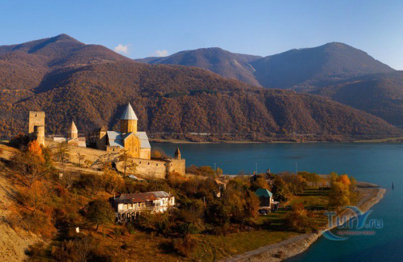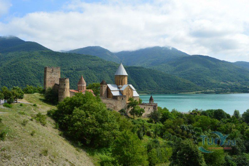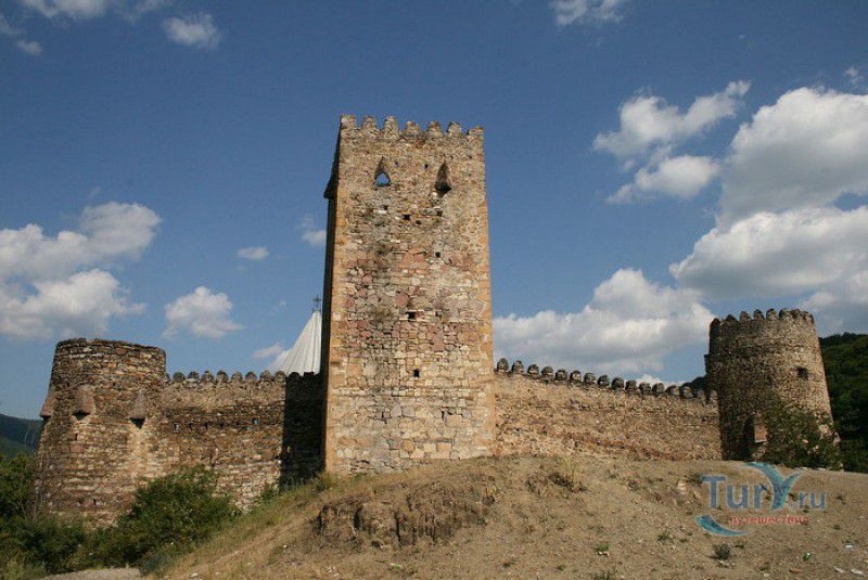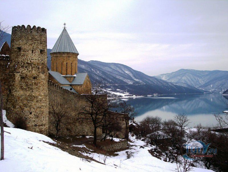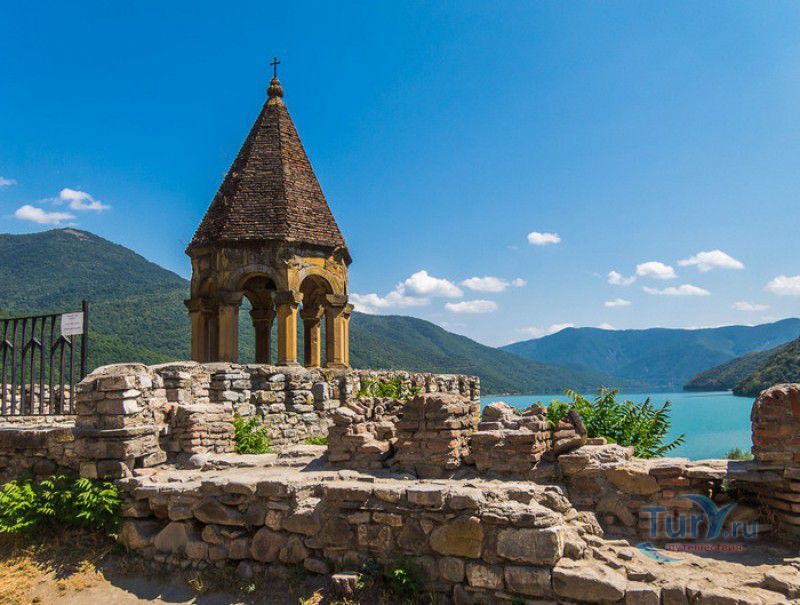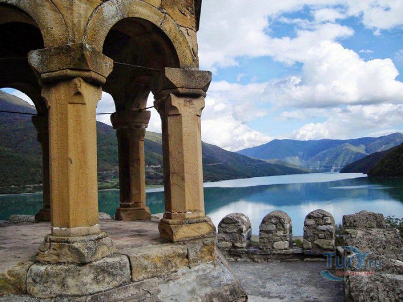 Крепость Ананури - бывший главный форпост Арагвского эриставства (средневекового феодального княжества в Грузии), расположена в 70 километрах к северу от города Тбилиси, на берегу Жинвальского водохранилища, рядом с Военно-Грузинской дорогой. Точная дата строительства крепости неизвестна, учёные сходятся во мнении, что крепость была построена в XVI-XVII веках, главным её предназначением была защита центральных районов эриставства от нападений со стороны Дарьяльского ущелья. Место для строительства крепости было выбрано очень удачно - она перекрывала дорогу, ведущую на север из города Душети - резиденции арагвских эриставов. Эта дорога проходила через узкое ущелье реки Ведзатхеви, в месте слияния которой с рекой Арагви и было возведено мощное оборонительное сооружение - крепость Ананури. Об Ананурском замке в исторических хрониках нет никаких сведений вплоть до первой четверти XVIII века, впервые события, связанные с крепостью Ананури, были описаны грузинским историком Вахушти Багратиони. В XVIII столетии Арагвское эриставство подвергалось постоянным набегам лезгин, иранцев и турок, кроме того, правители княжества вели междоусобные войны за власть. Известно, что крепость Ананури в это время не раз становилась последним оплотом правителей Арагвского эриставства и выдерживала продолжительные осады. После того, как в январе 1801 года Грузия вошла в состав Российской империи, в крепости Ананури был размещён русский гарнизон, который охранял Военно-Грузинскую дорогу - главную магистраль, соединявшую Грузию с Россией. После ухода в 1917 году российских военных частей из Грузии крепость Ананури оказалась заброшенной и постепенно разрушалась. До наших дней от мощного оборонительного сооружения сохранился лишь верхний замок (цитадель) с мощными крепостными стенами, квадратной башней с пирамидальной крышей (самой ранней постройкой на территории крепости), двумя храмами и колокольней. От нижнего замка и двух небольших церквей, расположенных на его территории, остались одни руины. Находящаяся на территории крепости церковь Успения Богородицы была возведена в 1689 году. Храм построен из тёсаного камня, его фасады украшены рельефами с изображением святых, животных и растений. На южном фасаде размещён огромный резной крест, украшенный декоративным орнаментом, а на стене, рядом с центральным порталом, выбиты письмена на грузинском языке. Внутри церкви сохранились старинный алтарь и несколько фресок, на которых изображены сцены из Страшного суда и лики тринадцати Святых отцов - основоположников православия в Грузии. Настенные росписи Успенского храма считаются одними из лучших образцов грузинского церковного искусства эпохи позднего Средневековья. Спасский храм или церковь Девы Марии датируется концом XVI - началом XVII веков, внутри церкви можно увидеть каменное надгробие с надписью, свидетельствующей о том, что под могильной плитой покоится тело эристава Эдишера, умершего в 1674 году. Несколько надгробий сохранились и на территории крепости, они расположены у стен храмов. Почти вплотную к церкви Успения Богородицы примыкает четырёхэтажная квадратная башня, на самом верху которой есть небольшое помещение с узким окном-бойницей - некогда здесь располагался наблюдательный пункт гарнизона крепости. Сохранилась и узкая винтовая лестница