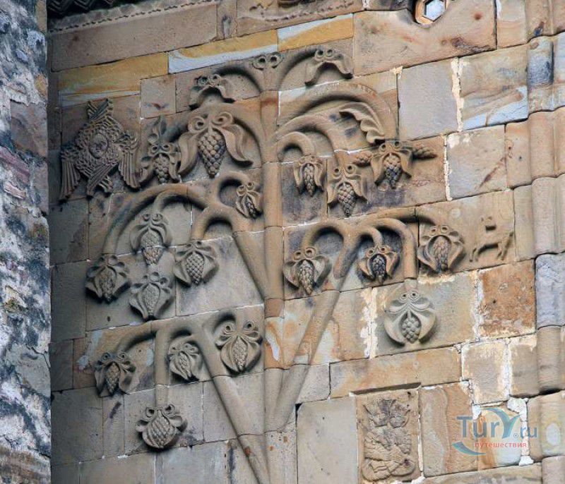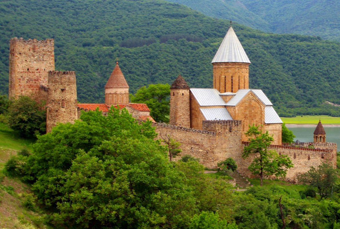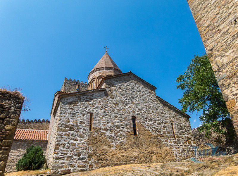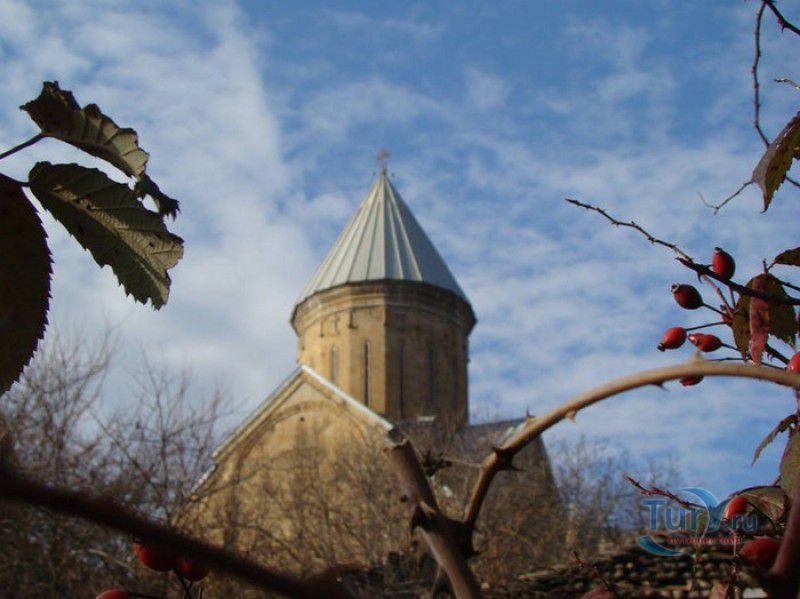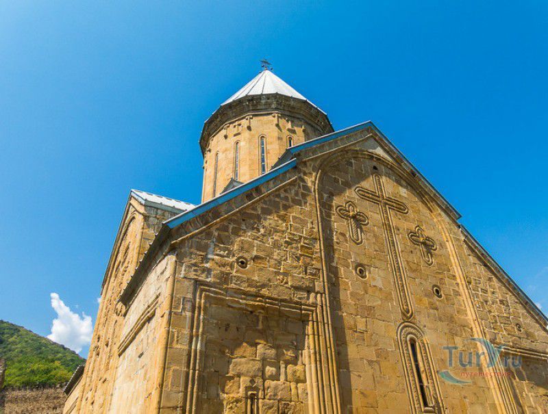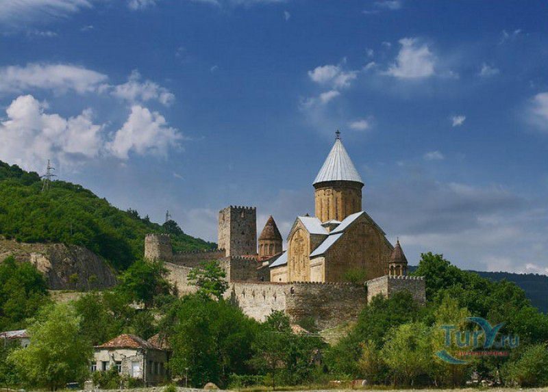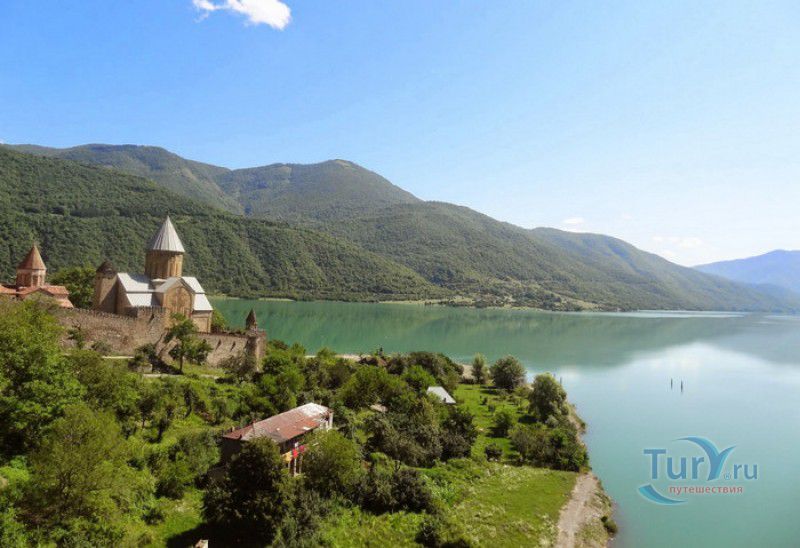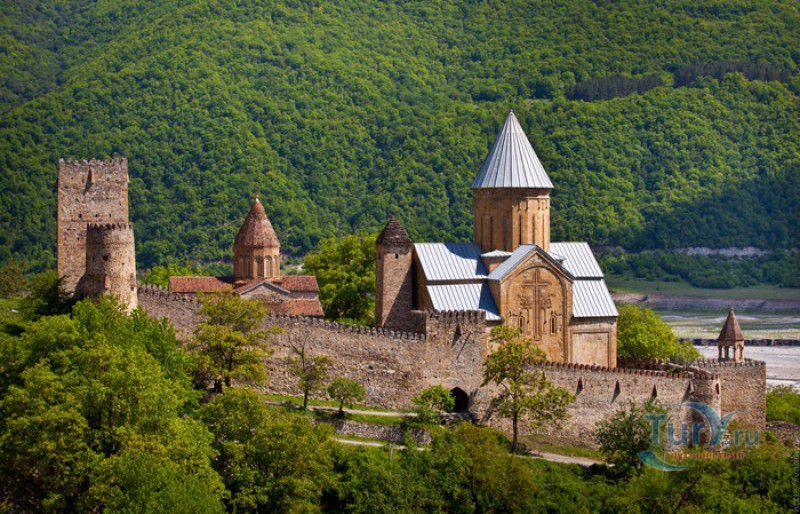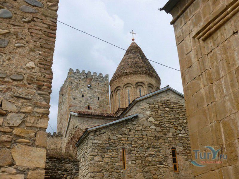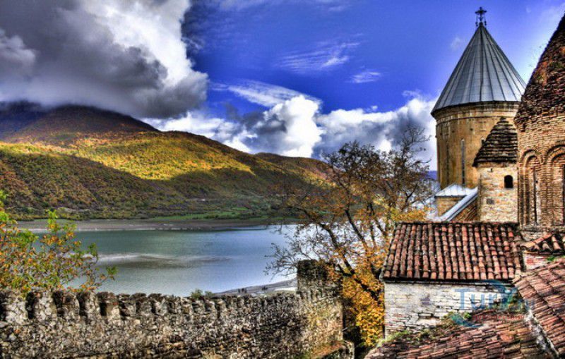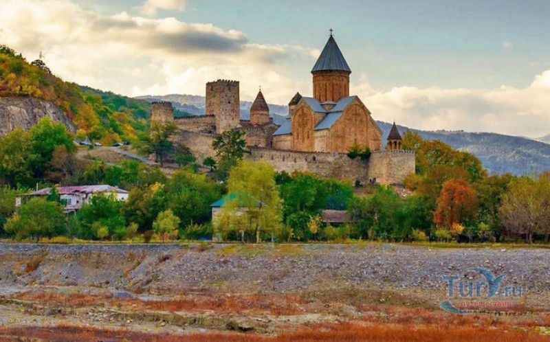 Крепость Ананури - бывший главный форпост Арагвского эриставства (средневекового феодального княжества в Грузии), расположена в 70 километрах к северу от города Тбилиси, на берегу Жинвальского водохранилища, рядом с Военно-Грузинской дорогой. Точная дата строительства крепости неизвестна, учёные сходятся во мнении, что крепость была построена в XVI-XVII веках, главным её предназначением была защита центральных районов эриставства от нападений со стороны Дарьяльского ущелья. Место для строительства крепости было выбрано очень удачно - она перекрывала дорогу, ведущую на север из города Душети - резиденции арагвских эриставов. Эта дорога проходила через узкое ущелье реки Ведзатхеви, в месте слияния которой с рекой Арагви и было возведено мощное оборонительное сооружение - крепость Ананури. Об Ананурском замке в исторических хрониках нет никаких сведений вплоть до первой четверти XVIII века, впервые события, связанные с крепостью Ананури, были описаны грузинским историком Вахушти Багратиони. В XVIII столетии Арагвское эриставство подвергалось постоянным набегам лезгин, иранцев и турок, кроме того, правители княжества вели междоусобные войны за власть. Известно, что крепость Ананури в это время не раз становилась последним оплотом правителей Арагвского эриставства и выдерживала продолжительные осады. После того, как в январе 1801 года Грузия вошла в состав Российской империи, в крепости Ананури был размещён русский гарнизон, который охранял Военно-Грузинскую дорогу - главную магистраль, соединявшую Грузию с Россией. После ухода в 1917 году российских военных частей из Грузии крепость Ананури оказалась заброшенной и постепенно разрушалась. До наших дней от мощного оборонительного сооружения сохранился лишь верхний замок (цитадель) с мощными крепостными стенами, квадратной башней с пирамидальной крышей (самой ранней постройкой на территории крепости), двумя храмами и колокольней. От нижнего замка и двух небольших церквей, расположенных на его территории, остались одни руины. Находящаяся на территории крепости церковь Успения Богородицы была возведена в 1689 году. Храм построен из тёсаного камня, его фасады украшены рельефами с изображением святых, животных и растений. На южном фасаде размещён огромный резной крест, украшенный декоративным орнаментом, а на стене, рядом с центральным порталом, выбиты письмена на грузинском языке. Внутри церкви сохранились старинный алтарь и несколько фресок, на которых изображены сцены из Страшного суда и лики тринадцати Святых отцов - основоположников православия в Грузии. Настенные росписи Успенского храма считаются одними из лучших образцов грузинского церковного искусства эпохи позднего Средневековья. Спасский храм или церковь Девы Марии датируется концом XVI - началом XVII веков, внутри церкви можно увидеть каменное надгробие с надписью, свидетельствующей о том, что под могильной плитой покоится тело эристава Эдишера, умершего в 1674 году. Несколько надгробий сохранились и на территории крепости, они расположены у стен храмов. Почти вплотную к церкви Успения Богородицы примыкает четырёхэтажная квадратная башня, на самом верху которой есть небольшое помещение с узким окном-бойницей - некогда здесь располагался наблюдательный пункт гарнизона крепости. Сохранилась и узкая винтовая лестница