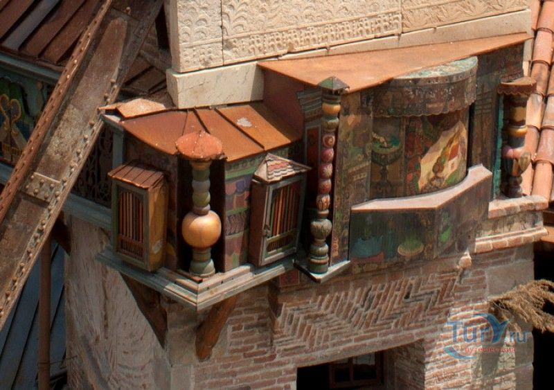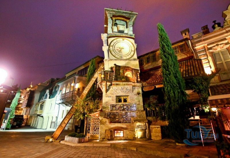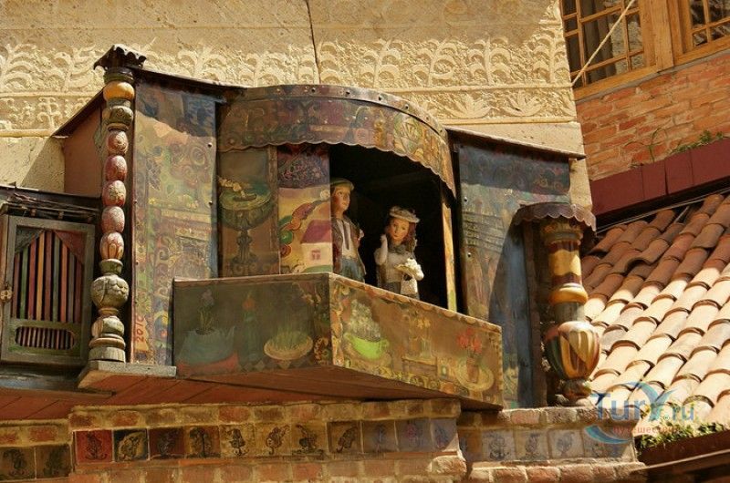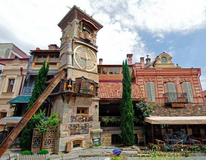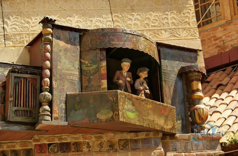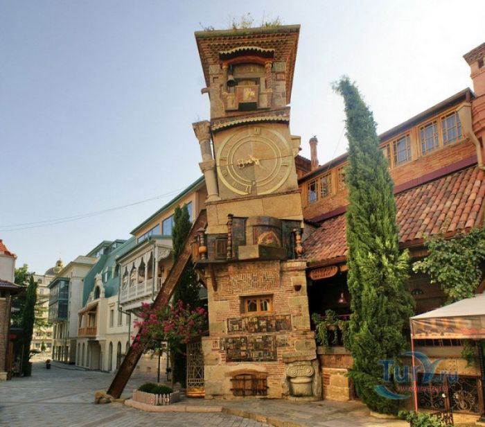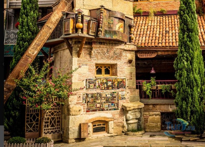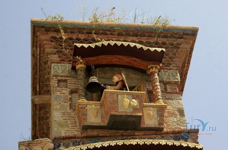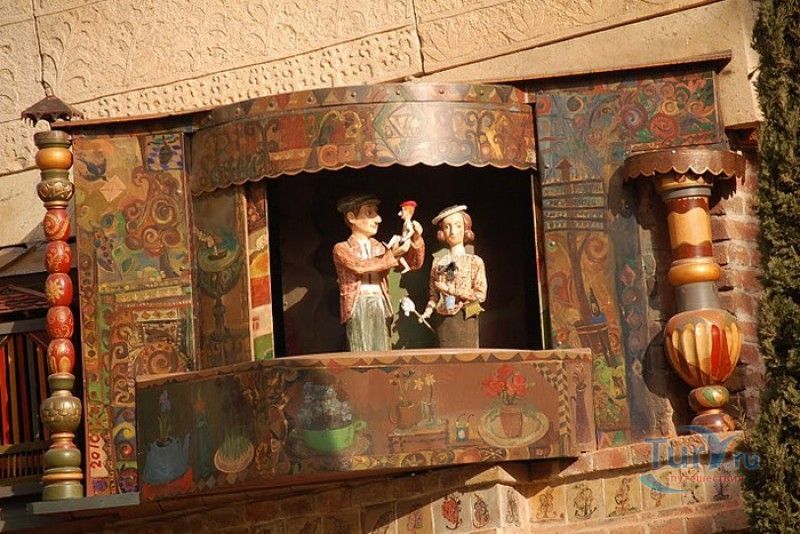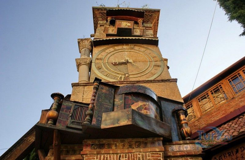 Башня Театра Марионеток Резо Габриадзе - одна из самых популярных достопримечательностей Тбилиси, на фоне которой считают необходимым сфотографироваться многие туристы, посещающие столицу Грузии. Необычная башня была построена в 2010 году по инициативе известного грузинского кинорежиссёра Резо Габриадзе (создателя знаменитых фильмов "Мимино" и "Кин-дза-дза!") и руководителя тбилисского Театра марионеток, к празднованию 30-летнего юбилея которого открытие башни и было приурочено. По замыслу Габриадзе, облик башни должен был органично вписаться в колорит старого Тбилиси и в то же время напоминать средневековые сооружения Византии. Строительный материал для башни собирали всем театром, рассказывая о своём детище Резо Габриадзе вспоминает: "Мы строили, как в старину - собирали камни, кирпичи, некоторым по 200 - 300 лет. Как разрушается дом - так мы появляемся. В этом участвовал весь театр. И четыре года приставляли один камень к другому, потому что камни должны соединяться, как люди - по любви, конфликтуя или обнимаясь". В результате, башня была сконструирована из множества уникальных деталей - древних угловатых камней, старинных кирпичей, фрагментов византийских колонн и перекошенного циферблата часов. Мало того, башня, по подобию Пизанской башни, имеет наклон и подпирается чугунным перекрытием, взятым со старого разрушенного моста. Изразцы, которыми украшено основание башни, были вручную расписаны лично Резо Габриадзе - среди нескольких сотен сюжетов, изображённых на них, нет ни одного повторяющегося рисунка. На крыше башни оборудован небольшой зелёный садик, в котором растёт дерево граната - "древо жизни", символизирующее ростки новой жизни, пробивающиеся "сквозь века цивилизации". Каждый час в верхней части башни раскрываются дверцы и на балконе появляется кукольный ангел с золотыми крыльями. В руке он держит молоточек, которым бьёт в маленький колокол, закреплённый на фасаде башни. Отбив полный час, ангел поворачивается спиной, делает взмах своими золотыми крыльями и скрывается в своём домике. Дважды в день, в полдень и в семь часов вечера, на балконе среднего яруса башни разыгрывается кукольный мини спектакль "Цикл жизни" - под весёлую грузинскую мелодию раскрывается расписной железный занавес, и на балконе появляются счастливые молодожёны. В следующей сцене они уже нянчат малыша, затем зрители видят семейную пару преклонных лет, и в конце - две могилки под высокими елями. Но на этом спектакль не заканчивается - на балконе снова появляются молодожёны, символизируя неизбежное продолжение жизни и круговорот времени. Башня Габриадзе не только стала украшением Театра марионеток, но великолепно вписалась в архитектурный ансамбль старого города, местные жители дали ей своё название - "Башня с ангелом".