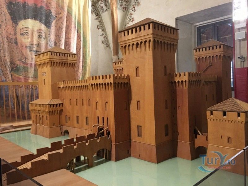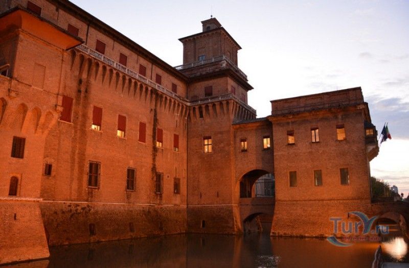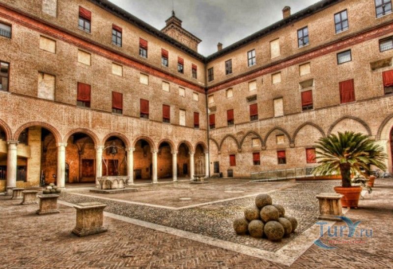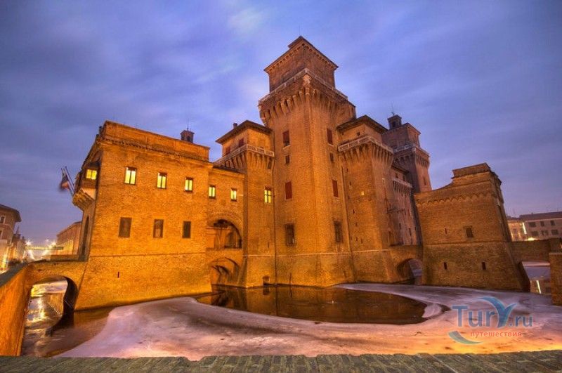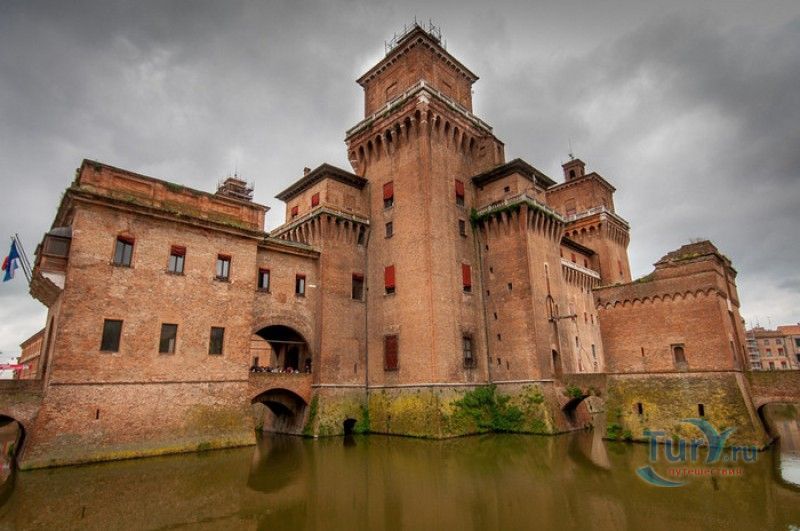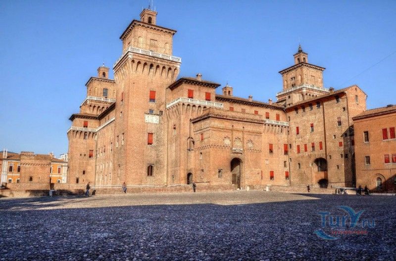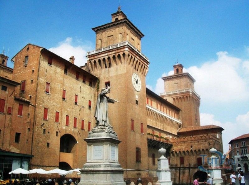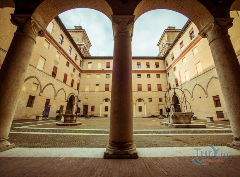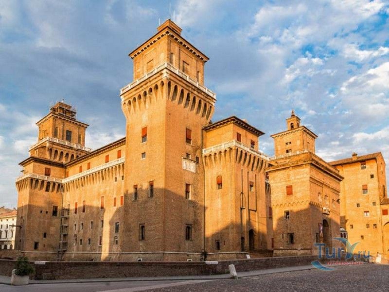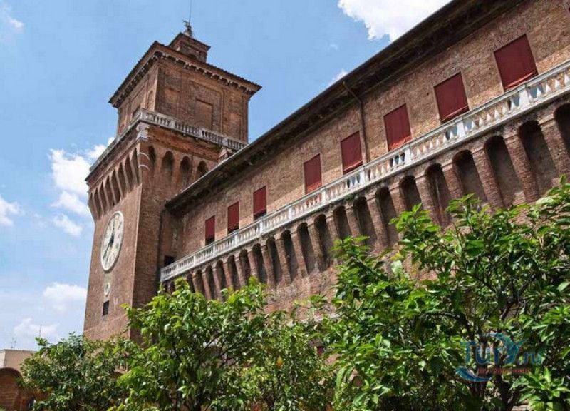 Замок Эстенсе расположен в исторической части города Феррара, в 200 метрах к северу от Кафедрального собора. Замок Эстенсе - средневековый замок, бывшая резиденция древнего и знатного рода д'Эсте, правившего в Ферраре более чем 500 лет. До 1385 года резиденцией семьи д'Эсте был Палаццо Комунале, однако, после бунта жителей Феррары, возмущённых высокими налогами, тогдашний правитель города маркиз Никколо II д'Эсте решил, что нынешний дворец не гарантирует его семье защиту от взбунтовавшейся толпы, и приказал начать строительство нового замка рядом с Палаццо Комунале. Замок, по замыслу правителя Феррары, должен был стать оплотом правящей династии в мятежном городе, а также символом политической власти и военной мощи рода д'Эсте. Возведение замка-крепости было поручено архитектору Бартолино да Новара, который при строительстве использовал часть фортификационных сооружений города, в частности, башню Львов (Torre dei Leoni), датируемую XIII веком и являющуюся частью городской крепостной стены. Первый камень в основание крепости был заложен 29 сентября 1385 года, в день Святого Михаила, поэтому и замок был назван в честь этого святого. Замок Эстенсе представляет собой квадратное сооружение с мощными стенами и четырьмя угловыми башнями, каждая из которых имеет своё название - башня Львов, башня Святого Павла, башня Святой Екатерины и башня Маркизы. Замок окружён рвом, заполненным водой, имеет три подъёмных моста, впереди крепостного рва расположены кирпичные равелины. В XV веке, во время правления Эрколе I д'Эсте, замок стал превращаться в роскошную резиденцию знатного семейства - стали обустраиваться внутренние помещения, большое внимание было уделено оформлению интерьеров, были также значительно расширены жилые апартаменты. Перестройка замка была поручена знаменитому итальянскому архитектору, художнику и декоратору Джироламо да Карпи, благодаря которому замок приобрёл свой нынешний "облагороженный" вид. В 1598 году, ввиду отсутствия законных детей у герцога Альфонсо II, власть в Ферраре перешла к Папскому престолу - фактически правителем города стал папа Климент VIII. Члены семьи д'Эсте переехали в Модену, а в их дворце стали хозяйничать папские легаты. Так продолжалось вплоть до 1860 года, когда Феррара стала частью Королевства Италия. В 1874 году замок Эстенсе перешёл в собственность города и долгое время использовался как штаб-квартира префектуры провинции Феррара. Во время Второй мировой войны замок был почти полностью разрушен, реставрация была проведена в 1998-2003 годах, после чего замок Эстенсе был превращён в музей и открыт для посетителей. В цокольном этаже замка, наиболее сохранившем черты средневековой крепости, расположены большие готические залы с высокими сводчатыми потолками (бывшие личные апартаменты Никколо II, Никколо III, Лионелло и Альфонсо II д’Эсте), замковые кухни (на месте бывшего восточного равелина), а в подземелье, под башней Львов, находится замковая тюрьма, в которой содержали заключённых из знатных дворянских семей, бывших, как правило, личными врагами рода д'Эсте. На стенах темницы до сих пор сохранились надписи, сделанные знаменитыми узниками. На втором этаже расположены лоджия и Апельсиновый сад, Герцогская часовня, приёмные покои и парадные залы - Гербовый зал, комната Вакханалий, зал Игр, зал Авроры, зал Географии, комна