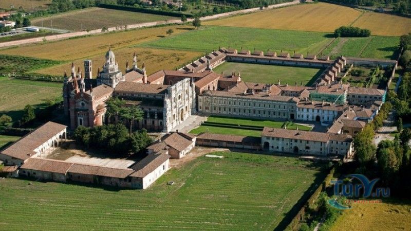 Картезианский Монастырь Павийская Чертоза расположен на территории коммуны Чертоза-ди-Павия, в 8 километрах к северу от города Павия и в 30 километрах от Милана. Монастырский комплекс был основан в 1396 году по указу Джана Галеаццо Висконти, первого герцога Миланского, во исполнения обета, данного его женой Екатериной Висконти. Под строительство монастыря были отведены обширные охотничьи угодья близ города Павия, принадлежавшие семейству Висконти. Первый камень в основание обители был заложен 27 августа 1396 года, первым архитектором, который руководил строительством, был Марко Солари. Первоначально обитель для ордена Картезианцев возводилась в готическом стиле, завершали её строительство уже в стиле Ренессанс архитекторы Джованни и Гвинифорте Солари. Свой окончательный вид Павийская Чертоза приобрела под руководством архитектора Джованни Антонио Амадео. Церковь монастыря, освящённая 3 мая 1497 года в честь Санта-Мария-делле-Грацие, по замыслу герцога, должна была стать усыпальницей для членов семьи Висконти, а затем - и Сфорца (после смерти последнего герцога Висконти в 1447 году, титул герцога Миланского получил Франческо Сфорца). Монастырский комплекс состоит из церкви Санта-Мария-делле-Грацие, двух клуатров (большого и малого), Герцогского дворца, монашеских келий и хозяйственных построек. В архитектурном плане Павийская Чертоза является шедевром ломбардийского зодчества XV века, в котором гармонично объединены готический и ренессансный архитектурные стили. Несомненно, красивейшим зданием ансамбля является церковь Санта-Мария-делле-Грацие. Трёхнефный храм с апсидой, трансептом и боковыми часовнями в плане имеет форму латинского креста, крестообразный готический свод, расписанный под звёздное небо и украшенный геометрическим орнаментом, поддерживают мощные каменные колонны с капителями. Настоящим произведением искусства является мраморный фасад церкви, украшенный скульптурами, небольшими шпилями с контрофорсами, гербами, медальонами и барельефами с изображениями древнеримских императоров, философов и учёных, христианских пророков и апостолов. Над оформлением фасада работали лучшие мастера того времени - Амадео, Ломбардо, Бриоско, Пиольтелло, Алесси, делла Порто. Великолепный мраморный портал со сдвоенными колоннами, украшенными резными барельефами, был выполнен Бенедетто Бриоско по проекту Джованни Антонио Амадео. Оформление интерьера ничуть не уступает экстерьеру пышностью и богатством убранства. В церкви сохранились фрески, написанные Амброджо Бергоньоне, а также картины его кисти - "Святой Амвросий", "Святой Сир" и "Распятие". Кроме того, в храме можно увидеть скульптуры и полотна работы Перуджино, Черано, Луини, Мораццоне, Гверчино, Франческо Каиро и цикл фресок кисти Даниеле Креспи. Резные деревянные хоры, огромная бронзовая люстра и витражи на окнах храма были выполнены в XV веке лучшими мастерами Ломбардии. В старой ризнице находится резной триптих из слоновой кости, состоящий из 62 панелей с изображениями Иисуса Христа, Девы Марии и волхвов, изготовленный в 1400-1409 годах специально для Павийской Чертозы. В церкви Санта-Мария-делле-Грацие установлены мраморные гробницы Джана Галеаццо Висконти (в правой части трансепта) и Лодовико Сфорца (Лодовико иль Моро) и его жены Беатриче д'Эсте (в левой части трансепт