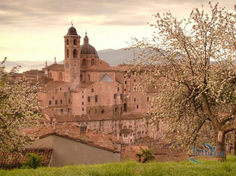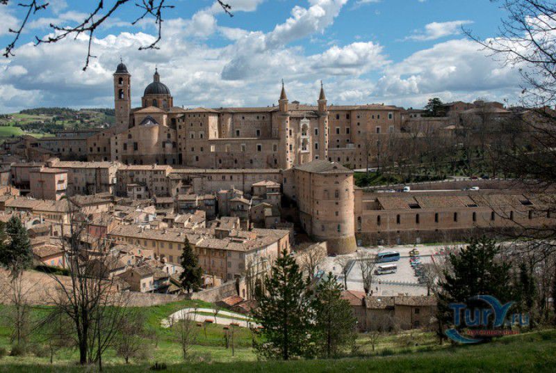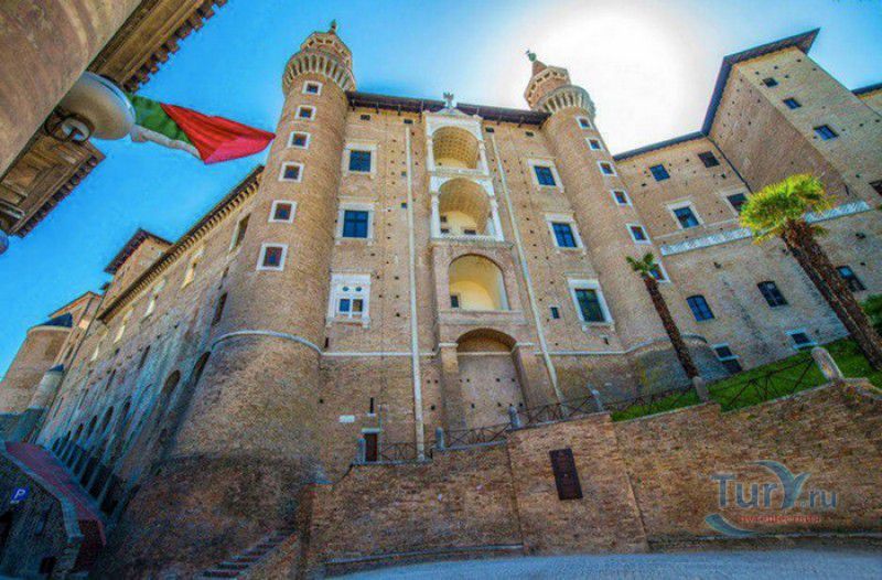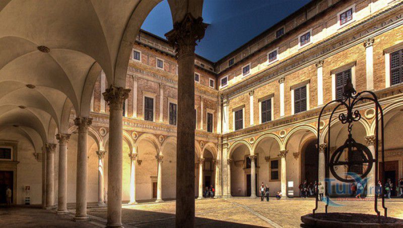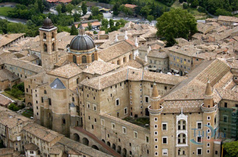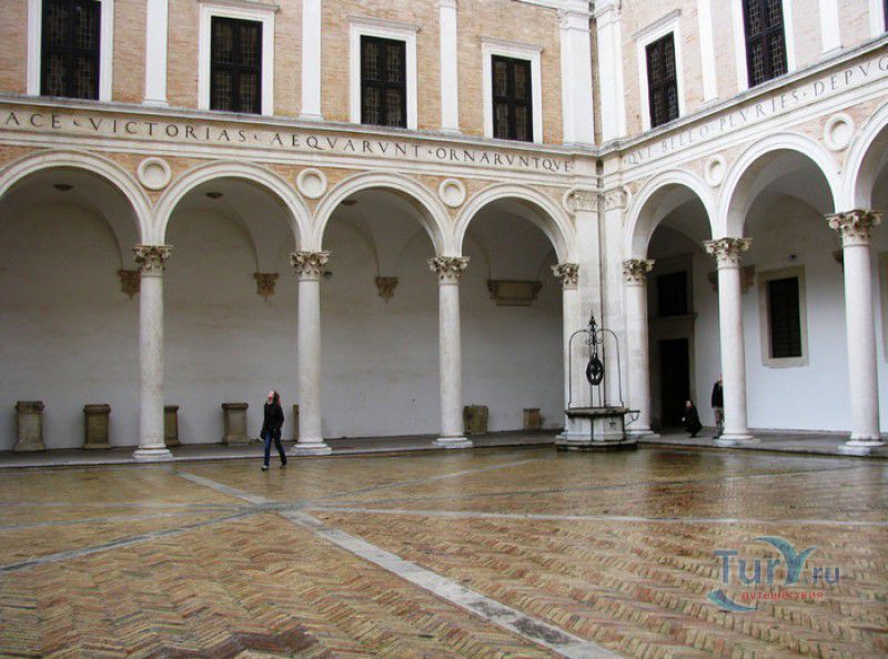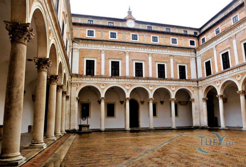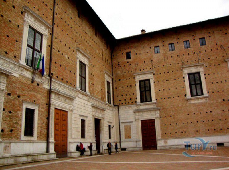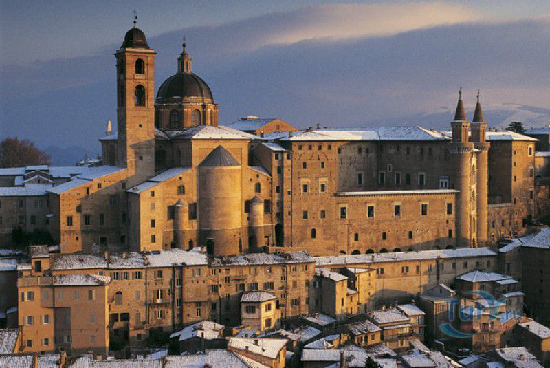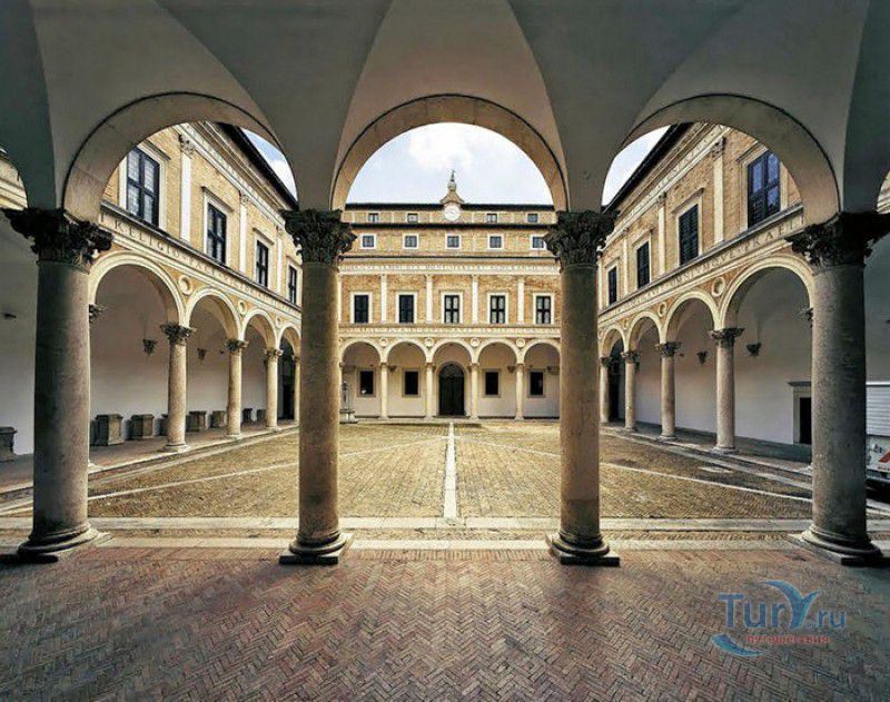 Дворец Герцогов Урбино (Палаццо Дукале) - бывшая резиденция дожей Урбино, расположен в историческом центре города Урбино, в составе которого в 1998 году внесен в список Всемирного наследия ЮНЕСКО. Строительство дворца было начато в 1459 году по приказу герцога Федерика да Монтефельтро, ставшего правителем Урбино в 1444 году. Свою лепту в строительство величественного дворца в стиле ренессанс внесли три известных итальянских архитектора - флорентиец Мазо ди Бартоломео, Лучано де Лаурана из Далмации и Франческо ди Джорджо Мартини из Сиены. Над оформлением внутреннего убранства работали лучшие художники и скульпторы того времени - Пьеро делла Франческа, Амброджио Бароччи, Педро Берругете, Джованни Боккати, Юстус ван Гент. Палаццо Дукале должен был стать одновременно и укреплённой герцогской резиденцией, и роскошным дворцом, соответствующим статусу его владельца - гуманиста и мецената, покровителя искусства и науки. Дворец, по задумке Федерика да Монтефельтро, должен был стать воплощением "идеального города", концепция которого (гармония, красота и функциональность) была изложена ещё Платоном. После смерти герцога в 1482 году строительные работы приостановились и были завершены только в XVI веке. Герцогский Дворец в Урбино приобрёл славу идеальной резиденции для просвещённого монарха, его величественный фасад с двумя элегантными башнями-близнецами, виден из любой точки города. Архитектурными "изюминками" палаццо являются внутренний двор с крытыми арочными галереями, лёгкие пропорции открытых лоджий на фасаде и изящный скульптурный декор оконных наличников и входных порталов. Во внутренние помещения дворца ведёт парадная мраморная лестница. На первом этаже, выходящем во внутренний двор, находилась знаменитая герцогская библиотека, которая располагала огромным собранием старинных манускриптов. Во дворце также есть несколько помещений, оформление которых отражает увлечение герцога Фредерико античными искусством и литературой, наукой, поэзией и музыкой - лариум (святилище античного типа) и студиоло (небольшой кабинет), на стенах которого с помощью художественной техники интарсия (инкрустации, выполняемой деревом по дереву) изображены полки с книгами, астрономическими и музыкальными инструментами, а также символами свободных искусств. Верхнюю часть стен кабинета украшают двадцать восемь портретов выдающихся личностей (философов, учёных, поэтов, религиозных деятелей), в числе которых - Платон, Аристотель, Моисей, Петрарка, Гиппократ, Цицерон, Данте, Соломон, Сенека, Святой Августин, папа Пий II и другие. Из студиоло можно было попасть в парные часовни - христианскую "Часовню отпущения грехов" и языческую, получившую название "Храм муз". На втором этаже располагались парадные апартаменты - Зал почёта (Тронный зал), Зал Рыцарей и героев, Зал для аудиенций, Зал короля Англии и альков герцога Федерико да Монтефельтро. Комнаты были богато украшены позолоченной штукатуркой, скульптурным декором, наборными люнетами, фресками, изящными рельефами из мрамора, терракоты или майолики и мраморными каминами. В подвалах дворца располагались хозяйственные помещения - кухня, кладовые, прачечная, "ледяная" комната, в которой хранились съестные припасы, здесь же можно увидеть остатки старого водопровода, снабжавшего водой Палаццо Дукале. В 1625 год