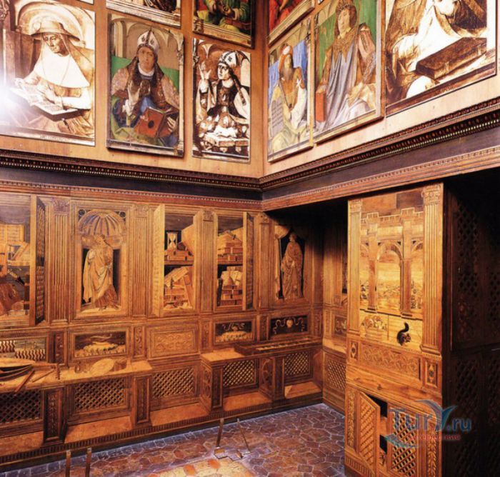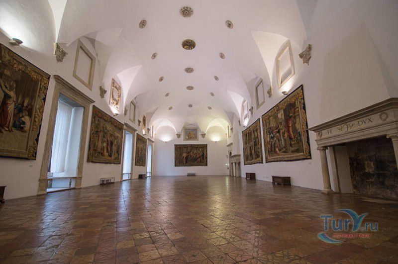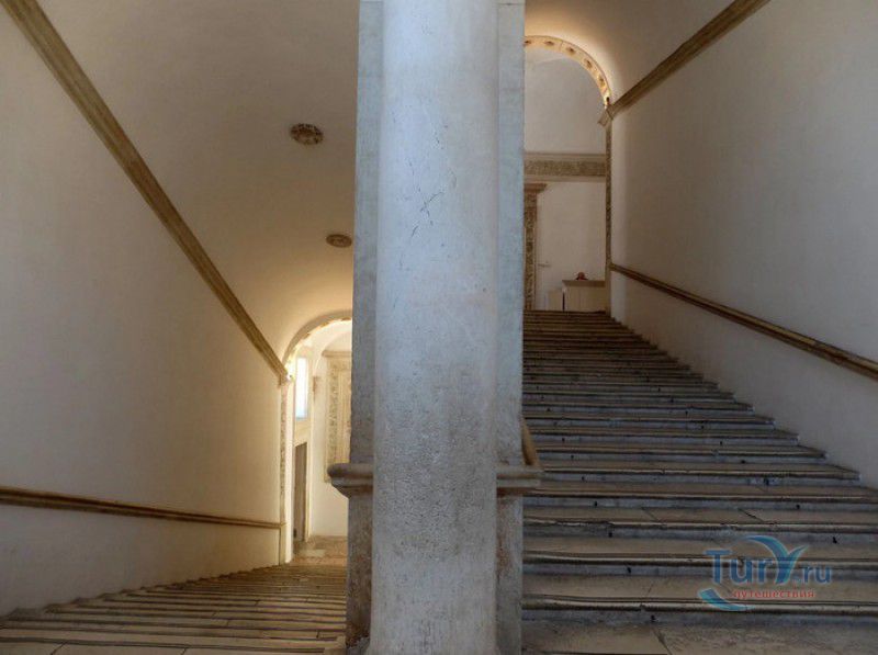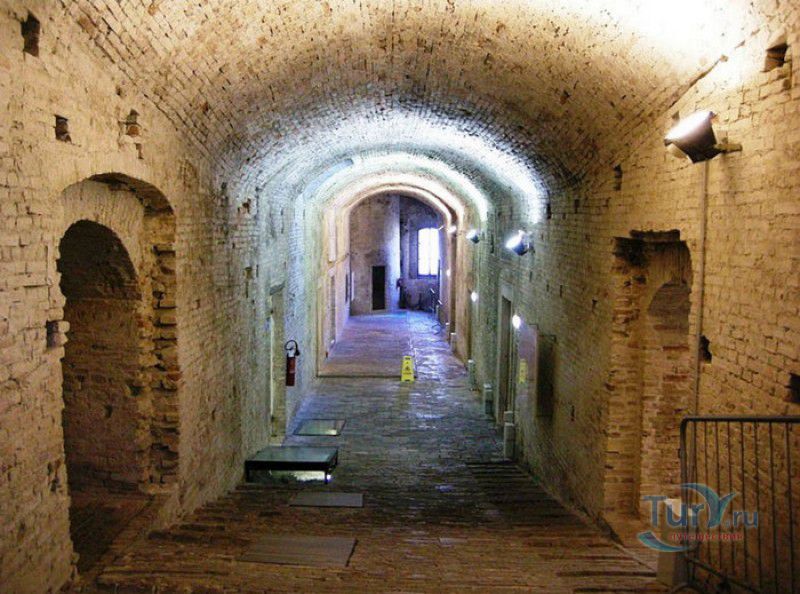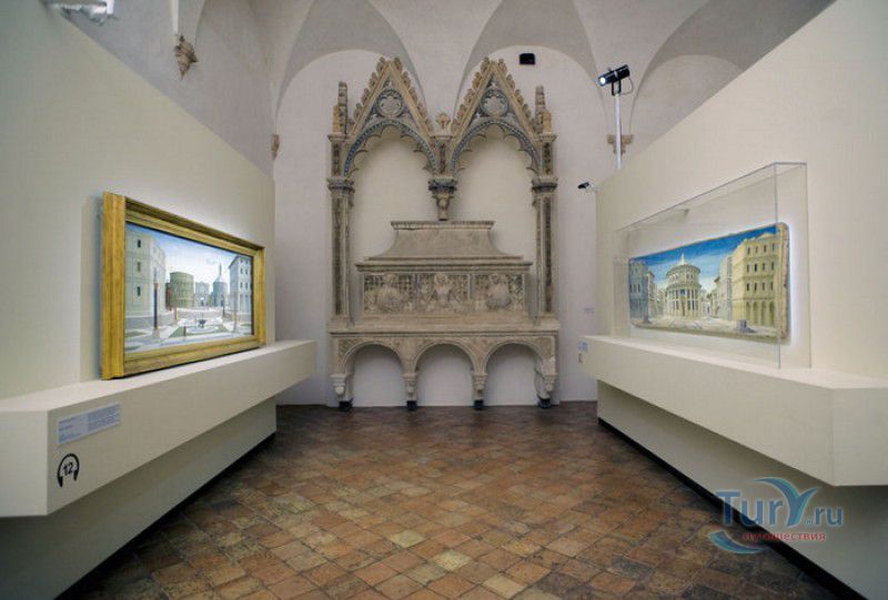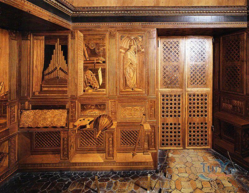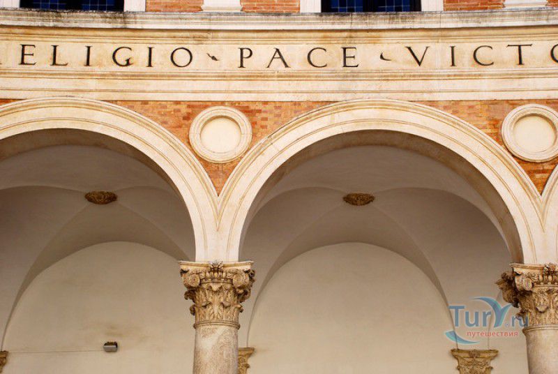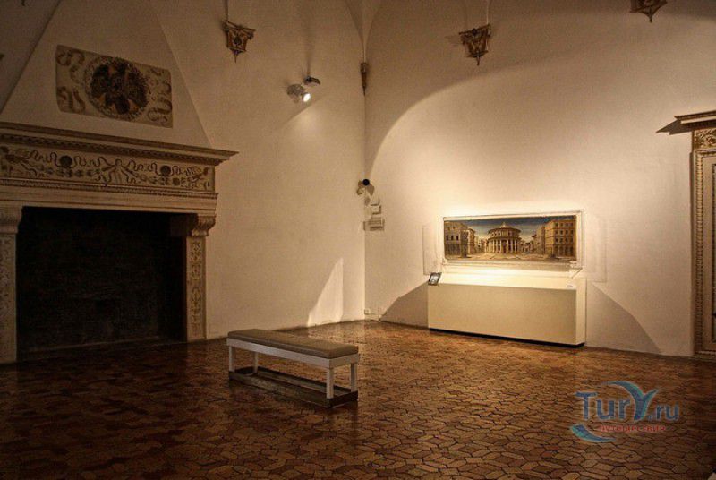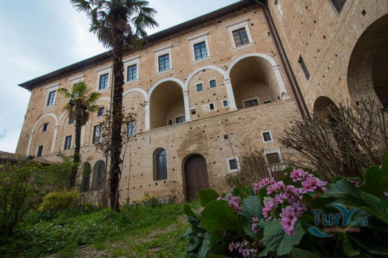 Дворец Герцогов Урбино (Палаццо Дукале) - бывшая резиденция дожей Урбино, расположен в историческом центре города Урбино, в составе которого в 1998 году внесен в список Всемирного наследия ЮНЕСКО. Строительство дворца было начато в 1459 году по приказу герцога Федерика да Монтефельтро, ставшего правителем Урбино в 1444 году. Свою лепту в строительство величественного дворца в стиле ренессанс внесли три известных итальянских архитектора - флорентиец Мазо ди Бартоломео, Лучано де Лаурана из Далмации и Франческо ди Джорджо Мартини из Сиены. Над оформлением внутреннего убранства работали лучшие художники и скульпторы того времени - Пьеро делла Франческа, Амброджио Бароччи, Педро Берругете, Джованни Боккати, Юстус ван Гент. Палаццо Дукале должен был стать одновременно и укреплённой герцогской резиденцией, и роскошным дворцом, соответствующим статусу его владельца - гуманиста и мецената, покровителя искусства и науки. Дворец, по задумке Федерика да Монтефельтро, должен был стать воплощением "идеального города", концепция которого (гармония, красота и функциональность) была изложена ещё Платоном. После смерти герцога в 1482 году строительные работы приостановились и были завершены только в XVI веке. Герцогский Дворец в Урбино приобрёл славу идеальной резиденции для просвещённого монарха, его величественный фасад с двумя элегантными башнями-близнецами, виден из любой точки города. Архитектурными "изюминками" палаццо являются внутренний двор с крытыми арочными галереями, лёгкие пропорции открытых лоджий на фасаде и изящный скульптурный декор оконных наличников и входных порталов. Во внутренние помещения дворца ведёт парадная мраморная лестница. На первом этаже, выходящем во внутренний двор, находилась знаменитая герцогская библиотека, которая располагала огромным собранием старинных манускриптов. Во дворце также есть несколько помещений, оформление которых отражает увлечение герцога Фредерико античными искусством и литературой, наукой, поэзией и музыкой - лариум (святилище античного типа) и студиоло (небольшой кабинет), на стенах которого с помощью художественной техники интарсия (инкрустации, выполняемой деревом по дереву) изображены полки с книгами, астрономическими и музыкальными инструментами, а также символами свободных искусств. Верхнюю часть стен кабинета украшают двадцать восемь портретов выдающихся личностей (философов, учёных, поэтов, религиозных деятелей), в числе которых - Платон, Аристотель, Моисей, Петрарка, Гиппократ, Цицерон, Данте, Соломон, Сенека, Святой Августин, папа Пий II и другие. Из студиоло можно было попасть в парные часовни - христианскую "Часовню отпущения грехов" и языческую, получившую название "Храм муз". На втором этаже располагались парадные апартаменты - Зал почёта (Тронный зал), Зал Рыцарей и героев, Зал для аудиенций, Зал короля Англии и альков герцога Федерико да Монтефельтро. Комнаты были богато украшены позолоченной штукатуркой, скульптурным декором, наборными люнетами, фресками, изящными рельефами из мрамора, терракоты или майолики и мраморными каминами. В подвалах дворца располагались хозяйственные помещения - кухня, кладовые, прачечная, "ледяная" комната, в которой хранились съестные припасы, здесь же можно увидеть остатки старого водопровода, снабжавшего водой Палаццо Дукале. В 1625 год
