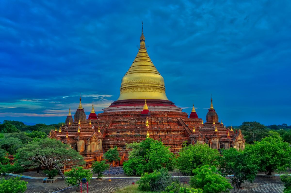 Расположенная в отдаленном районе равнины Баган, великолепная пагода Дхаммайазика. Пагода была построена королем Нарапатиситу в конце XII века, для сохранения ряда священных буддийских реликвий, подаренных ему королем Шри-Ланки.