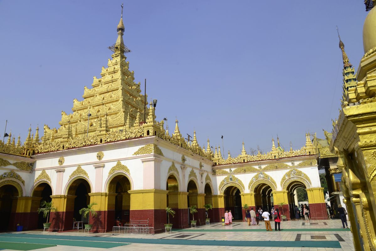 Храм или Пагода Махамуни - это комплекс сооружений, расположенных вдоль дороги от Мандалая, ведущей на юго-запад. Первоначально он был расположен на кирпичной асфальтированной дороге, которая вела из Королевского дворца короля Бодапайи к восточным воротам храма, до сих пор еще можно увидеть руины этой дороги. Один из многих монастырей, которые примыкают к Пагоде, является одним из крупнейших бирманских монастырей, и насчитывает около 400 монахов ордена Тудхаммы Никая. Храм имеет центральную святыню и обрамлен обширным садом с газоном. В аркадах, ведущих к главной святыне, есть много киосков, продающих религиозные атрибуты, такие как фимиам, свечи, розарии, цветы, халаты, сандалии и т. д., а также различные рестораны и чайные магазины. Святилище, где располагается большой образ махамуни, представляет собой небольшую камеру и имеет крышу, состоящую из семи ярусов. Потолок покрыт богатым орнаментом. Аркады поддерживаются 252 золочеными и резными колоннами, украшенными прекрасными фресками.