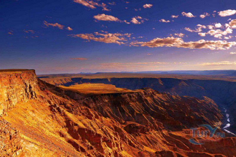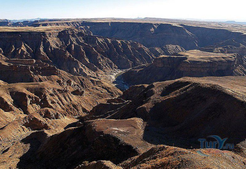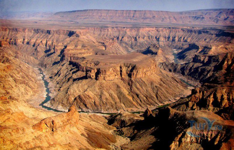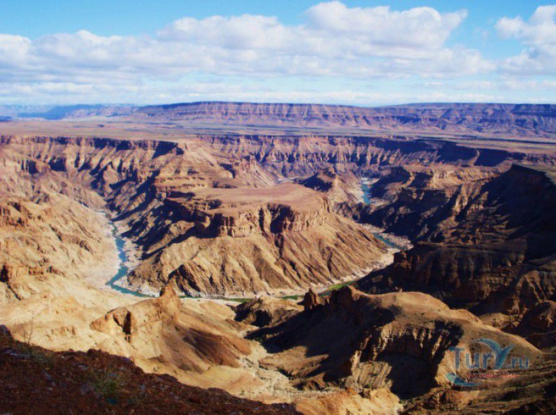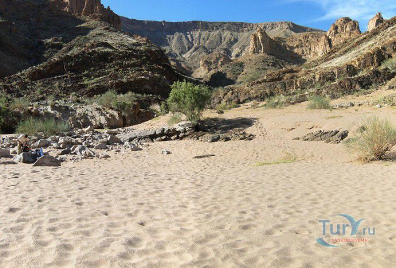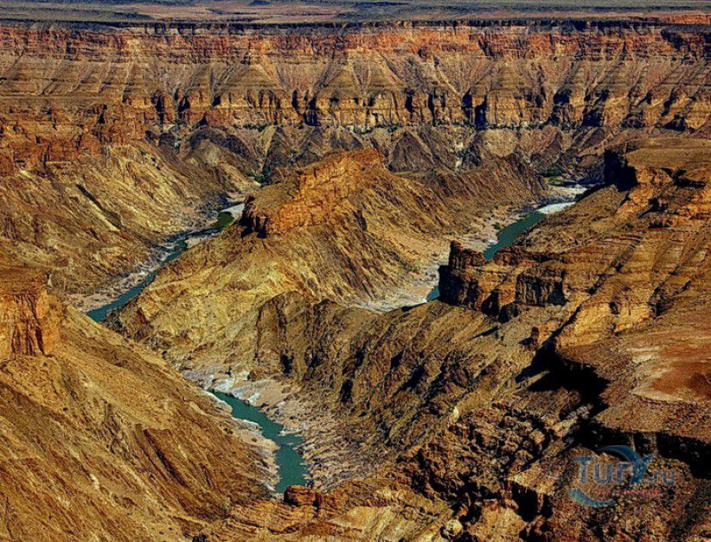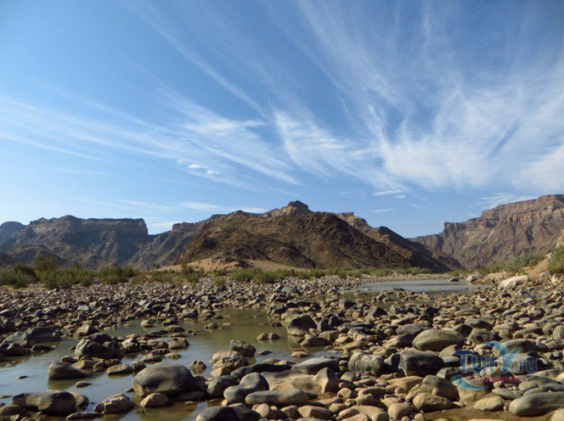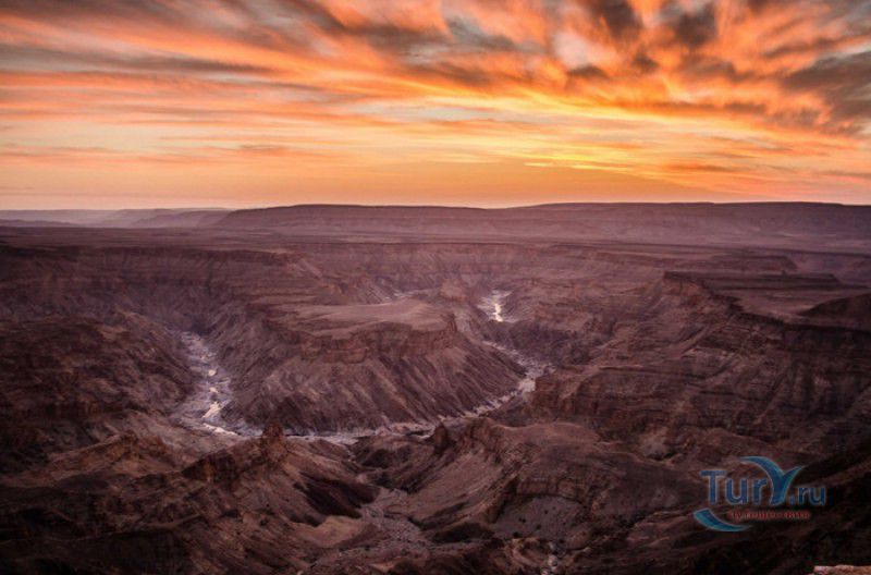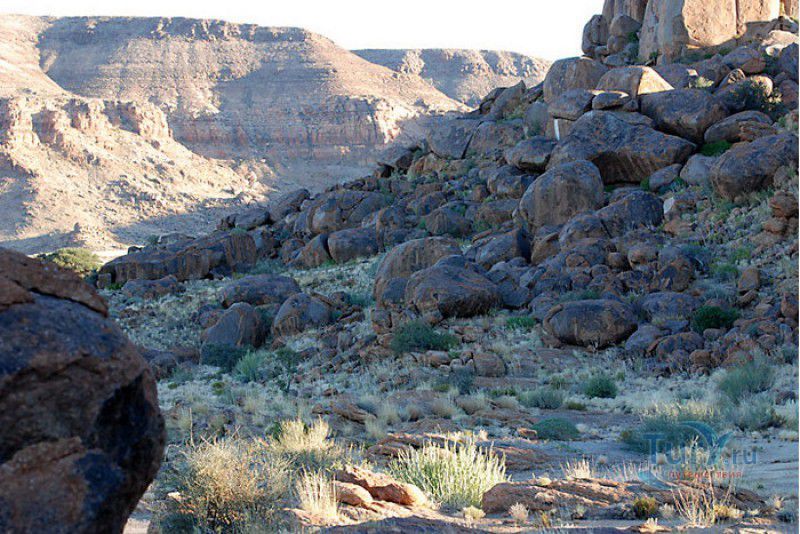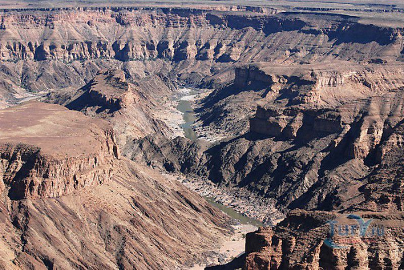 Фиш Ривер Каньон (Каньон Рыбной Реки) - второй по величине каньон в мире после аризонского Гранд-Каньона, расположен на юге Намибии и является частью трансграничного парка Ai-Ais Richtersveld Transfrontier Park. Каньон образован в результате тектонической активности на поверхности Земли более 500 миллионов лет назад и водной эрозии - тысячелетиями Рыбная река (самая большая река Намибии) прокладывала себе путь через каменистое плато, возникшее в результате разлома земной коры. Длина каньона - 161 километр, ширина - 27 километров, глубина - 550 метров. По дну ущелья протекает Фиш Ривер, полноводной река бывает только в сезон дождей, в течение двух-трёх месяцев, в засушливый период она мелеет и распадается на небольшие озерца. Пейзажи Каньона Рыбной Реки суровы и достаточно мрачны - гигантские тёмные базальтовые скалы, отвесные обрывы и глубокие ущелья. Скалы состоят из сланцев, песчаника и магматических пород, под солнечными лучами переливающихся оттенками коричневого, зелёного, оранжевого и чёрного цветов. Посетить одну из главных природных достопримечательностей Намибии возможно только в зимний период, с середины апреля до середины сентября. Летом, с октября по март, температура воздуха здесь поднимается до 50°C, свирепствуют сильные грозы и выпадает много осадков, превращая реку Фиш Ривер в бурный поток. Северный вход в каньон расположен у кемпинга Hobas Campsite, в 10 километрах от него находится главная смотровая площадка Main Viewpoint, с которой открывается потрясающий вид на ущелье, в двух километрах к северу от неё расположена обзорная площадка Hikers’ Viewpoint, с которой можно увидеть изгиб русла Фиш Ривер, так называемый Адский изгиб (Hell's Bend). Отсюда начинается один из самых трудных и опасных туристических маршрутов в Намибии - пятидневный поход по дну каньона Рыбной Реки. Чтобы отправиться в поход, необходимо получить специальное разрешение, иметь хорошую физическую подготовку и предъявить медицинскую справку о состоянии здоровья. Группы от 3 до 30 человек, под руководством опытных проводников, пройдут 85 километров вдоль русла реки, будут ночевать под открытым небом, обходиться без благ цивилизации и нести на плечах всё необходимое снаряжение (вес поклажи достигает 15 кг). Тем не менее, тур пользуется огромной популярностью - суровая красота природы, грозные утёсы и причудливые скальные скульптуры, необыкновенной красоты рассветы и закаты, и невероятное звёздное небо с отчётливо видимым Млечным путём. Конечная (южная) точка маршрута - сернистые термальные источники Ai Ais Resort, здесь усталые путники могут отдохнуть и принять целебные горячие ванны. На курорте есть много вариантов размещения - от палаточных лагерей до роскошных апартаментов.