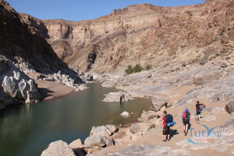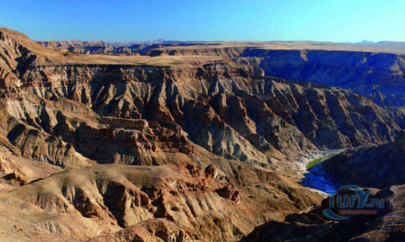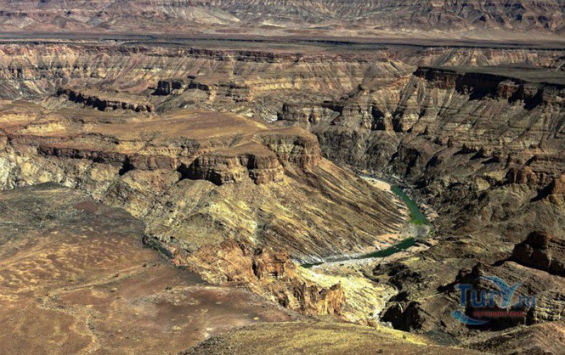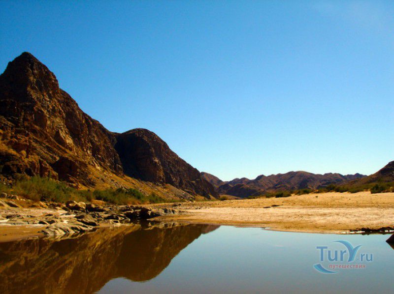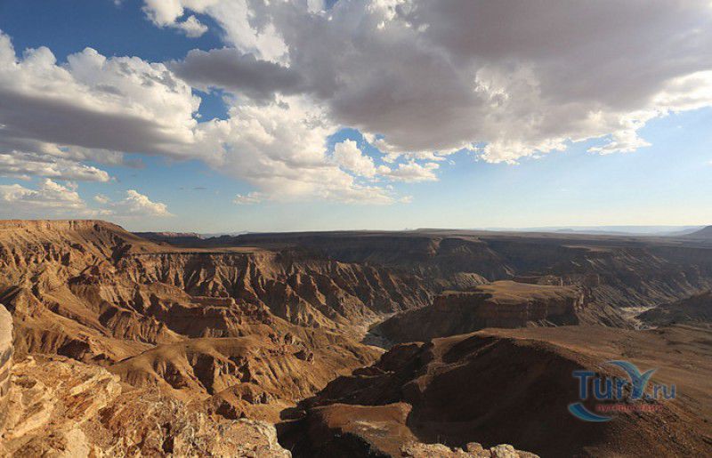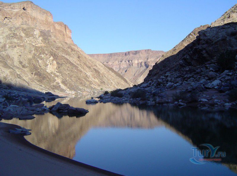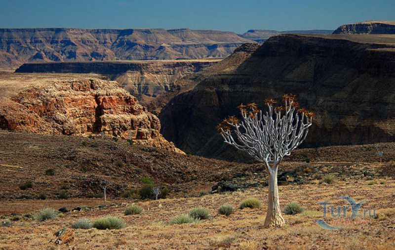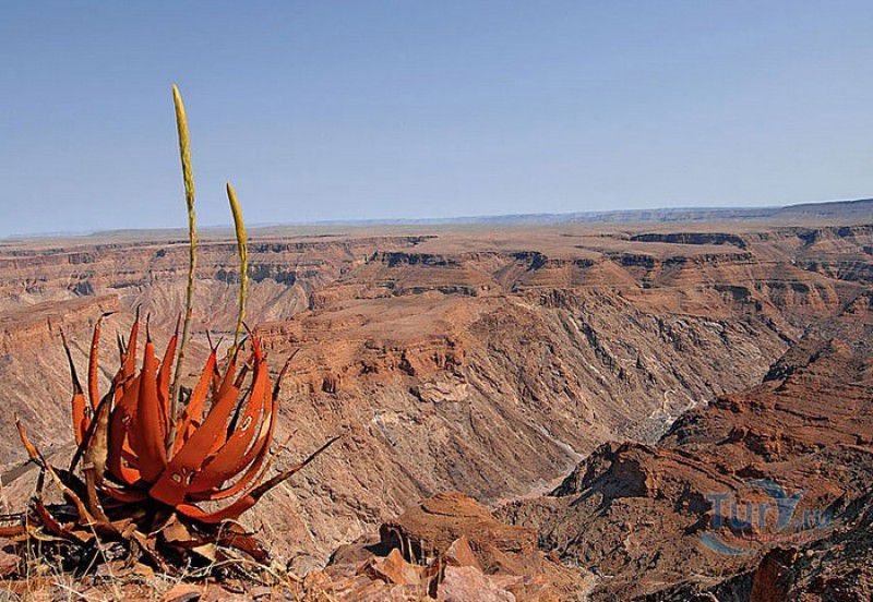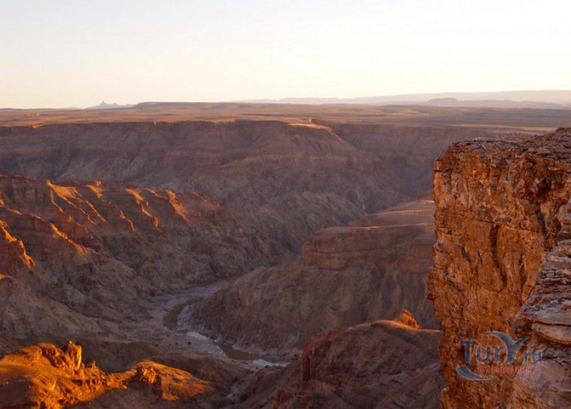 Фиш Ривер Каньон (Каньон Рыбной Реки) - второй по величине каньон в мире после аризонского Гранд-Каньона, расположен на юге Намибии и является частью трансграничного парка Ai-Ais Richtersveld Transfrontier Park. Каньон образован в результате тектонической активности на поверхности Земли более 500 миллионов лет назад и водной эрозии - тысячелетиями Рыбная река (самая большая река Намибии) прокладывала себе путь через каменистое плато, возникшее в результате разлома земной коры. Длина каньона - 161 километр, ширина - 27 километров, глубина - 550 метров. По дну ущелья протекает Фиш Ривер, полноводной река бывает только в сезон дождей, в течение двух-трёх месяцев, в засушливый период она мелеет и распадается на небольшие озерца. Пейзажи Каньона Рыбной Реки суровы и достаточно мрачны - гигантские тёмные базальтовые скалы, отвесные обрывы и глубокие ущелья. Скалы состоят из сланцев, песчаника и магматических пород, под солнечными лучами переливающихся оттенками коричневого, зелёного, оранжевого и чёрного цветов. Посетить одну из главных природных достопримечательностей Намибии возможно только в зимний период, с середины апреля до середины сентября. Летом, с октября по март, температура воздуха здесь поднимается до 50°C, свирепствуют сильные грозы и выпадает много осадков, превращая реку Фиш Ривер в бурный поток. Северный вход в каньон расположен у кемпинга Hobas Campsite, в 10 километрах от него находится главная смотровая площадка Main Viewpoint, с которой открывается потрясающий вид на ущелье, в двух километрах к северу от неё расположена обзорная площадка Hikers’ Viewpoint, с которой можно увидеть изгиб русла Фиш Ривер, так называемый Адский изгиб (Hell's Bend). Отсюда начинается один из самых трудных и опасных туристических маршрутов в Намибии - пятидневный поход по дну каньона Рыбной Реки. Чтобы отправиться в поход, необходимо получить специальное разрешение, иметь хорошую физическую подготовку и предъявить медицинскую справку о состоянии здоровья. Группы от 3 до 30 человек, под руководством опытных проводников, пройдут 85 километров вдоль русла реки, будут ночевать под открытым небом, обходиться без благ цивилизации и нести на плечах всё необходимое снаряжение (вес поклажи достигает 15 кг). Тем не менее, тур пользуется огромной популярностью - суровая красота природы, грозные утёсы и причудливые скальные скульптуры, необыкновенной красоты рассветы и закаты, и невероятное звёздное небо с отчётливо видимым Млечным путём. Конечная (южная) точка маршрута - сернистые термальные источники Ai Ais Resort, здесь усталые путники могут отдохнуть и принять целебные горячие ванны. На курорте есть много вариантов размещения - от палаточных лагерей до роскошных апартаментов.