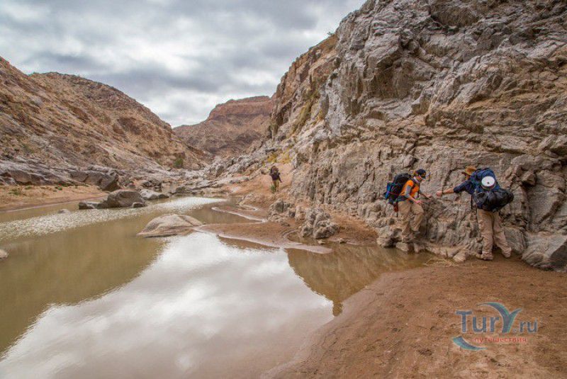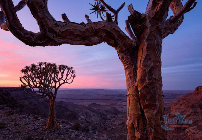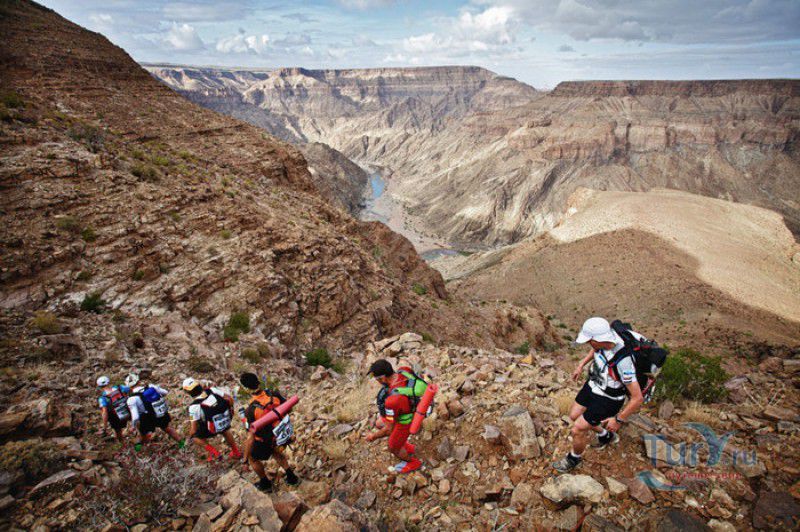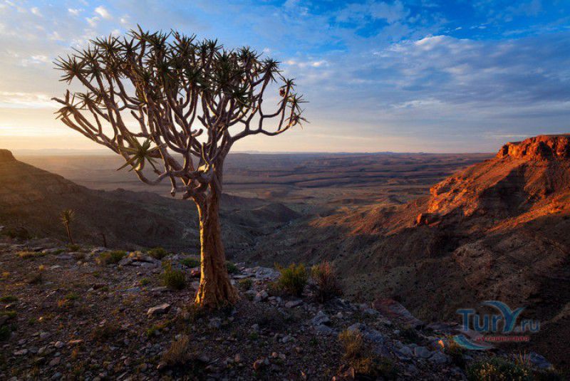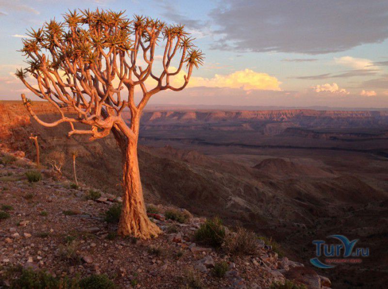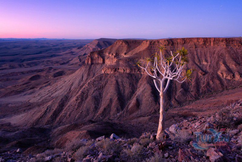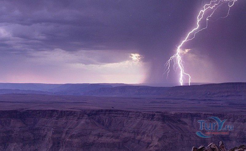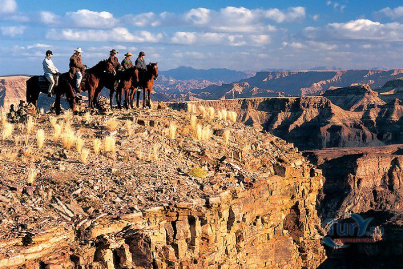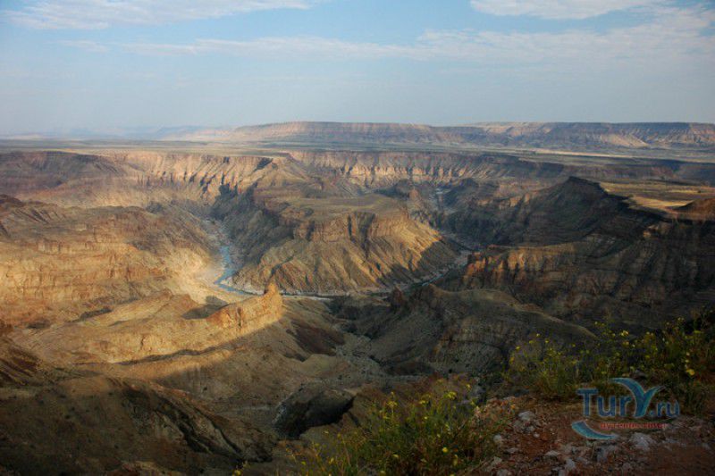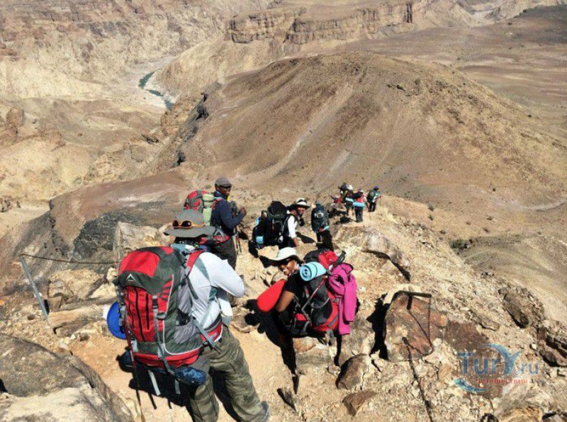 Фиш Ривер Каньон (Каньон Рыбной Реки) - второй по величине каньон в мире после аризонского Гранд-Каньона, расположен на юге Намибии и является частью трансграничного парка Ai-Ais Richtersveld Transfrontier Park. Каньон образован в результате тектонической активности на поверхности Земли более 500 миллионов лет назад и водной эрозии - тысячелетиями Рыбная река (самая большая река Намибии) прокладывала себе путь через каменистое плато, возникшее в результате разлома земной коры. Длина каньона - 161 километр, ширина - 27 километров, глубина - 550 метров. По дну ущелья протекает Фиш Ривер, полноводной река бывает только в сезон дождей, в течение двух-трёх месяцев, в засушливый период она мелеет и распадается на небольшие озерца. Пейзажи Каньона Рыбной Реки суровы и достаточно мрачны - гигантские тёмные базальтовые скалы, отвесные обрывы и глубокие ущелья. Скалы состоят из сланцев, песчаника и магматических пород, под солнечными лучами переливающихся оттенками коричневого, зелёного, оранжевого и чёрного цветов. Посетить одну из главных природных достопримечательностей Намибии возможно только в зимний период, с середины апреля до середины сентября. Летом, с октября по март, температура воздуха здесь поднимается до 50°C, свирепствуют сильные грозы и выпадает много осадков, превращая реку Фиш Ривер в бурный поток. Северный вход в каньон расположен у кемпинга Hobas Campsite, в 10 километрах от него находится главная смотровая площадка Main Viewpoint, с которой открывается потрясающий вид на ущелье, в двух километрах к северу от неё расположена обзорная площадка Hikers’ Viewpoint, с которой можно увидеть изгиб русла Фиш Ривер, так называемый Адский изгиб (Hell's Bend). Отсюда начинается один из самых трудных и опасных туристических маршрутов в Намибии - пятидневный поход по дну каньона Рыбной Реки. Чтобы отправиться в поход, необходимо получить специальное разрешение, иметь хорошую физическую подготовку и предъявить медицинскую справку о состоянии здоровья. Группы от 3 до 30 человек, под руководством опытных проводников, пройдут 85 километров вдоль русла реки, будут ночевать под открытым небом, обходиться без благ цивилизации и нести на плечах всё необходимое снаряжение (вес поклажи достигает 15 кг). Тем не менее, тур пользуется огромной популярностью - суровая красота природы, грозные утёсы и причудливые скальные скульптуры, необыкновенной красоты рассветы и закаты, и невероятное звёздное небо с отчётливо видимым Млечным путём. Конечная (южная) точка маршрута - сернистые термальные источники Ai Ais Resort, здесь усталые путники могут отдохнуть и принять целебные горячие ванны. На курорте есть много вариантов размещения - от палаточных лагерей до роскошных апартаментов.