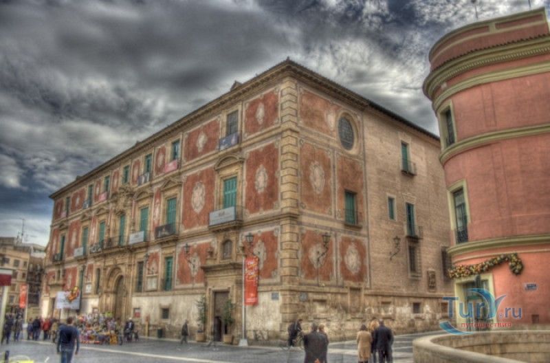 Епископский Дворец расположен в старой части города Мурсия, на площади Кардинала Бельюга, рядом с Кафедральным собором. Строительство дворца-резиденции епископа Картахены велось в 1748-1768 годах, в его строительстве принимали участие лучшие мастера-каменщики того времени. Существует предание, что дворец построен по указу епископа Хуана Матео, пожелавшего видеть из окон своей резиденции великолепный фасад недавно построенного Кафедрального собора Мурсии. Епископский дворец состоит из двух соединённых между собой зданий. В первую очередь была возведена так называемая "смотровая площадка епископа" или "дворцовый молот" - возвышающееся над остальной частью дворца здание, построенное, чтобы обеспечить вид на реку Сегура и набережную Пасео дель Аренал. Главный корпус дворца был построен чуть позже, в его архитектуре явно прослеживается влияние позднего итальянского маньеризма. Декоративное оформление фасада напоминает римские и неаполитанские дворцы - фресковые орнаменты, декоративные фризы, геральдические щиты. Центральный арочный портал с балконом и два боковых входа выполнены по подобию дворца Фарнезе в Риме, над оформлением которого работал сам Микеланджело. Внутренний двор Епископского дворца представляет собой патио, образованное тремя аркадами дорического ордера. Интерьер дворца оформлен в стилях барокко и рококо. Парадная (императорская) лестница дворца, выполненная в стиле римского барокко, соединяет аркаду внутреннего двора с первым этажом резиденции. Лестницу украшают медальоны с гербами всех епископов Картахены, витражные окна и огромная кованая люстра. Небольшая епископская часовня, построенная в 1744 году, имеет круглую форму, оформлена в стилях барокко и рококо - колонны с коринфскими пилястрами, декоративный карниз с лепниной, пол из цветного мрамора, мраморный алтарь и хрустальные люстры. В ознаменование окончания строительства Епископский дворца над балконом центрального портала был размещён щит с гербом епископа Роха, при котором работы по возведению резиденции были завершены.
