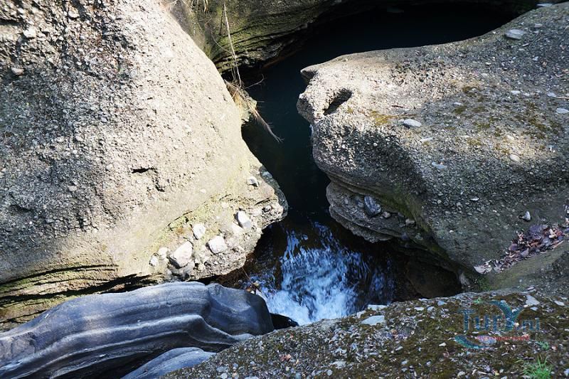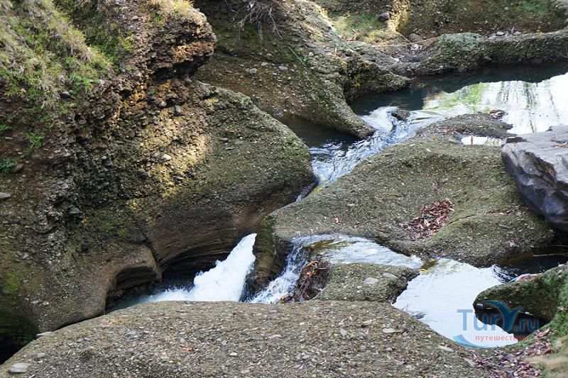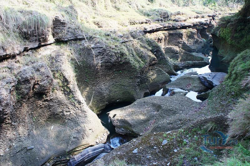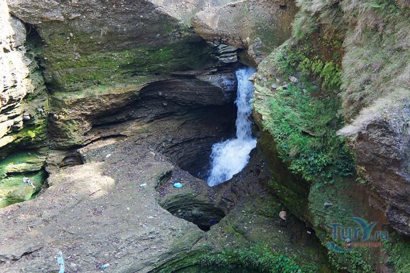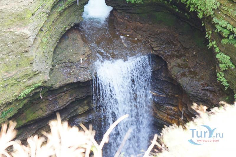 Глубокое и темное ущелье, поросшее папоротником и мхом уходит вниз на головокружительную глубину. Причудливо изгибаясь, скальные породы образуют извилистые тупики и провалы, ведущие в подземные пещеры. Дополняет этот шедевр природы неиссякаемый водопад искрящейся кристальной воды, неустанно падающий в темный провал ущелья.