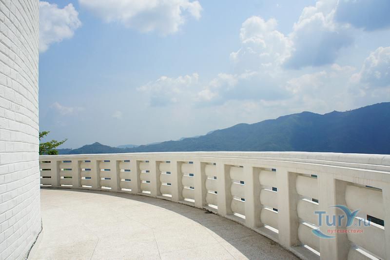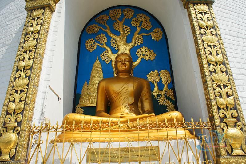 Круглая белоснежная башня ступы стремится в небо, а по 4 сторонам света располагаются священные статуи.