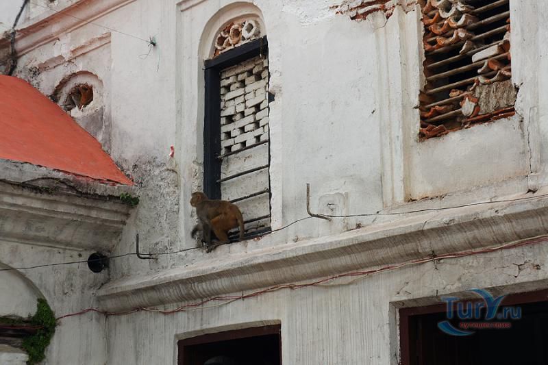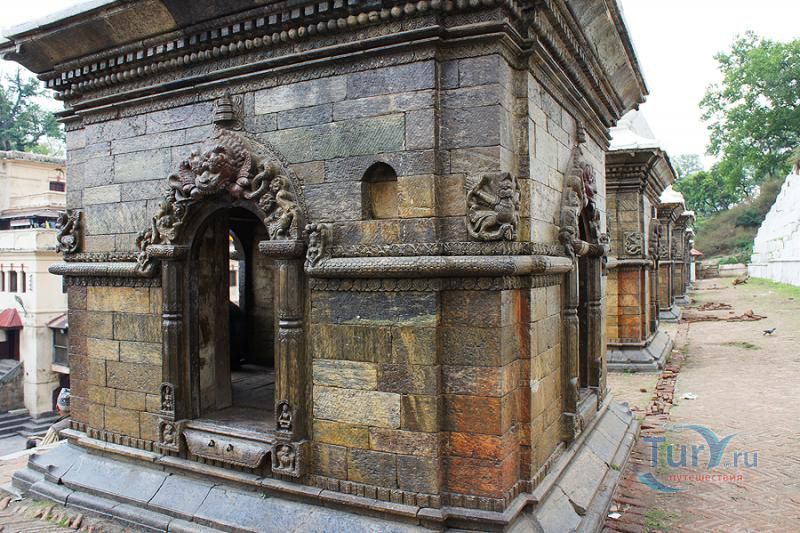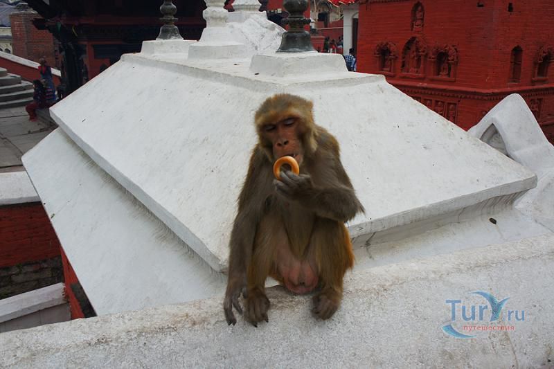 На другой стороне реки — 11 маленьких храмов Шивы с лингамами, за которыми стоят галереи шиваистских лингамов и йони. Всего в комплексе 108 лингамов. По ступеням поднимаешься в обезьяний парк, где сотни обезьян прыгают и висят на ветках. Пашупати — покровитель животных, поэтому обезьянам уютно у храмов комплекса.