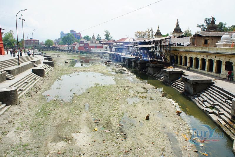 На западном берегу реки стоят основные храмы, в большой храмовый двор вход закрыт для неиндусов, но комплекс хорошо просматривается с другого берега реки, и можно наблюдать погребальные церемонии. Вдоль реки расположены постаменты для погребальных костров. У храмов — дом ожидающих смерти, куда приходят старики, и живут там последние недели под присмотром астрологов, точно определяющих момент их смерти. К северу от моста сжигают представителей высших каст, специальный постамент — для членов королевского рода. К югу от моста — постаменты для низких каст. Погребальный ритуал довольно сложен, правильное его исполнение способствует хорошему перерождению в следующей реинкарнации. После сожжения прах пускают вниз по реке. В Багмати, как в Ганге, купаются для ритуального очищения. Там же омывают мёртвых перед погребением. По реке пускают вещи, которые ниже вылавливают йоги.