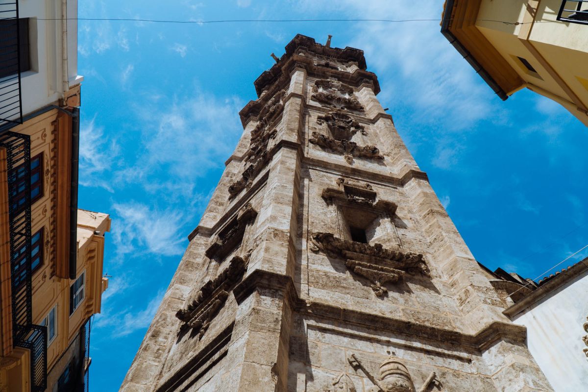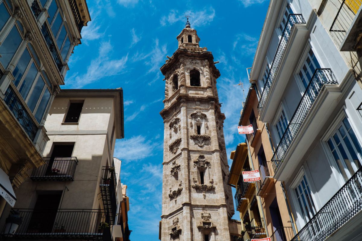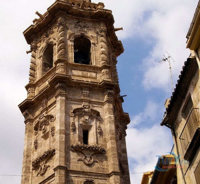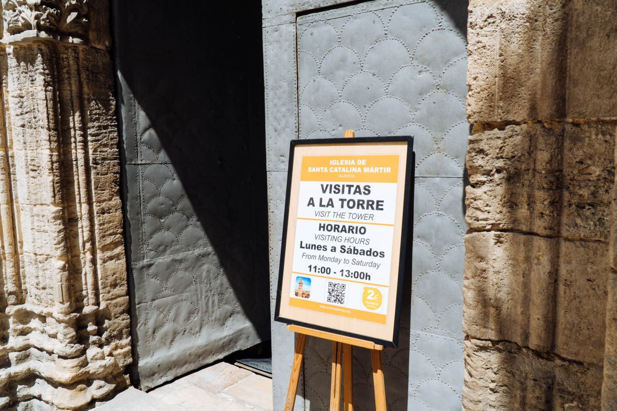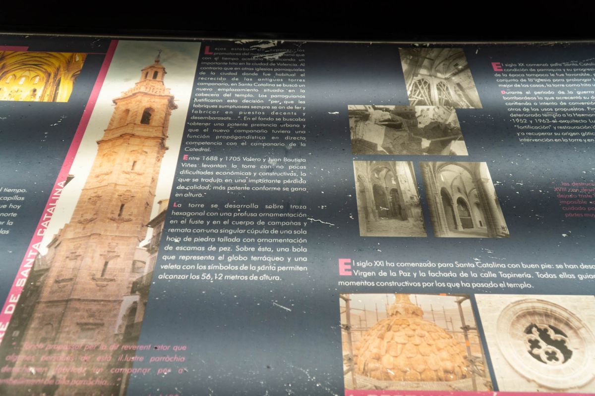 Церковь Святой Каталины расположена в историческом центре города Валенсия, в пяти минутах ходьбы от Кафедрального собора. Церковь была возведена на месте разрушенной арабской мечети в 1245 году, во времена правления короля Хайме I, завоевавшего Валенсию в 1238 году и изгнавшего мавров с территории королевства. Именно Хайме I повелел освятить новую церковь в честь мученицы Святой Каталины и основал приход, названный её именем. Изначально церковь была построена в стиле средиземноморской готики, однако, за последующие столетия её неоднократно перестраивали, благодаря чему внешний облик храма приобрёл черты других архитектурных стилей. Так, после сильного пожара 1548 года, уничтожившего главный алтарь и боковые капеллы церкви, здание пришлось практически заново перестраивать, во время реконструкции фасад церкви был оформлен в стиле Ренессанс. В 1785 году, следуя моде того времени, здание церкви Святой Каталины было перестроено в стиле барокко. В 1936 году, во время гражданской войны в Испании, в церкви снова вспыхнул пожар, нанесший зданию храма значительный ущерб. В ходе реставрационных работ, которые проводились в 1950-1960 годах под руководством архитектора Луиса Гая Рамоса, церкви был возвращён её первоначальный готический облик. Церковь имеет один неф, многоугольную апсиду с ребристыми готическими сводами, амбулаторий (обходную галерею за апсидой) и капеллы, разделённые боковыми контрфорсами. В храме три входа, главный портал, выходящий на площадь Лопе де Вега (Plaza de Lope de Vega), выполнен в стиле барокко и украшен рельефом с изображением королевской короны, над входом расположено большое окно-роза. Один из боковых входов ведёт на улицу Тапинерия, другой - на улицу Святой Каталины. Главной достопримечательностью церкви Святой Каталины является её 56-метровая колокольня, возведенная в 1688-1705 годах по проекту архитектора Хуана Баутисты Виньеса, имя которого выгравировано на мемориальной доске у подножия башни. Колокольня, построенная в стиле барокко, имеет шестиугольное форму, она состоит из четырёх ярусов, звонницы и венчающей её часовни с маленьким куполом и флюгером в виде креста. Этажи башни отделены друг от друга горизонтальными молдингами, каждая секция имеет окна, обрамлённые богатым барочным декором, выступы верхнего яруса украшены соломоновыми столбами (колоннами со спиральным стволом), часовню от звонницы отделяет ажурная каменная балюстрада. Шесть колоколов для церкви Святой Каталины были отлиты в Лондоне, в Валенсию они были доставлены в октябре 1729 года. 9 ноября 1729 года колокола были установлены на башне, а 21 ноября горожане услышали их первый звон. Подняться на самый верх колокольни можно по узкой винтовой лестнице, с вершины башни открывается красивый панорамный вид на Валенсию.