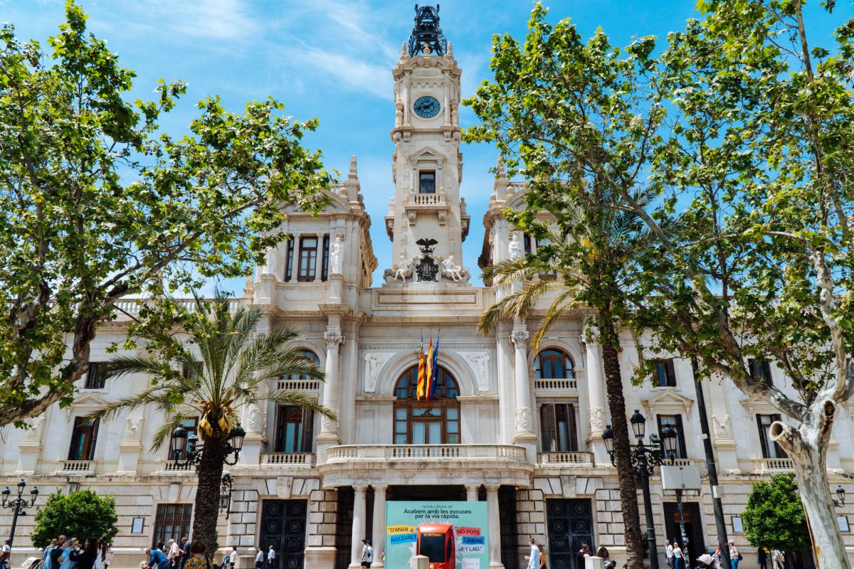 Ратуша Валенсии - одно из красивейших зданий города, расположено в самом центре Валенсии, на Ратушной площади. Ратуша состоит из двух соединённых между собой корпусов, построенных в разное время. Более старое здание, построенное в 1758-1763 годах в строгом академическом неоклассическом стиле, было возведено по инициативе архиепископа Валенсии Андреса Майораля и предназначалось для размещения в нём Королевского Дома образования (Casa de la Enseñanza). Первые два этажа учебного заведения были отведены под классные комнаты, на третьем этаже располагались спальни, кроме того, колледж имел свою часовню и хозяйственные помещения. В 1860 году в бывший Дом образования переехал Городской совет Валенсии, занимавший до этого здание, расположенное рядом с Дворцом Генералитета на площади Святой Девы Марии (из-за ветхости здание старой Ратуши было снесено в 1854 году). В 1904 году архитекторами Карлосом Карбонеллом и Франсиско Мора Беренгером был разработан проект по перестройке и расширению здания Дома образования, так как мэрии Валенсии понадобились новые помещения для проведения городских собраний, официальных приёмов, размещения архива и административных офисов. Также, для придания зданию Ратуши "монументальности и величия", проектом было предусмотрено строительство нового главного фасада в стиле Ренессанс и барокко. Первый камень в фундамент центрального корпуса был заложен 30 июня 1906 года мэром Валенсии Хосе Санчесом Бергоном. Главный фасад Валенсийской ратуши состоит из центральной части и двух боковых крыльев с угловыми круглыми башнями. Центральную часть венчает трёхэтажная башня с часами, балконом и карильоном. По обе стороны от часовой башни расположены квадратные башни, украшенные мраморными скульптурами, аллегорически изображающими христианские добродетели - Благоразумие, Справедливость, Умеренность и Мужество. Под часовой башней располагается большой каменный балкон, опирающийся на четыре колонны, под ним находится главный вход в здание Ратуши. Главный фасад здания богато украшен декоративными башенками, балконами, арочными окнами, коринфскими колоннами с пилястрами, горельефами и декоративной лепниной. Над главным балконом размещена бронзовая композиция с изображением герба Валенсии и двумя обнаженными женскими фигурами из белого мрамора, символизирующими Искусство и Литературу (работа скульптора Мариано Бенльюре). Фасад бывшего колледжа Casa de Enseñanza выходит на улицу Крови (Calle de la Sangre), на нём расположены бывший главный портал Королевского Дома образования, украшенный архиепископским гербом, и так называемый "балкон власти" с надписью "Ayuntamiento". Не менее богато декорированы и интерьеры Ратуши. Войдя в Ратушу через главный вход, посетители первым делом видят парадную лестницу из итальянского мрамора, ведущую на верхние этажи. Двупролётная неоклассическая лестница украшена ажурной балюстрадой, в центральной нише, увенчанной треугольным фронтоном, помещена мраморная скульптура Святое Сердце Иисуса работы Рамона Матеу Монтесиноса. По центру купола, расположенного над лестницей, размещено огромное витражное окно с изображением герба Валенсии. На втором этаже находится самый роскошный зал Ратуши - Банкетный салон (Хрустальный зал), который был торжественно открыт в 1929 году королём Альфонсо XIII. Огромный зал с овальным рас