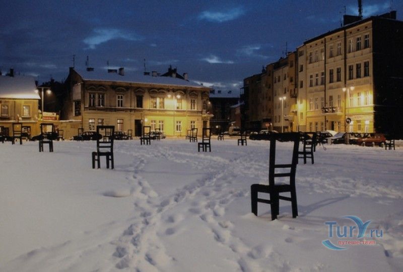 Мемориал Жертвам Краковского Гетто расположен в Кракове, на Площади Героев Гетто. В 1941-1943 годах в районе Подгуже, рядом с Площадью Согласия (с 2005 года - Площадь Героев Гетто) располагалось Краковское гетто, обнесённое трёхметровой бетонной стеной, выполненной в виде еврейских надгробий, выйти за пределы которой ни один живой "житель" еврейского квартала не мог. Перед началом Второй мировой войны в Кракове проживало более 64000 евреев (около 25% населения города), после отправки которых в начале войны в концентрационные лагеря, в городе оставалось не более 16000. Все евреи были согнаны в гетто, откуда их отправляли в концентрационные лагеря или в лагеря принудительного труда. Во время облав и транспортировки многие жители так называемого "Еврейского жилого района", прятавшиеся от фашистов или совершавшие попытку побега, расстреливались на месте. Среди сотен казнённых были художник Абрахам Ньюман и поэт Мордехай Гебиртиг. Фашисты не щадили стариков, детей и больных - все непригодные к работе и транспортировке были расстреляны. К 1942 году численность Краковских евреев снизилась в разы, гетто было разделено на две зоны, обнесенные колючей проволокой, - зона "А" предназначалась для тех, кто ещё был способен работать, зона "B" - для детей, престарелых и больных. В 1943 году всего за два дня (13 и 14 марта) гитлеровцы ликвидировали Краковское гетто - около 6000 евреев был отправлены в концентрационный лагерь в Плашове, а маленькие дети и их матери, больные и старики - расстреляны на плошали Согласия. Команды СС обшаривали здания на территории гетто, убивая всех, кто пытался спрятаться. В память об этих трагических событиях на месте Краковского гетто 8 декабря 2005 года был открыт Мемориал Жертвам Краковского Гетто. Он представляет собой ряды чугунных стульев, расположенных по периметру площади. Всего на площади установлено 70 стульев - 33 стула высотой 1,4 метра и 37 стульев высотой 1,2 метра. Эти стулья символизируют обезлюдевшие дома и улицы Краковского гетто, после ликвидации которого о жизни в еврейском квартале напоминала лишь валяющаяся на улицах мебель, выброшенная нацистами из квартир бывших жильцов, казнённых или угнанных в концлагеря. Здесь же, на площади, в доме №18 в те годы располагалась аптека "Под орлом", которой владел Тадеуш Панкевич - единственный поляк, живший на территории гетто. Панкевич был участником польского подполья и, рискуя собственной жизнью, помогал жителям гетто медикаментами. Сейчас здание бывшей аптеки занимает Музей Памяти.