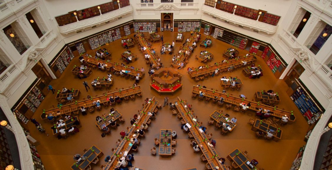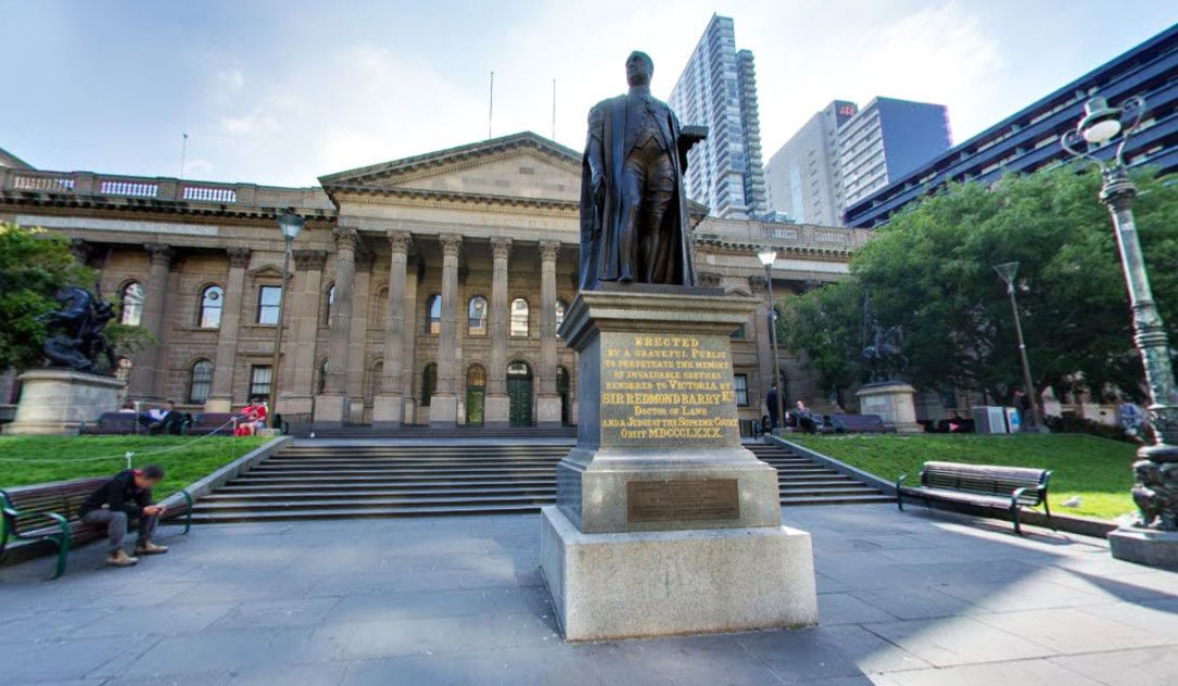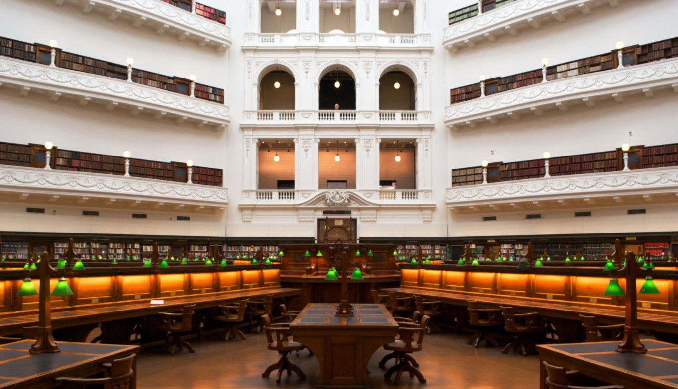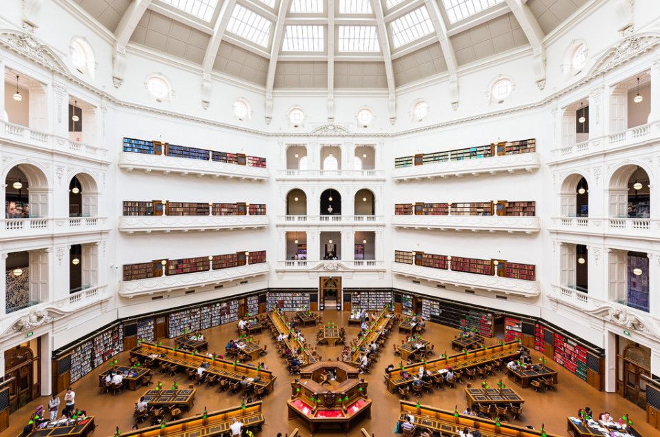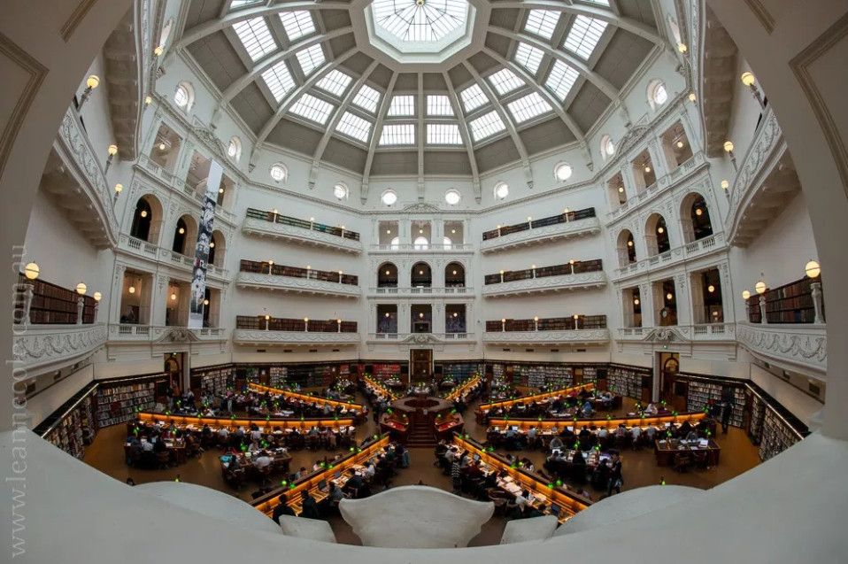 Государственная библиотека Виктории - самая старая публичная библиотека Австралии и одна из первых бесплатных публичных библиотек в мире, расположена в северной части Центрального делового района Мельбурна и занимает целый квартал. Решение о строительстве Публичной библиотеки Мельбурна было принято в 1853 году лейтенантом-губернатором штата Виктория Чарльзом Ла Тробом, в 1854 году началось её строительство, а уже через два года, в 1856 году, библиотека приняла первых посетителей. На тот момент собрание библиотеки состояло из 3 800 томов, сегодня же библиотечный фонд насчитывает более 1 500 000 книг и 16 000 периодических изданий. Автором проекта здания библиотеки стал архитектор Джозеф Рид, позже построивший в Мельбруне Королевский Выставочный Центр (объект Всемирного наследия ЮНЕСКО) и Центральный зал Мельбурна. Библиотечный комплекс, состоящий из нескольких зданий, был построен в несколько этапов, работы по строительству и перестройке библиотеки продолжались вплоть до 2003 года, а реконструкция и перепланировка внутренних помещений продолжаются и по сей день. Первоначально в здании библиотеки также располагались Национальная галерея Виктории и Мельбурнский музей - Галерея переехала в специально построенное для неё здание в 1960-х годах, а Мельбурнский музей - в 1990-х годах. На освободившихся пространствах были оборудованы новые читальные залы, выставочные залы и информационный центр. Главной достопримечательностью Государственной библиотеки Виктории, несомненно, является читальный зал Ла Троба (Купольный зал), открытый в 1913 году. На момент открытия это был самый большой читальный зал в мире, способный вместить одновременно около 600 читателей. Травяной газон, разбитый перед центральным входом библиотеки, является излюбленным местом отдыха у клерков из близлежащих офисов и студентов Технологического университета. Здесь же установлены статуи Сэра Редмонда Барри (1887 год), Святого Георгия, убивающего дракона 91889 год), Жанны Д'Арк (1907 год), и Чарльза Ла Троба (2007 год). В Государственной библиотеке Виктории проходят художественные выставки, презентации книг, литературные встречи, концерты, проводятся увлекательные экскурсии.