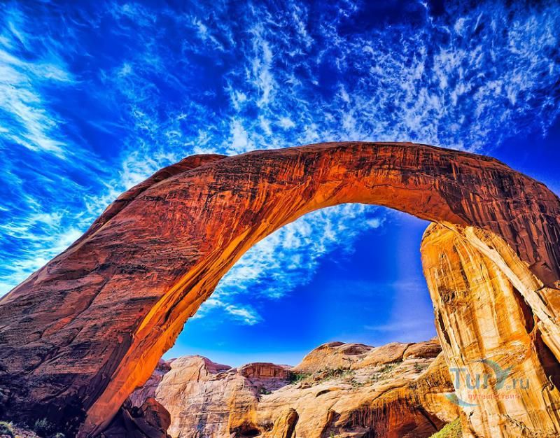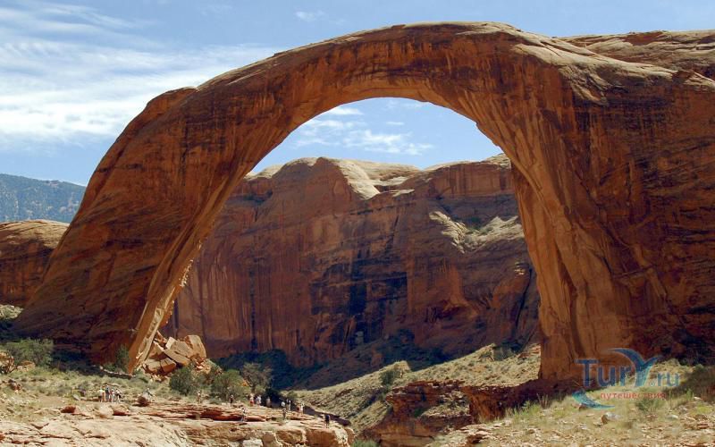 Мы привыкли к тому, что радуга – кратковременное природное явление. А североамеркианские индейцы издревле верили в существование вечной радуги. Они сумели доказать скептически настроенным европейцам, что на Земле есть место для чудес. Заинтригованные рассказами о «каменной радуге», трое европейских авантюристов в 1909 году отправились на её поиски. Им пришлось преодолеть пустыни и извилистые каньоны, а завершилось их путешествие у горы Навахо. Здесь они увидели то, о чем так много и вдохновенно говорили проводники из племен пайюты и навахо. Итак, вечной радугой оказалась каменная арка, повторяющая форму и расцветку радуги небесной. Полюбоваться этим природным чудом можно и сегодня, посетив штат Юта. В ясную погоду обычно розоватый камень выглядит темно-лиловым, закатное солнце окрашивает его в темно-красный. Природный мост длиною в 94 метра состоит из песчаника. Он соединяет склоны каньона шириной в 85 метров. Толщина камня - 13, а ширина – 10 метров, так что при желании можно проложить по нему двухполосное шоссе.