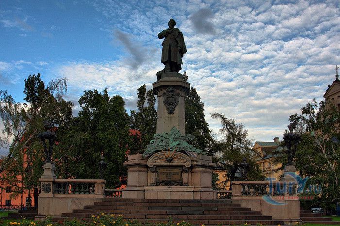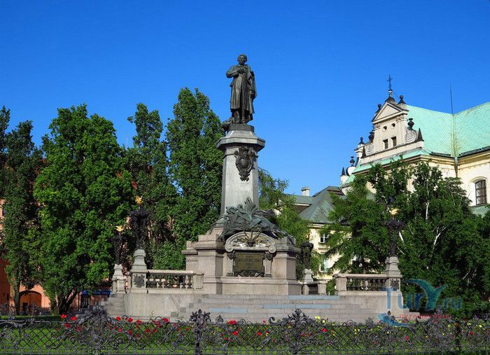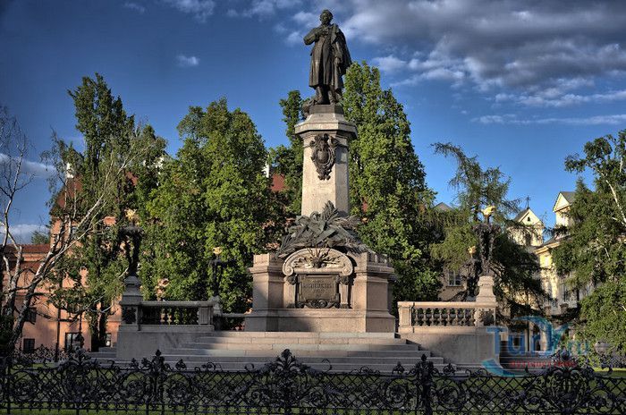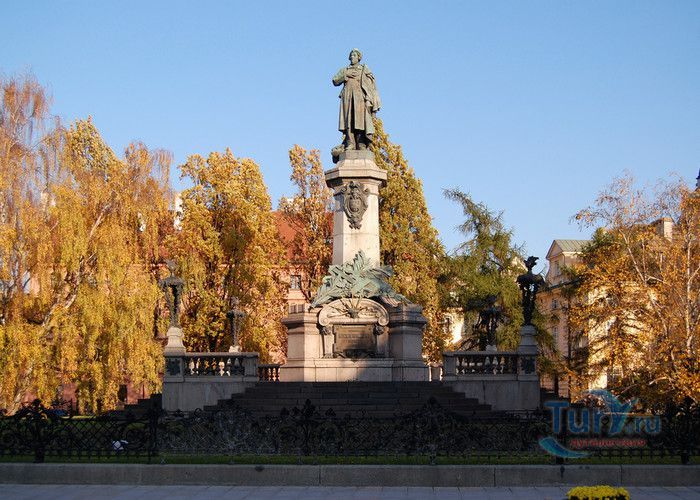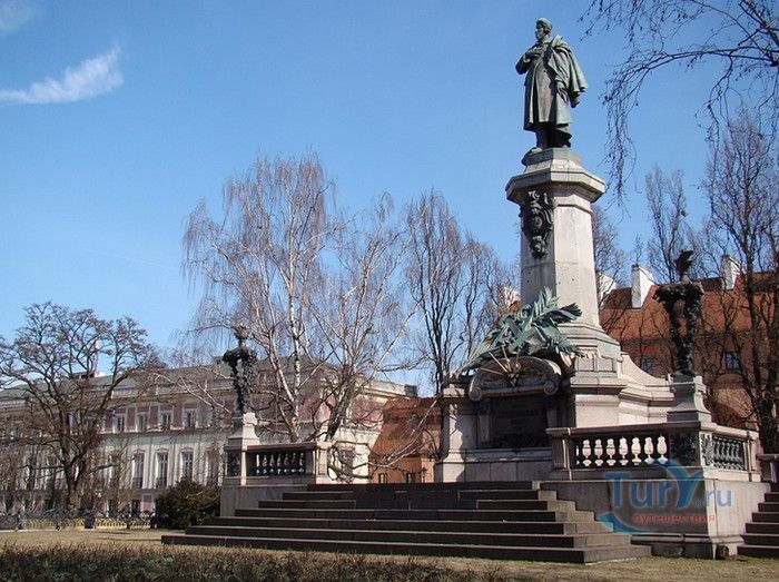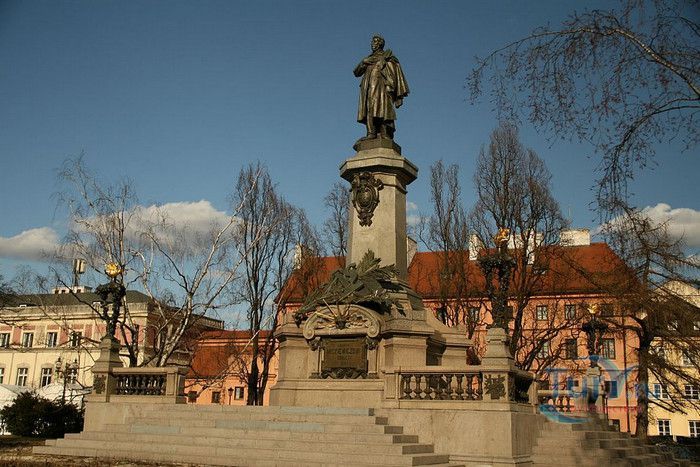 Памятник Адаму Мицкевичу установлен в Варшаве, в Краковском предместье, в 1898 году, к 100-летию польского поэта, драматурга, публициста и политического деятеля. В 1897 году, сначала в газете "Рядом", затем в журнале "Голос" были напечатаны материалы о выдающемся польском поэте, были высказаны предложения об открытии в Варшаве памятника Адаму Мицкевичу. Идею подхватили другие печатные издания и общественность Варшавы, а 25 февраля 1897 года, по инициативе польского писателя Генрика Сенкевича, был создан организационный совет по созданию памятника. В совет вошли граф Михал Радзивилл, Зигмунт Василевский и представители польской интеллигенции. Комитет занимался получением разрешения на установку монумента в Варшаве, вопросами финансирования и сбором пожертвований от горожан. 1 мая 1897 года разрешение от властей было получено, с 12 мая по 14 июля 1897 были собраны 235 734 рублей - пожертвования поступали из всех уголков страны и даже из-за рубежа. Изготовление памятника было поручено скульптору Циприану Годебскому и архитекторам Иосифу Дзеконьскому и Владиславу Маркони. Бронзовая статуя высотой 4,2 метра была отлита в итальянском городе Пистойя, а постамент изготовлен из гранита, специально привезенного из города Бавено. На постаменте выбиты даты рождения и смерти поэта, и прикреплена табличка с надписью "Адаму Мицкевичу - соотечественники 1898". Церемония открытия памятника состоялась 24 декабря 1898 года. Царские власти, опасаясь патриотических проявлений народа, запретили какие-либо выступления и шествия. На открытии присутствовали представители комитета по созданию памятника и 12 000 приглашенных гостей, монумент был открыт в полном молчании, под музыку из оперы "Халка" Станислава Монюшко. В 1942 году памятник был демонтирован немецкими оккупантами и вывезен в Германию. После окончания войны представители польской военной миссии разыскали части памятника в Гамбурге. Решением общественности Варшавы стало восстановление прежнего монумента, а не создание нового. Работы по реконструкции памятника возглавил Ян Щепковский, из-за нехватки фрагментов и отсутствия первичных эскизов процесс восстановления был довольно сложным. Однако, 28 января 1950 года памятник Адаму Мицкевичу стоял на прежнем месте.