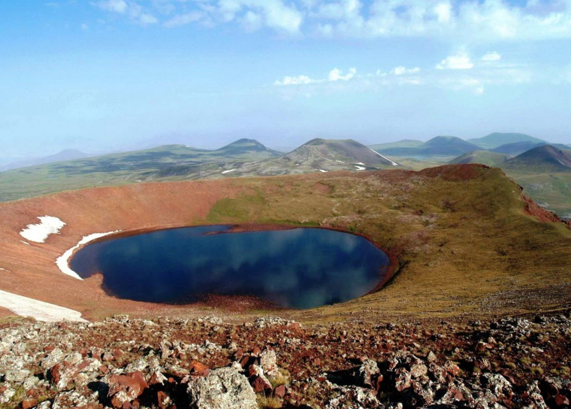 В кратере вулкана Аждахак образовалось озеро из тающего снега. С вершины горы открывается живописный пейзаж гор Арарат, Хатис, Ара, Арагац, озеро Севан, целые горы Гегам и Котайкская долина.