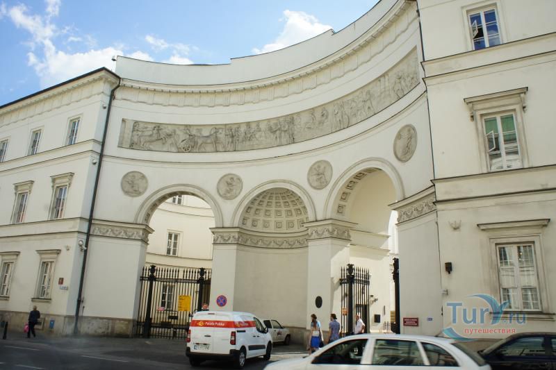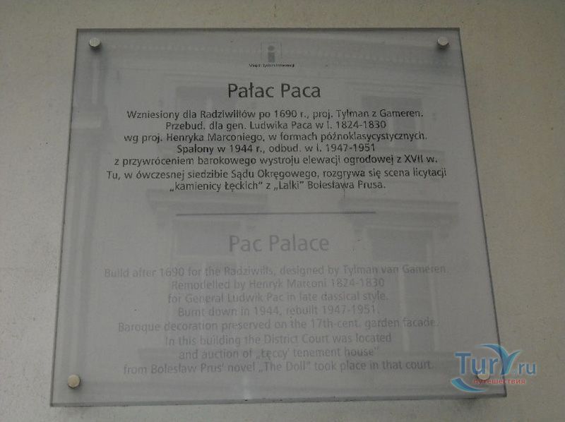 Дворец Паца является бывшей аристократической резиденцией и памятником культуры, который находится в центре Варшавы, на улице Мёдовой, недалеко от Дворца Малаховских и Дворца Примаса, где в 18-19 веках любили селиться польские вельможи. Дворец был построен в конце 17 века по проекту архитектора Тильмана Гамерена для польского князя Доминика Николая Радзивилла в стиле барокко. Затем дворец принадлежал епископу Анджею Залускому и его брату Юзефу, позже Фридерику Михаилу Чарторыйскому. Во дворце любил гостить король Станислав Понятовский. В 1794 году во время восстания Костюшко дворец был повреждён. В 1825 году дворец купил генерал Людовик Михал Пац, который по проекту архитектора Генрика Маркони перестроил его с элементами классического стиля. Во время реконструкции здания были смешаны архитектурные стили - классический и барокко. Во Дворце были достроены боковые крылья, портик из шести колонн, фриз над аркадами. Полукруглые ворота представляют собой триумфальную арку. Украшают ворота классические барельефы, изготовленные Людовиком Кауфманом, учеником известного Антонио Канови. Фасад выполнен в духе Палладио. Внутри дворца созданы Мавританский и Готический залы. Род Радзивиллов владел этим дворцом почти 100 лет до начала 19 века. Из-за участия в ноябрьском восстании 1830 года, имущество генерала М. Паца было конфисковано. Позже по проекту Стефана Балинского интерьер дворца был изменён. Позже в период 1848-1875 годов во дворце находилась резиденция Губернаторского Совета, а в 1875-1939 годах - Окружной суд. Во время Второй мировой войны Дворец Паца был повреждён, в 1947-1951 годах был восстановлен. Фасад со стороны двора восстановлен по проекту архитектора Маркони, фасад со стороны сада - по оригинальному проекту архитектора Гамерена. В настоящее время во Дворце Паца находится Министерство здравоохранения и социального обеспечения.