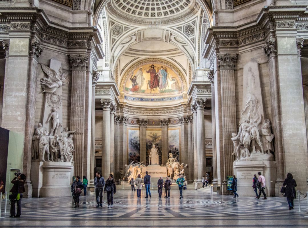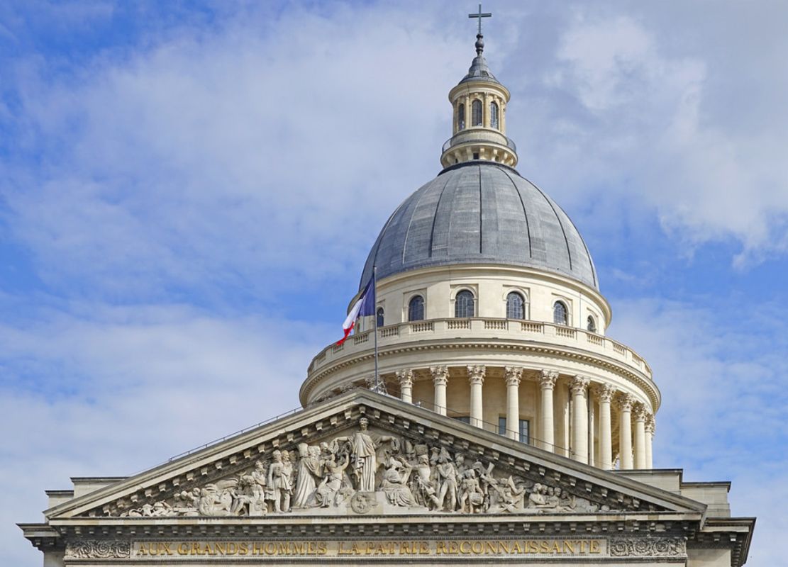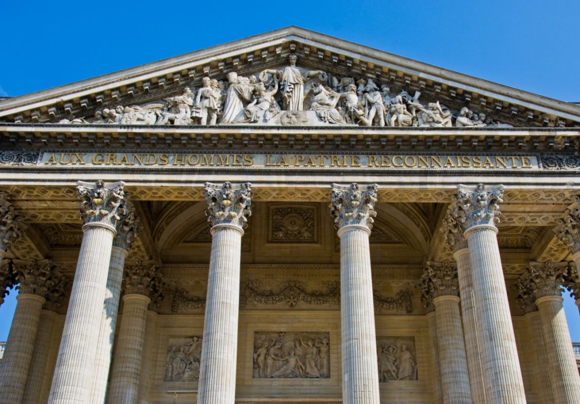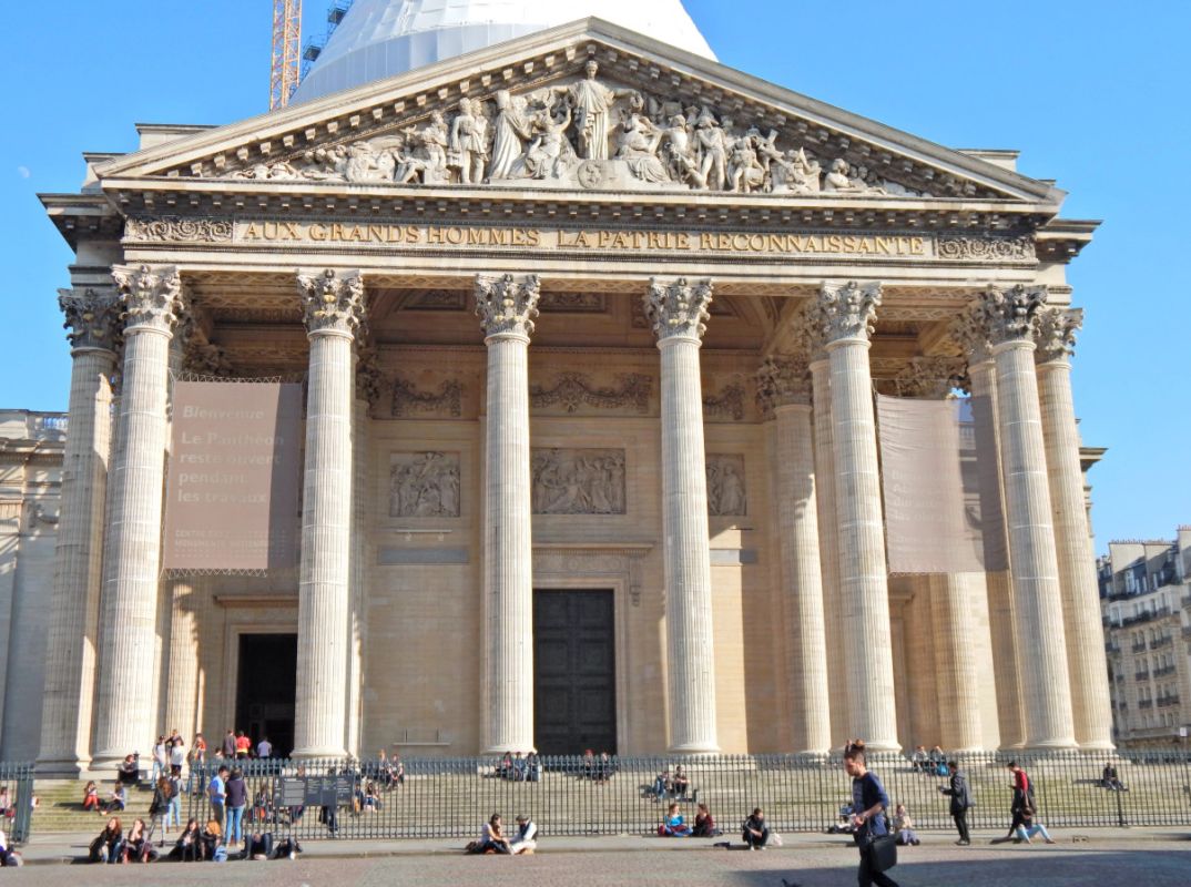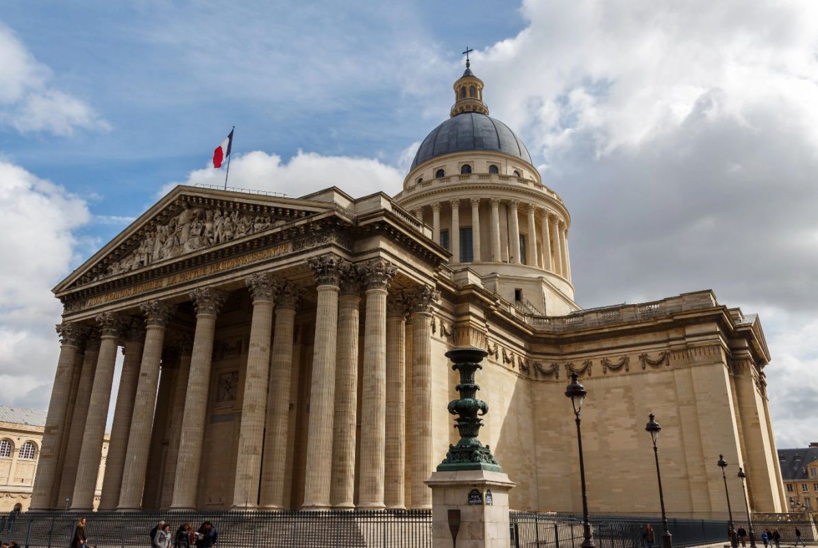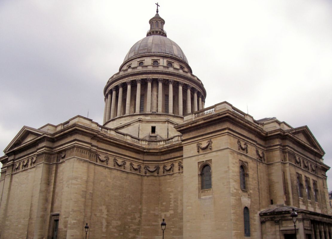 Пантеон - одна из самых известных и посещаемых достопримечательностей Парижа, он расположен в Латинском квартале, на левом берегу Сены, на холме Святой Женевьевы. Величественное здание, огромный купол которого виден из многих уголков Парижа, является ярким примером французского зрелого классицизма. Пантеон в переводе с греческого означает "Храм всех богов", задумывался он изначально не как мавзолей для "Великих людей Франции", а как церковь Святой Женевьевы. Строительство её было начато на территории аббатства Святой Женевьевы в 1758 году во исполнение обета короля Франции Людовика XV, молившего Святую Женевьеву об исцелении его от оспы, эпидемия которой в середине XVIII века свирепствовала в Париже. Людовик XV поклялся, что в случае выздоровления, он выстроит на месте разрушенной церкви в аббатстве Святой Женевьевы новый храм, достойный святой покровительницы Парижа. Король выздоровел, и спустя 11 лет после его исцеления строительство церкви было начато. Для возведения храма был приглашён архитектор Жак-Жермен Суффло, взявший за образец для здания новой церкви соборы Святого Петра в Риме и Святого Павла в Лондоне, а также Пантеон Агриппы в Риме. В ходе строительства храма неоднократно возникали трудности из-за отсутствия финансирования и протестов со стороны католического духовенства по поводу проекта церкви - по задумке архитектора храм в плане должен был иметь форму греческого креста, но под давлением церковников Суффло вынужден был внести существенные изменения в первоначальный проект. Когда церковь была практически достроена, и уже велись работы по укладке мраморного пола, были обнаружены трещины в несущих колоннах, поддерживающих купол храма. Была создана профессиональная комиссия, которая, изучив проблему, вынесла вердикт - математические расчёты Суффло, сами купол и три свода церкви, их кладка и используемый строительный материал не вызывают никаких нареканий. Всё дело в непрочности самих опорных столбов, которые и пришлось заменить. Строительство церкви было завершено в 1790 году (ни Людовик XV, ни Жак-Жермен Суффло не дожили до этого дня). Здание поражает свои масштабом и помпезностью - тройной купол храма возвышается на высоте 83 метра, диаметр купола - 23 метра, длина здания - 110 метров, его ширина - 84 метра. Центральный фасад украшен портиком с 24 коринфскими колоннами и треугольным фронтоном. Вскоре после окончания строительства началась Великая французская революция, изменившая предназначение величественного здания. Революционеры посчитали, что церковь Святой Женевьевы должна стать Пантеоном - усыпальницей Великих людей Франции. Большая часть окон церкви была заложена кирпичом, что придало светлому, пронизанному светом храму строгий и мрачный вид. С тех пор в Пантеоне стали хоронить выдающихся политиков, военных, учёных, писателей и священников, оставивших след в истории Франции. Среди удостоившихся места в некрополе - Жан-Жак Руссо, Вольтер, Виктор Гюго, Жан Мулен, Луи Брайль, Пьер и Мари Кюри, Марселен и Софи Бертло, Эмиль Золя, Александр Дюма (отец) и сам Жак-Жермен Суффло - создатель Пантеона. Были случаи, когда прах захороненных в Пантеоне людей по истечении времени оттуда удалялся. Так, Оноре де Мирабо, один из самых знаменитых ораторов и политических деятелей Франции, и Жан-Поль Марат, герой Великой французско