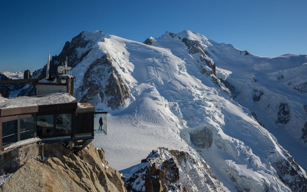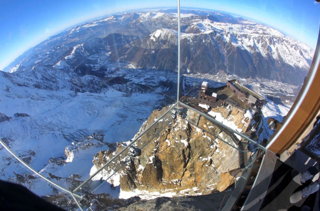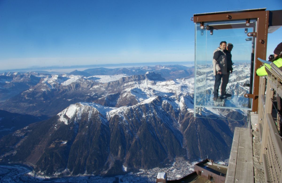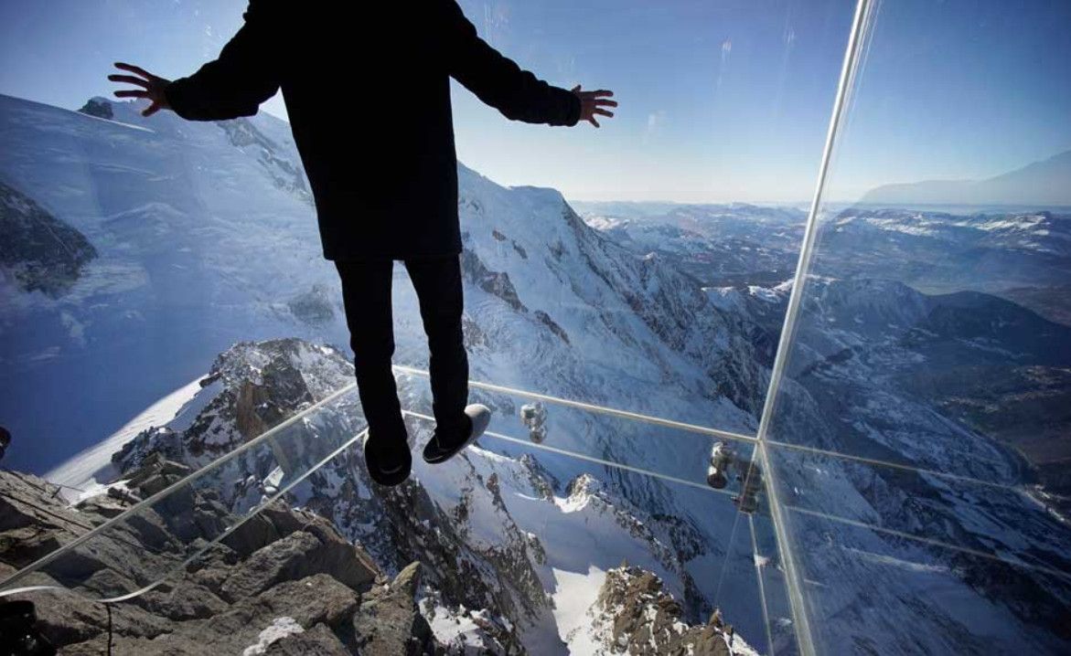 Экстремальный аттракцион "Шаг в пустоту" открылся в конце декабря 2013 года в Шамони (Франция), на вершине пика Эгюй-дю-Миди, в его самой высокой точке, на высоте 3842 метра над уровнем моря. Полностью прозрачный куб, стены, пол и потолок, которого выполнены из стекла, висит над пропастью, глубина которой - 1035 метров. Конструкция спроектирована дизайнером Пьер-Ивом Шаи. На строительство этого аттракциона ушло 3 года. Как уверяют разработчики, стенки обзорной кабины способны выдерживать ветер скоростью до 220 километров в час и температурные перепады в 60 градусов. Стены. пол и потолок смотровой площадки сделаны из 12-миллиметрового стекла. Экстремальный аттракцион "Шаг в пустоту" на вершине пика Эгюий-дю-Миди вошёл в список 10 самых страшных туристических достопримечательностей мира, составленный новозеландским новостным порталом Stuff. Доступ к аттракциону Step in the Void включен в стоимость поездки на канатной дороге Chamonix - Aiguille du Midi.