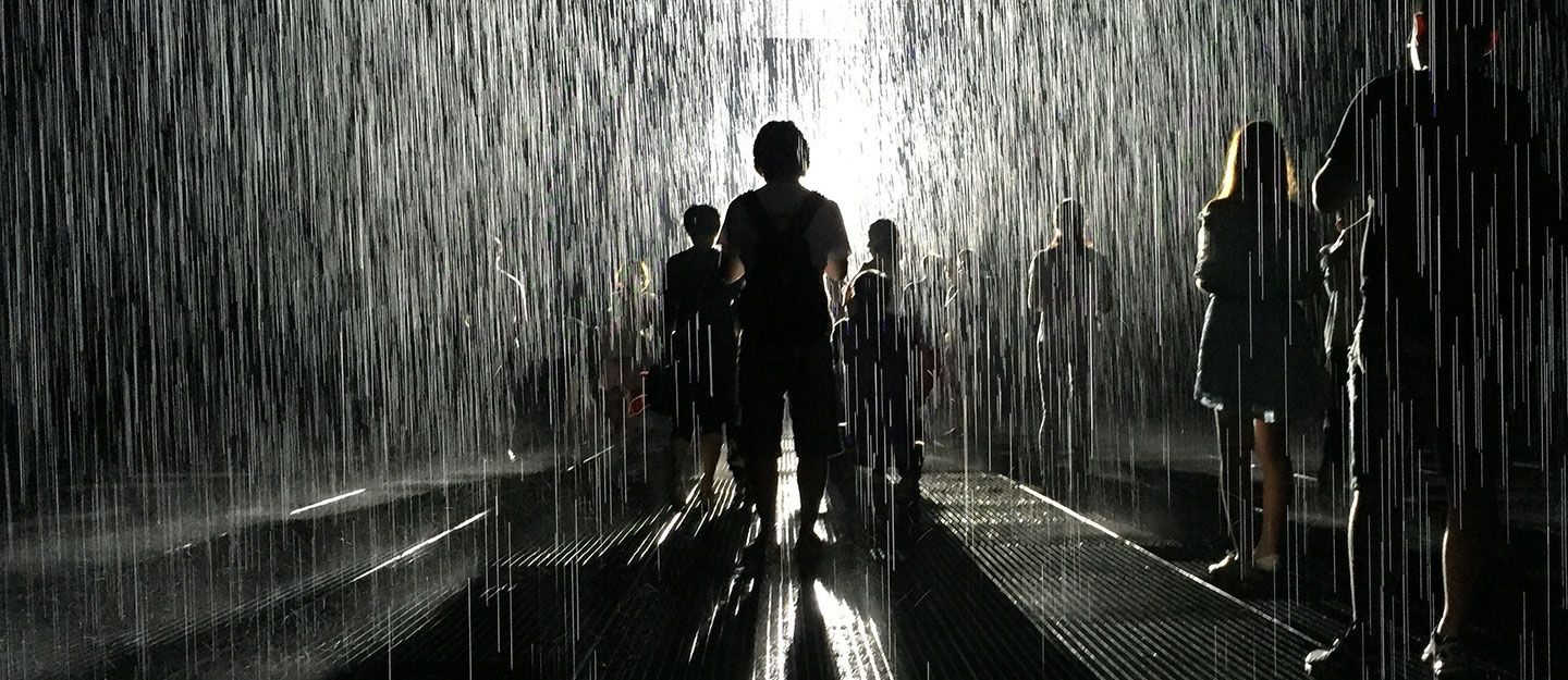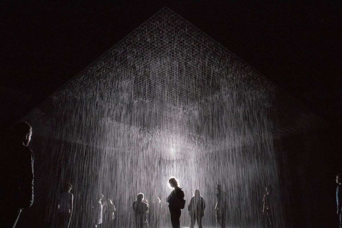 Заходя в неосвещенное пространство комнаты, посетители слышат звуки падающего дождя и интуитивно пытаются спрятаться от него. Но они не намокнут: специальные датчики реагируют на каждое движение человека и останавливают воду в том месте, где он оказывается. В комнате дождя постоянно циркулирует 1200 литров чистой воды.