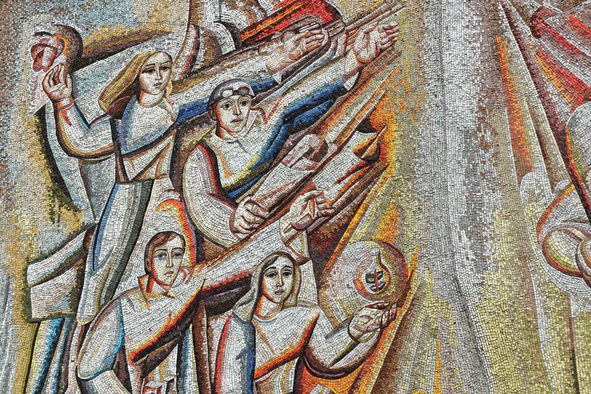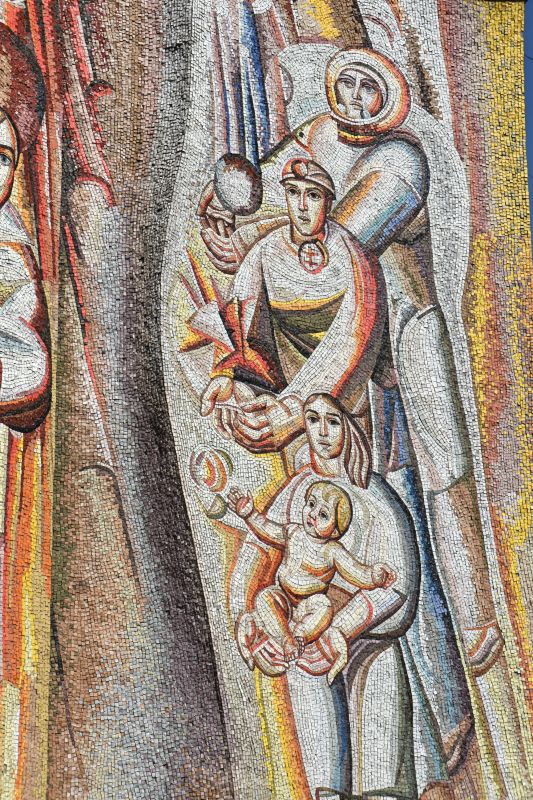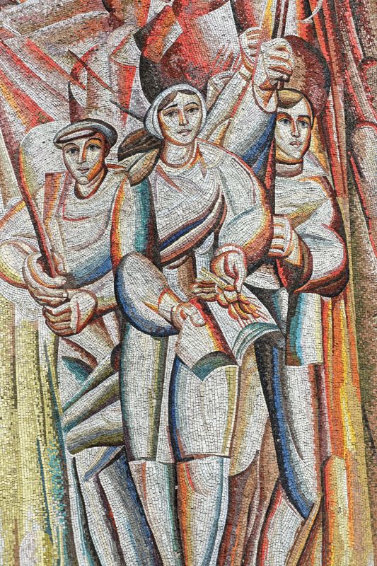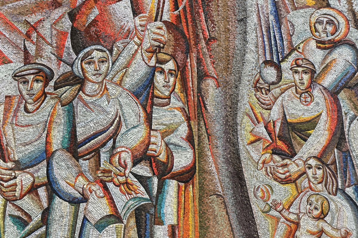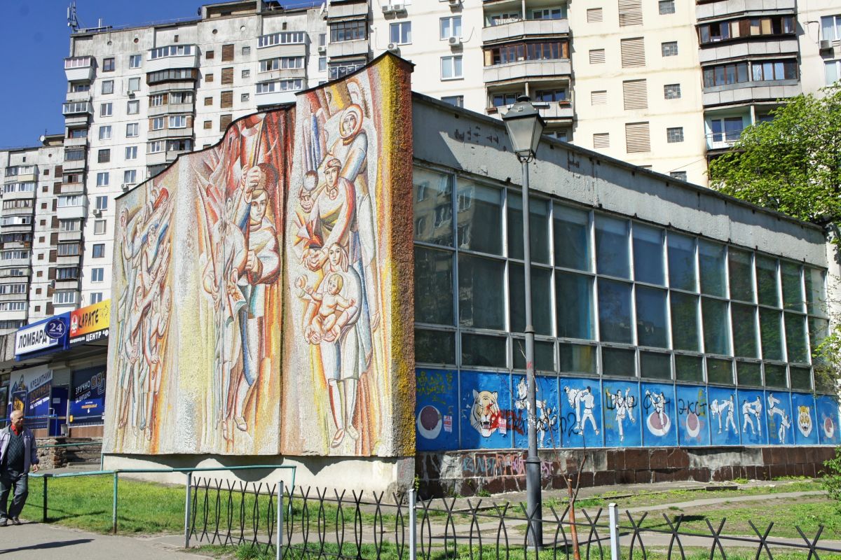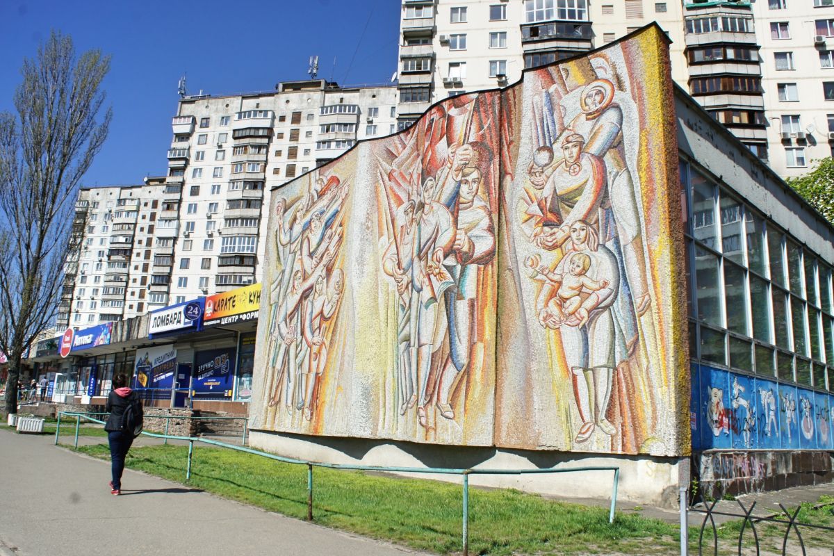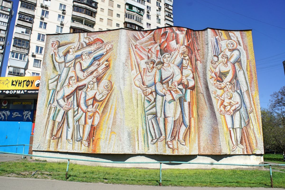 Пример монументальной мозайки времен советского прошлого моно обнаружить в Киеве, на улице Андрея Малышко, 15/1.На мозаичном панно изображены люди разных профессий, прославляющие труд, объединенные общей идеей и верой в светлое будущие.
