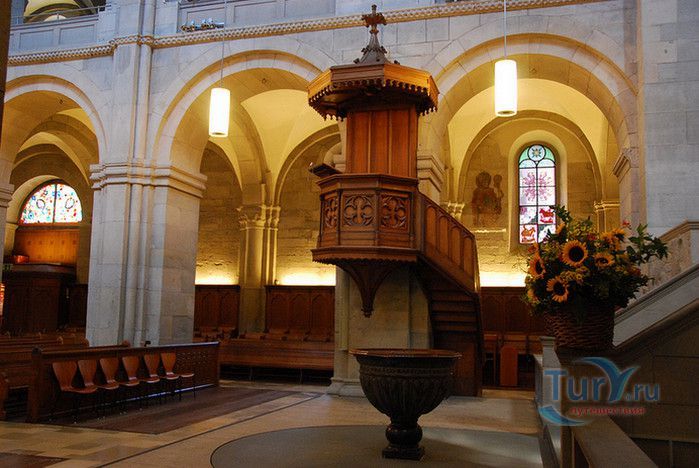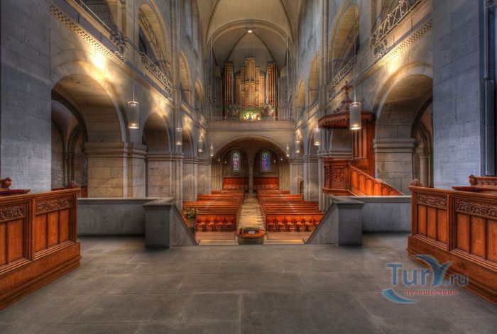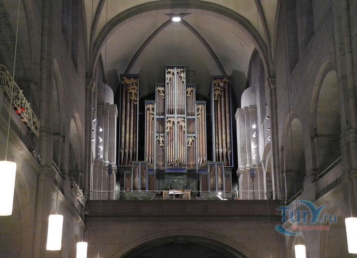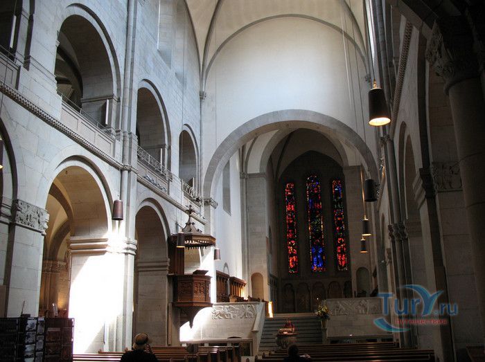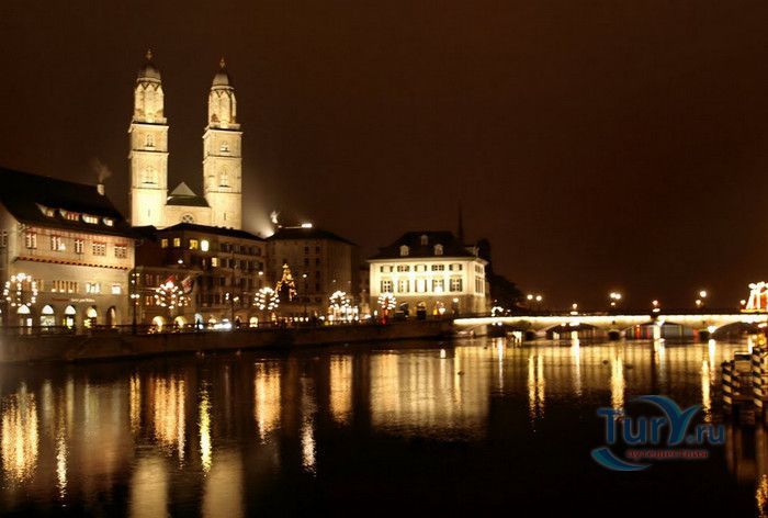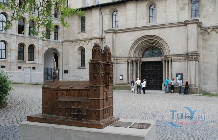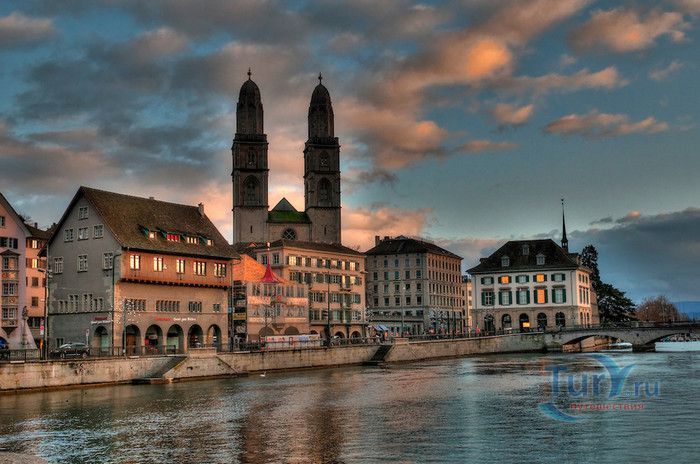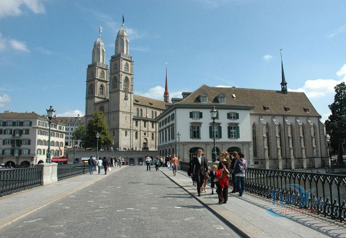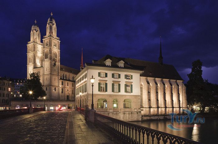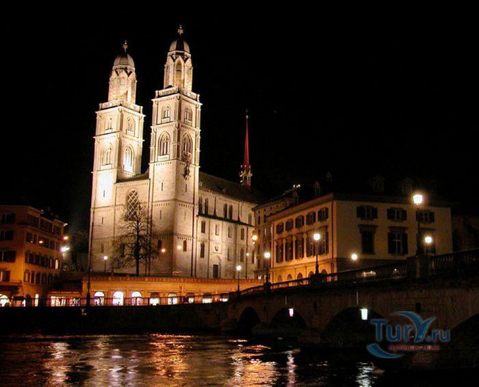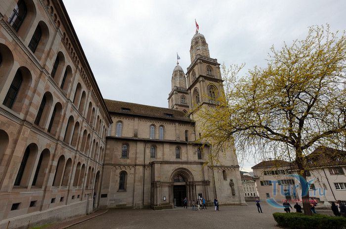 Собор Гроссмюнстер, построенный в романском и готическом стилях содержит две трехэтажные башни и располагается на террасе над Limmatquai, на правом берегу. Строительство собора началось в 1090 и достраивалось до начала XIV века. Хоры содержат великолепные витражи, выполненные в 1932 году Августо Джакометти. Старейшие части собора датируются концом XI, началом XII веков. Можно отметить крытую галерею в романском стиле со скульптурами конца XII века. Когда-то этот собор был приходской церковью Ульриха Цвингли - одного из великих лидеров Реформации. Он убедил священников жениться (сам он был женат), выступал против "идолопоклонства" и массового причащения. В 1531 году Цвингли был убит в религиозной войне в Каппеле. Палач четвертовал его тело и солдаты сожгли остатки. На месте его казни надпись - "Они могут убить тело, но не душу". В соответствии с убеждениями Цвингли, Гроссмюнстер - строгий, без обильных украшений. Находящаяся там ранее церковная школа была заменена в 1853 году первой школой для девочек (Wegmann); сегодня это здание теологического факультета Университета.