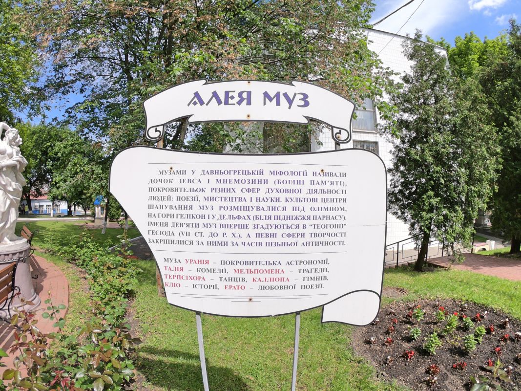 Фигуры девяти муз находятся на аллее в МАУП и размещены на небольших возвышениях в трех группах. Группа муз поэзии включает Полигимнию, Эвтерпу и Эрато. Музы искусства представлены Мельпоменой, Талией и Терпсихорой. Музы науки включают Каллиопу, Уранию и Клио. Каждая из муз имеет свою область покровительства, например, Полигимния - муза пантомимы и гимнов, Эвтерпа - муза лирической поэзии и музыки, Эрато - муза любовной поэзии, Мельпомена - муза трагедии, Талия - муза комедии, Терпсихора - муза танца, Каллиопа - муза эпической поэзии, Урания - муза астрономии, Клио - муза истории.