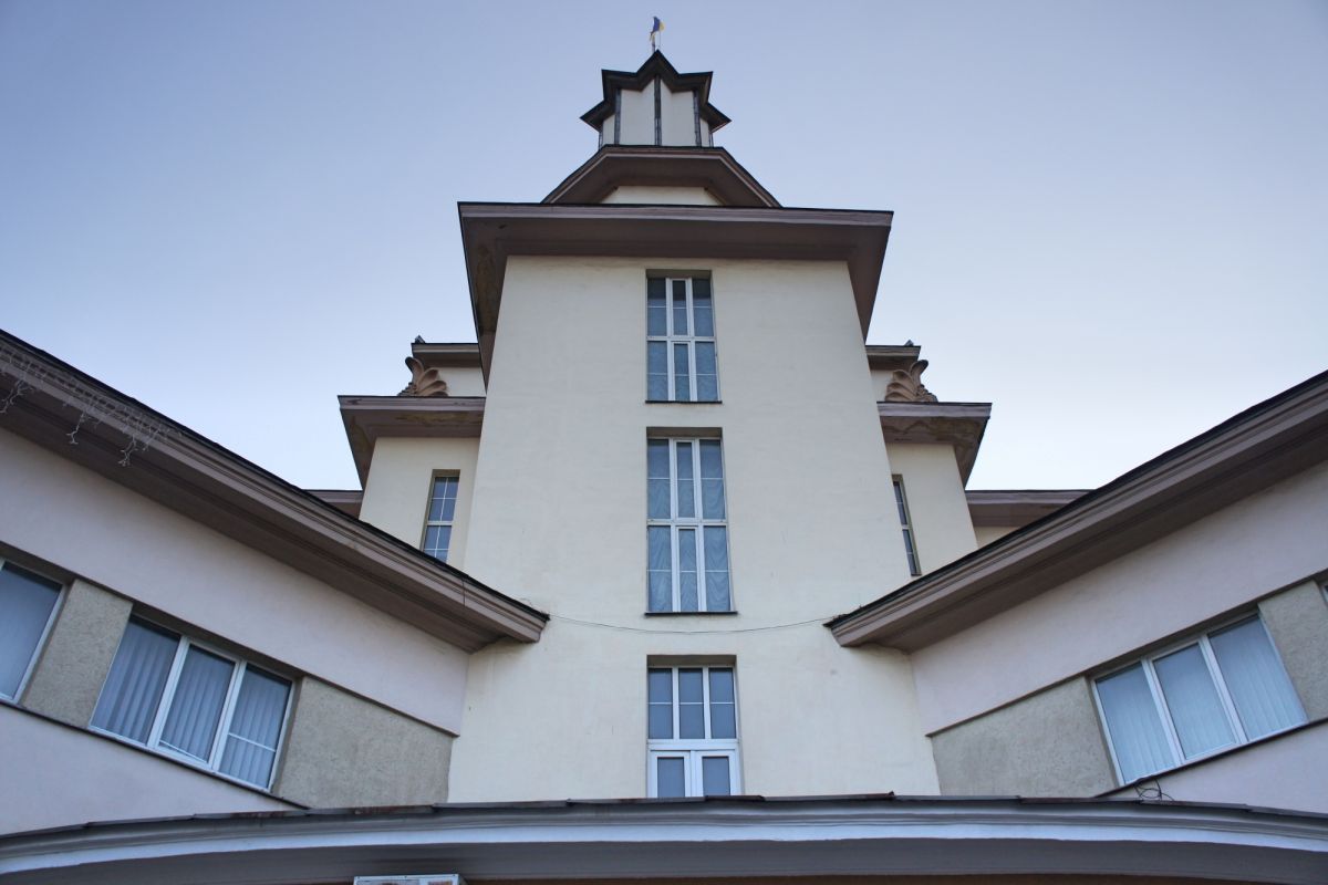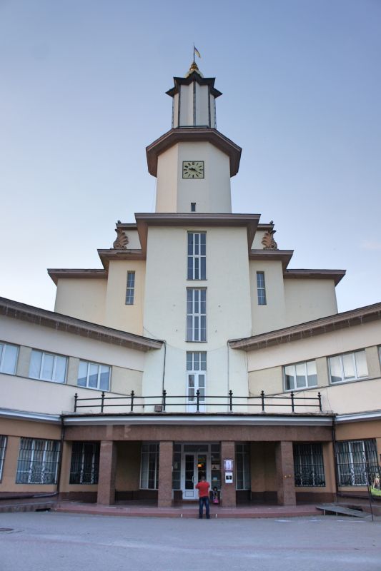 Здание построено из железобетона и облицовано светлым камнем и штукатуркой. Оно симметрично по осям, с массивным вертикальным объёмом в центре и крыльями, выходящими на четыре стороны. Главной особенностью стала башня с обзорной площадкой, откуда открывается панорамный вид на старый город и Карпатские предгорья. Общая высота сооружения — около 50 метров.