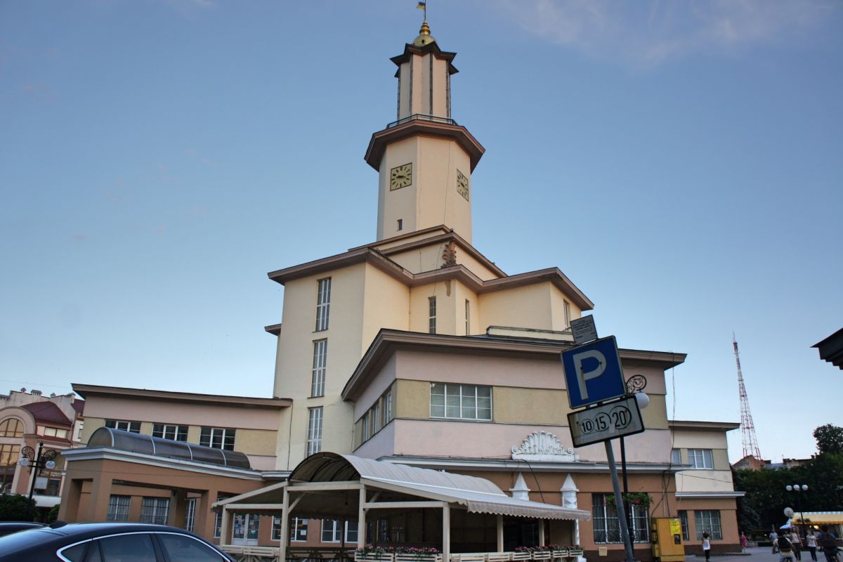 Первое здание ратуши появилось ещё в XVII веке, когда город носил название Станиславов и принадлежал польскому магнатскому роду Потоцких. С течением времени ратуша неоднократно перестраивалась, горела и разрушалась, пока в межвоенный период власти не решили возвести новое здание в духе модернистских тенденций. Автором проекта стал польский архитектор Станислав Треля, спроектировавший башню в форме креста с центральной вертикальной доминантой — смотровой башней.