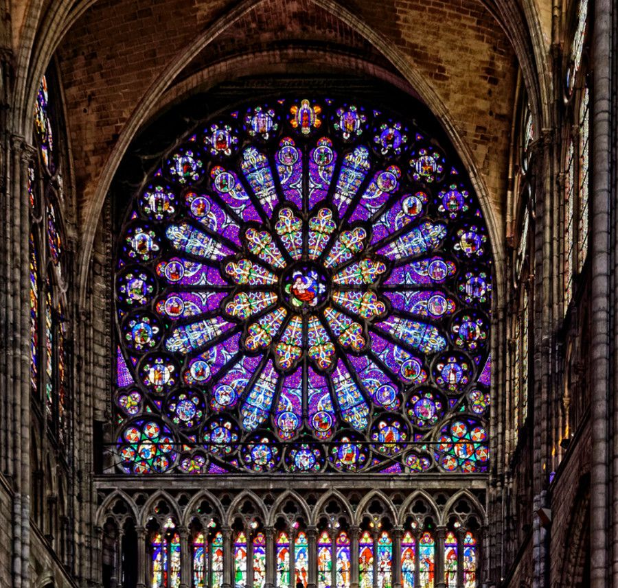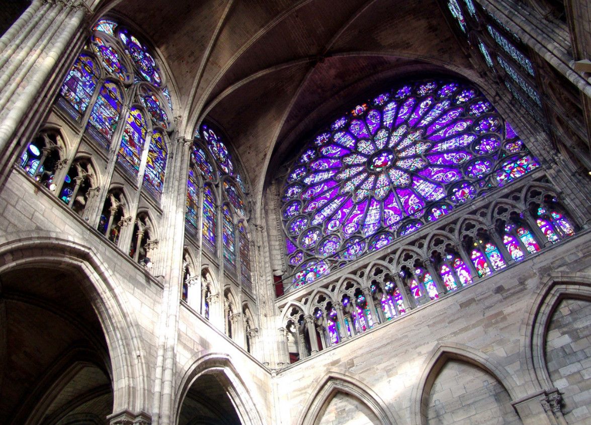 И в 1130 году аббат Сюжер приступает к перестройке аббатства Сен-Дени в абсолютно новом для того времени готическом стиле. Новый 34-метровый западный фасад базилики с двумя башнями (сейчас башня одна, вторая обрушилась в 1837 году) был оформлен тремя порталами, украшенными рельефными тимпанами и разделёнными массивными вертикальными контрфорсами. Абсолютно новаторским для архитектуры средневековой Франции стало украшение фасада большими арочными окнами, аркадами и окном-розой, расположенным над центральным порталом. После завершения работ по перестройке фасада и строительства трёх новых часовен в 1140 году, Сюжер занялся переустройством хора базилики. По замыслу аббата, хор должен был поражать своим величием и масштабом и в то же время быть изящным и наполненным светом. Для достижения этой цели были использованы архитектурные элементы, присущие готическому стилю, - стрельчатые арки, ребристый свод, просторная крытая галерея, деамбулаторий с двойной аркадой, монолитные колонны, поддерживающие нервюрные своды. Кроме того, своды внешней аркады были объединены со сводами капелл, в результате чего было создано единое внутреннее пространство. Но главной гордостью Сюжера стали огромные витражные окна, наполняющие светом всё пространство базилики.
