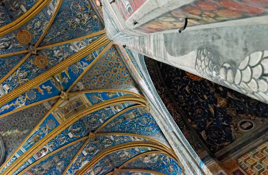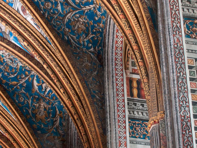 В 1474-1484 годах собор "получил" великолепный хор с лекторием (Кафедральный собор Сент-Сесиль - единственный собор во Франции, в котором полностью сохранился весь хор), богато украшенный каменными барельефами, ажурными арками, филигранной каменной резьбой и полихромными статуями работы бургундских мастеров. В 1495 году всю поверхность стены ниже органа собора заняла фреска "Страшный суд", предположительно, работы фламандских мастеров. Первоначально площадь фрески составляла почти 300 квадратных метров, однако, в конце XII века часть её была утрачена, и сегодня её площадь - 200 квадратных метров. В 1509-1514 годах весь сводчатый потолок собора был украшен великолепными росписями, признанными шедевром монументальной живописи. Общая площадь фресок составляет 18 500 квадратных метров - это крупнейший и старейший ансамбль итальянской живописи эпохи Возрождения во Франции.