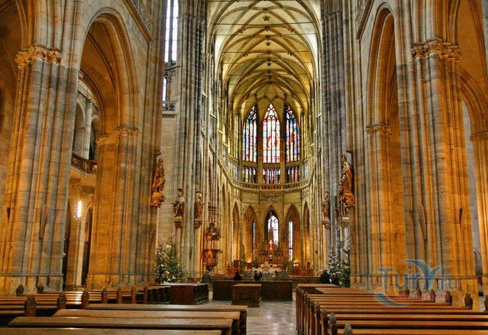 Длина собора святого Вита 124 метра, ширина в самой широкой части - 60 метров, высота храма до свода - 33 метра, высота главной южной башни - 96,6 метра. Диаметр окна - розы на западном фасаде - 10,4 метра.