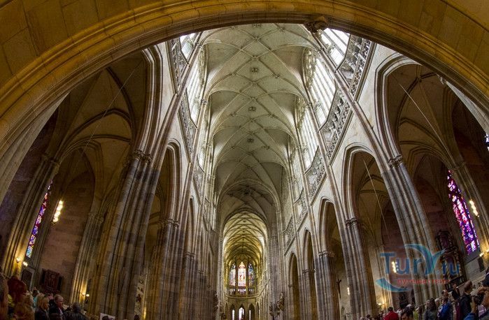 Затем внимание посетителей привлекают огромные цветные окна (витражи). Они были созданы уже в ХХ веке самыми прославленными чешскими художниками, среди которых Альфонс Муха и Макс Швабинский.
