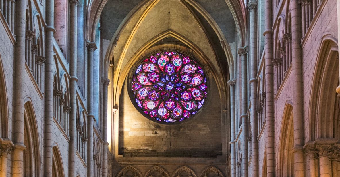 Интерьер храма также выполнен в смешении романского и готического стилей. Здесь есть и огромные витражные окна-розы, и узкие "ланцетовидные" окна с романскими витражами, и аркады из полукруглых и стрельчатых арок, и "висячие" галереи, и великолепный нервюрный свод.