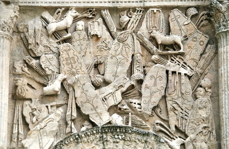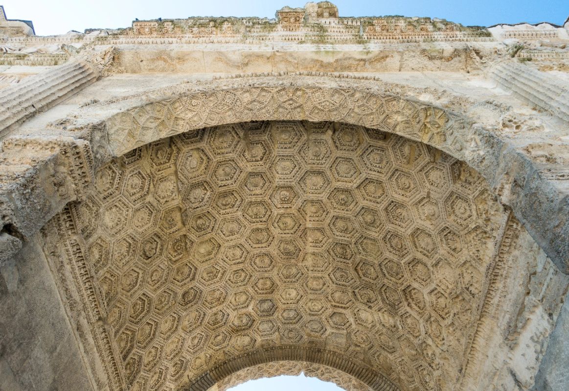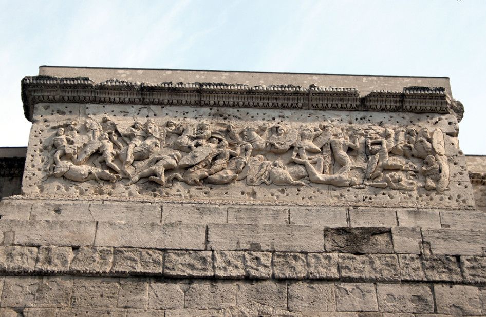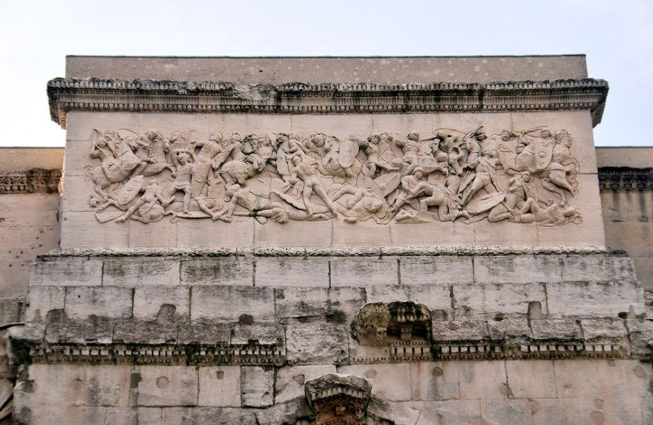 Позже арка была перестроена по указу императора Тиберия в честь "ослепительных" побед римского полководца Германика, одержанных им над германскими и галльскими племенами. Тогда же с обеих сторон арки, в нижней полосе фриза, в честь этого события была сделана надпись бронзовыми буквами, не сохранившаяся до наших дней.