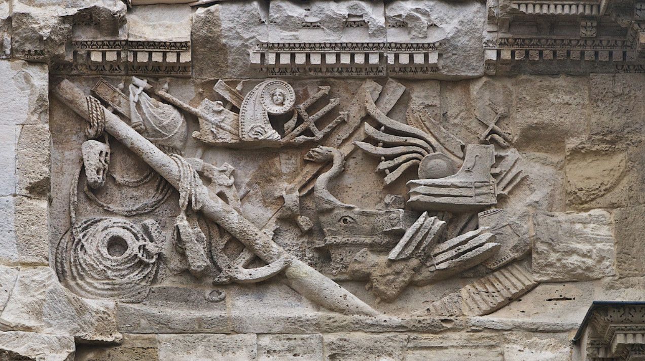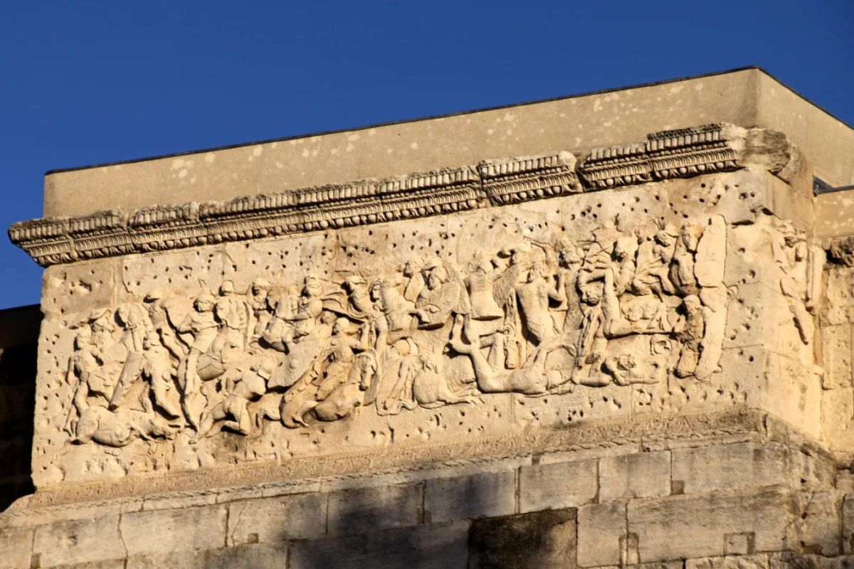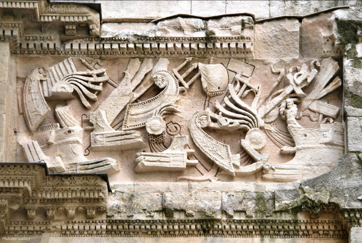 Триумфальная арка представляет собой монументальное сооружение, построенное из больших известняковых блоков, длиной 19,57 метров, шириной 8,40 метров и высотой 19,21 метров. Сооружение имеет три арочных проёма - большой центральный и два фланговых меньших размеров. Арку украшают четыре полузакрытые коринфские колонны, многочисленные барельефы и горельефы, на которых изображены сцены сражений римских легионеров с галлами, оружейные щиты, шлемы, копья, воинские знаки и трофеи. На четырёх панелях изображена морская атрибутика (корабли , якоря, трезубцы, весла, корабельные рули), олицетворяющая превосходство Рима не только на суше, но и на море.