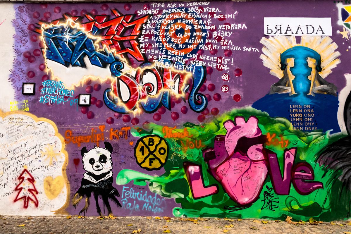 Вскоре после смерти Джона Леннона его неизвестные поклонники превратили обыкновенную стену, окружающее архи-аббатство ордена мальтийских рыцарей, в импровизированный памятник с портретом певца. К зажжённым свечкам у стены прибавлялись и написанные на стене цитаты из его песен, призывающие к свободе и миру, а потом – и лозунги против тоталитарного режима.). С приходом демократии стена потеряла своё первоначальное значение, и сегодня её поверхность, помимо портретов Леннона, украшена новыми рисунками более, чем 30 художников из 5 стран мира. Представители широкой общественности и сейчас имеют возможность оставлять здесь свои художества, но исключительно ручкой, фломастером или мелом; рисовать с помощью спрея запрещается.
