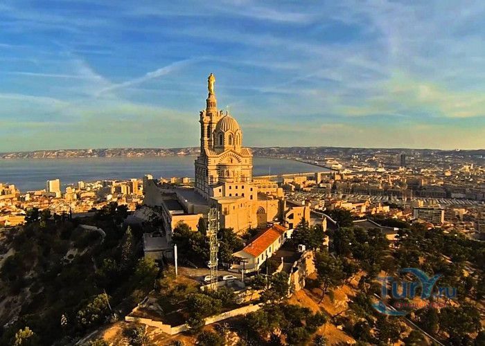 Жители Марселя называют Базилику Нотр-Дам де ла Гард хранительницей города. Базилика и позолоченная статуя Девы Марии, установленная на колокольне, видны из любой точки города. В 1214 году марсельский священник Пётр построил небольшую часовню Девы Марии. Часовня была возведена на вершине 161-метрового скалистого холма La Garde (охрана), с которого открывался вид на Марсель и море. В январе 1516 года Марсель посетил французский король Франциск I. В часовне Девы Марии монарх отслужил молебен в честь победы французской армии в битве при Мариньяно. Король по достоинству оценил местоположение храма и отличный обзор окрестностей с вершины холма, чем и воспользовался при строительстве в Марселе двух фортов для защиты города: один форт был построен на острове Иф, второй - на вершине холма, на котором стояла часовня. Оказавшись за стенами форта, церковь не прекратила деятельности, её посещали не только солдаты гарнизона, но и жители Марселя. Чтобы дать возможность горожанам попасть в храм, по распоряжению Франциска I был построен подъёмный мост, по которому каждое утро люди шли на церковную службу. Ни один моряк не уходил в море, не помолившись у статуи Девы Марии. Во время Французской революции в форте в течение шести месяцев находились под стражей члены семьи Бурбонов. Католическое вероисповедание во Франции было запрещено. Как и многие другие храмы Франции, церковь Нотр-Дам де ла Гард была национализирована, а имущество просто разграблено - бесследно исчезли две статуи Богородицы, колокол, алтарь. Уцелело только большое распятие, которое и сейчас можно увидеть на входе в храм. После революции часовня снова была открыта. Комендант форта подарил небольшой колокол, а бывший морской пехотинец Эскарамань - статую Мадонны с букетом, купленную им на аукционе. К середине XIX века Марсель значительно вырос, часовня не могла вместить всех желающих. В 1851 году священники обратились в военное министерство с просьбой о сносе маленькой часовни и возведении на территории форта базилики с большой колокольней. Разрешение было получено в 1852 году. Строительство храма в римско-византийском стиле было начато 11 сентября 1853 года по проекту архитектора Анри-Жака Эсперандьё. Внешняя отделка храма выполнена с использованием белого калиссанского известняка и зеленого камня. На террасу, расположенную пред базиликой, ведёт широкая каменная лестница, а в само здание церкви - небольшой подъемный мост. 4 июня 1864 года недостроенная базилика была освящена кардиналом Виллекурт. Строительство колокольни было завершено в 1866 году, а изготовленная в Париже, в мастерской Кристофль, статуя Девы Марии была доставлена в Марсель поездом в 1869 году. Статую изготовили из меди, отливали из четырёх частей, а после их соединения фигура Девы Марии с Младенцем была покрыта сусальным золотом. В 1870 году 11-метровая статуя, весом 9796 кг, была установлена на колокольне Базилики Нотр-Дам де ла Гард. Интерьер храма отделан роскошными мозаиками и мрамором. При освобождении Марселя от фашистов командованием была поставлена задача выбить немцев из Базилики Нотр-Дам де ла Гард без применения авиации и артиллерии. Храм был освобождён 25 августа 1944 года благодаря мужеству французских солдат. После войны "Хранительница Марселя" снова верно служила жителям города. В 2000-2008 годах были проведены масштабные 