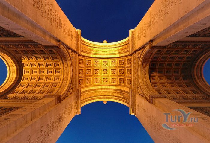 Символ французской нации - Триумфальная Арка расположена в Париже, в VIII округе, на площади Шарля де Голля (её еще называют площадью Этуаль). Памятник, без которого современный Париж уже невозможно представить, воздвигнут в центре площади, дающей начало 12 проспектам, в том числе знаменитым Елисейским полям. В ознаменование победы французской армии в сражении под Аустерлицем, Наполеон Бонапарт решил воздвигнуть Триумфальную арку в Париже, на холме Шайо. Строительство монумента по проекту архитектора Жана Франсуа Шальгрена началось в 1806 году и продолжалось 30 лет. Наполеон так и не дожил до окончания строительства, оно завершилось лишь в 1836 году, в царствование Луи-Филиппа. Триумфальная Арка, выполненная в античном стиле, имеет внушительные размеры. Её высота 49,5 метров, длина 45 метров, высота свода - 29 метров. Арка украшена барельефами "Битва под Аустерлицем", "Марсельеза", "Битва при Абукире", "Сопротивление 1814 года", "Триумф 1810 года", "Бой при Арколе", "Похороны генерала Марсо", "Мир 1815 года", "Битва при Жемаппе", "Битва за Каноб". На стенах выгравированы названия 128 сражений, выигранных республиканской и императорской армиями Франции, и имена 558 французских военачальников. Вокруг Триумфальной арки установлено 100 гранитных тумб, соединённых чугунными цепями. Число тумб соответствует количеству дней короткого второго правления Наполеона Бонапарта. У подножия арки находится могила Неизвестного Солдата, у которой с 1923 года горит вечный огонь. Надпись на могиле гласит: "Здесь покоится французский солдат, отдавший жизнь за Родину, 1914.1918". Наверху Триумфальной Арки находится смотровая площадка, с которой открывается потрясающий вид на Париж, внутри - небольшой музей, посвящённый истории строительства Триумфальной Арки. Попасть к монументу можно исключительно по подземным переходам из-за интенсивного движения на площади, на ней нет ни светофоров, ни дорожных знаков.
