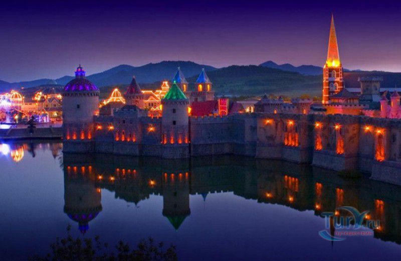 Средневековый замок, расположенный в самом центре озера, приглашает побродить по таинственным закоулкам старой крепости, услышать легенду о колдуне, посетить рыцарское ристалище и "полетать" на волшебной метле во время игры в квиддич. Для детей здесь построены воздушные горки Путь Летающего Дракона, мини железная дорога, тир, батут и настольный футбол.