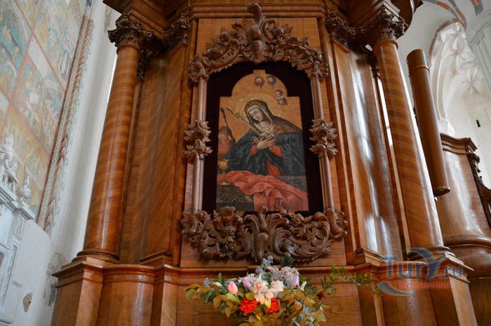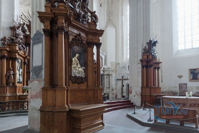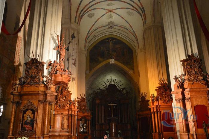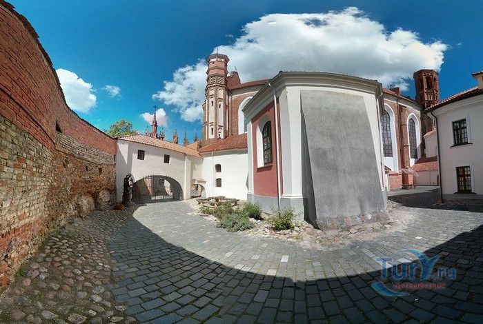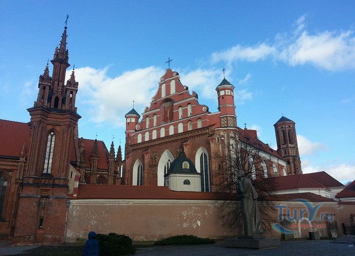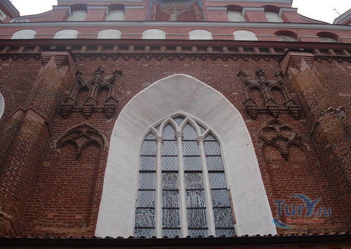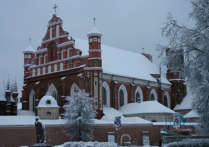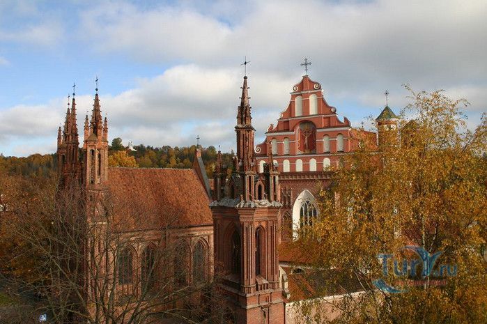 Костёл Святого Франциска Ассизского известен также как Костёл Святых Франциска и Бернардина или Бернардинский костёл, поскольку храм неоднократно разрушался, а затем отстраивался и освящался заново. Костёл был возведен в 1469 году монахами-францисканцами. Для строительства костёла и монастыря Святого Бернарда Сиенского монахам был выделен земельный участок, на котором раньше, согласно легенде, располагалось древнее языческое святилище. Первый храм был деревянным, в 1475 году он полностью сгорел во время пожара. В 1490 году рядом с костёлом Святой Анны был возведён новый каменный костёл. Из-за ошибок в конструкции, вскоре храм стал рушиться, появились трещины в стенах, и он был снесён. Третий по счёту костёл, во имя Франциска Ассизского, был построен в начале XVI века. С 1577 года до середины XVII века на средства Великого князя Литовского Стефана Батория, князя Николая Христофора Радзивилла и горожан Вильно восстанавливалось внутреннее убранство храма, полностью выгоревшее после очередного пожара. Были построены новые алтари и возведены часовни Святого Флориана, Святого Михаила, Петра Алькантрийского, реконструированы готические своды боковых нефов. В костёле был установлен орган, по свидетельствам современников, лучший в Великом княжестве Литовском. Богатый алтарь со скульптурным изображением Распятия был возведён на средства гетмана Яна Кароля Ходкевича и его супруги Софии Мелецкой. Новые потрясения для храма наступили во время военного конфликта 1654-1667 годов. Костёл и монастырь были разграблены, а сам костёл - сожжён. Погибли монахи и многие горожане, укрывавшиеся в монастыре. Восстановление храма финансировал гетман Великого княжества Литовского Михаил Пац, и в 1676 году состоялось освящение костёла во имя святых Франциска Ассизского и Бернардина Сиенского. В костёле был возведен ансамбль из 17 деревянных с позолоченной росписью алтарей, посвящённых страданиям Иисуса Христа, Пресвятой Деве Марии и святым Антонию Падуанскому, Бернардину и Франциску. На фасаде храма была написана фреска с изображённым на ней распятием, был реконструирован орган и перенесен в хоры пресвитерия. При подавлении восстания Тадеуша Костюшко в 1794 году, затем - во время военных действий 1812 года, костёл снова получил значительные разрушения. А в августе 1864 года, после подавления Январского восстания, монастырь упразднили, а Костёл Святых Франциска Ассизского и Бернардина Сиенского стал приходским. Орган был перенесен на балкон над входом костёла. Во второй половине XIX века алтари были украшены картинами и реликвиями из костёла тринитариев, расположенного на Антакальнисе. В 1974 году была построена колокольня в первоначальном архитектурном стиле костёла - готическом. Несмотря на все разрушения и реконструкции, в облике храма сохранился его первоначальный вид - готического храма с укреплёнными контфорсами, башнями и бойницами в северной стене здания. Элементы барокко и ренессанса были добавлены в более поздние периоды. Центральная часть главного фасада украшена стрельчатыми окнами и боковыми нишами с орнаментом. Интерьер костёла имеет 3 нефа одинаковой высоты, центральный - вдвое шире боковых. Неф переходит в более низкий пресвитерий, отделённый триумфальной аркой, и заканчивается гранёной апсидой. Пресвитерий предназначен для монахов, а основн